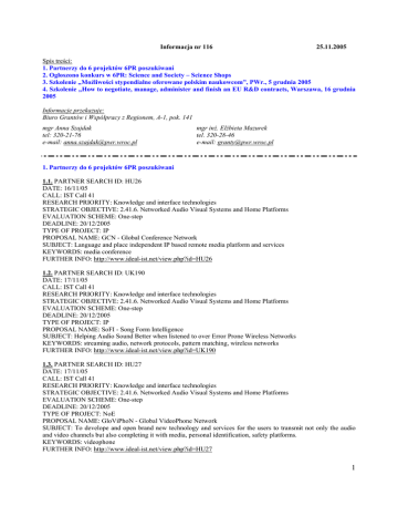 Informacja nr 116 25.11.2005 Spis treści: 1. Partnerzy do 6 projektów 6PR poszukiwani 2. Ogłoszono konkurs w 6PR: Science and Society – Science Shops 3. Szkolenie „Możliwości stypendialne oferowane polskim naukowcom”, PWr., 5 grudnia 2005 4. Szkolenie „How to negotiate, manage, administer and finish an EU R&D contracts, Warszawa, 16 grudnia 2005 Informacje przekazuje: Biuro Grantów i Współpracy z Regionem, A-1, pok. 141 mgr Anna Szajdak tel: 320-21-76 e-mail: [email protected] mgr inż. Elżbieta Mazurek tel. 320-28-46 e-mail: [email protected] 1. Partnerzy do 6 projektów 6PR poszukiwani 1.1. PARTNER SEARCH ID: HU26 DATE: 16/11/05 CALL: IST Call 41 RESEARCH PRIORITY: Knowledge and interface technologies STRATEGIC OBJECTIVE: 2.41.6. Networked Audio Visual Systems and Home Platforms EVALUATION SCHEME: One-step DEADLINE: 20/12/2005 TYPE OF PROJECT: IP PROPOSAL NAME: GCN - Global Conference Network SUBJECT: Language and place independent IP based remote media platform and services KEYWORDS: media conference FURTHER INFO: http://www.ideal-ist.net/view.php?id=HU26 1.2. PARTNER SEARCH ID: UK190 DATE: 17/11/05 CALL: IST Call 41 RESEARCH PRIORITY: Knowledge and interface technologies STRATEGIC OBJECTIVE: 2.41.6. Networked Audio Visual Systems and Home Platforms EVALUATION SCHEME: One-step DEADLINE: 20/12/2005 TYPE OF PROJECT: IP PROPOSAL NAME: SoFI - Song Form Intelligence SUBJECT: Helping Audio Sound Better when listened to over Error Prone Wireless Networks KEYWORDS: streaming audio, network protocols, pattern matching, wireless networks FURTHER INFO: http://www.ideal-ist.net/view.php?id=UK190 1.3. PARTNER SEARCH ID: HU27 DATE: 17/11/05 CALL: IST Call 41 RESEARCH PRIORITY: Knowledge and interface technologies STRATEGIC OBJECTIVE: 2.41.6. Networked Audio Visual Systems and Home Platforms EVALUATION SCHEME: One-step DEADLINE: 20/12/2005 TYPE OF PROJECT: NoE PROPOSAL NAME: GloViPhoN - Global VideoPhone Network SUBJECT: To develope and open brand new technology and services for the users to transmit not only the audio and video channels but also completing it with media, personal identification, safety platforms. KEYWORDS: videophone FURTHER INFO: http://www.ideal-ist.net/view.php?id=HU27 1 1.4. PARTNER SEARCH ID: IL181 DATE: 16/11/05 CALL: IST Call 41 RESEARCH PRIORITY: Knowledge and interface technologies STRATEGIC OBJECTIVE: 2.41.6. Networked Audio Visual Systems and Home Platforms EVALUATION SCHEME: One-step DEADLINE: 20/12/2005 TYPE OF PROJECT: IP PROPOSAL NAME: Mature-Multimedia SUBJECT: Innovative end-to-end audio-visual and multimedia handling over Internet/cellular networks. KEYWORDS: Sip, VOIP, cellular, multimedia, Nokia, HDTV, Broadcasting, RFC, Speech recognition FURTHER INFO: http://www.ideal-ist.net/view.php?id=IL181 1.5. PARTNER SEARCH ID: BY7 DATE: 14/11/05 CALL: IST Call 41 RESEARCH PRIORITY: Knowledge and interface technologies STRATEGIC OBJECTIVE: 2.41.6. Networked Audio Visual Systems and Home Platforms EVALUATION SCHEME: One-step DEADLINE: 20/12/2005 TYPE OF PROJECT: IP PROPOSAL NAME: V-PRO SUBJECT: High performance video processor creation with TV format videodata processing for the aim of an quality improvement of dynamic images KEYWORDS: Image Processing, Vide Data, Real Time Processing FURTHER INFO: http://www.ideal-ist.net/view.php?id=BY7 1.6. PARTNER SEARCH ID: BY6 DATE: 13/11/05 CALL: IST Call 41 RESEARCH PRIORITY: Knowledge and interface technologies STRATEGIC OBJECTIVE: 2.41.6. Networked Audio Visual Systems and Home Platforms EVALUATION SCHEME: One-step DEADLINE: 20/12/2005 TYPE OF PROJECT: IP PROPOSAL NAME: Interactive Video Conference (IVC) SUBJECT: The Interactive Video Conference project aims to design, develop and implement the video conferencing application prototype that allows to make communication between conferencing parties more flexible and reliable. The main problems to be addressed in the project are audio/video streams compression, data transfer using the IP networks, developing application for mobile participants using wireless networks, design and developing user interfaces and the protocols for interaction between participants and hosts. KEYWORDS: speech; audio; video; codecs; multimedia; ip telephony; conference FURTHER INFO: http://www.ideal-ist.net/view.php?id=BY6 2. Ogłoszono konkurs w 6PR: Science and Society – Science Shops Ogłoszono konkurs: FP6 - 2 SCIENCE AND SOCIETY * Title of the call: Science and Society - Science Shops - FP6 * Regions concerned: Member States EU, Associated candidate countries (Bulgaria, Romania, Turkey and Croatia), Associated States (Iceland, Israel, Liechtenstein, Norway and Switzerland), Organisations on the FP6 INCO, other countries under conditions. * Global budget: 1 million Euro * Closing date(s): March 30, 2006 * Priorities and financed activities: Science Shops: research for local civil society * Objectives: "Science shops" facilitate scientific communication and societal demand-driven sharing of knowledge with local civil society. It will show the international dimension of local problems and local needs for scientific research. Research Areas: Proximity problems: health, environment, consumers’ issues, social issues etc. 2 * Call text and all useful documents http://fp6.cordis.lu/index.cfm?fuseaction=UserSite.FP6DetailsCallPage&call_id=263 * Information: http://www.cordis.lu/science-society/ * Contact: The Science and Society Information Desk Directorate General Research SDME 07/84 B-1049 Brussels Fax: 32 2 296.58.53 [email protected] 3. Szkolenie „Możliwości stypendialne oferowane polskim naukowcom”, PWr., 5 grudnia 2005 Regionalne Centrum Informacji dla Naukowców we Wrocławiu (RCIN) serdecznie zaprasza na szkolenie „Możliwości stypendialne oferowane polskim naukowcom”, które odbędzie się w dniu 5 grudnia 2005 (poniedziałek) w sali 241, Politechnika Wrocławska, gmach główny (A-1), Wyb. Wyspiańskiego 27. Wstępny program: 10:00 – 10:30 10:30 – 12:00 12:00 – 