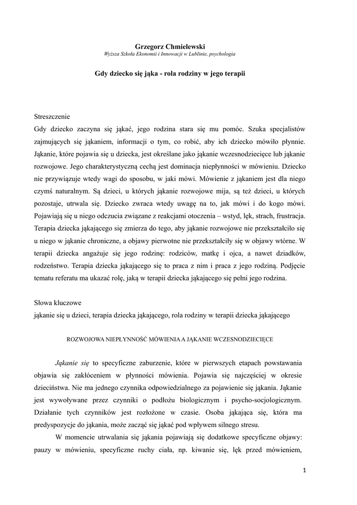 Grzegorz Chmielewski Wyższa Szkoła Ekonomii i Innowacji w Lublinie, psychologia Gdy dziecko się jąka - rola rodziny w jego terapii Streszczenie Gdy dziecko zaczyna się jąkać, jego rodzina stara się mu pomóc. Szuka specjalistów zajmujących się jąkaniem, informacji o tym, co robić, aby ich dziecko mówiło płynnie. Jąkanie, które pojawia się u dziecka, jest określane jako jąkanie wczesnodziecięce lub jąkanie rozwojowe. Jego charakterystyczną cechą jest dominacja niepłynności w mówieniu. Dziecko nie przywiązuje wtedy wagi do sposobu, w jaki mówi. Mówienie z jąkaniem jest dla niego czymś naturalnym. Są dzieci, u których jąkanie rozwojowe mija, są też dzieci, u których pozostaje, utrwala się. Dziecko zwraca wtedy uwagę na to, jak mówi i do kogo mówi. Pojawiają się u niego odczucia związane z reakcjami otoczenia – wstyd, lęk, strach, frustracja. Terapia dziecka jąkającego się zmierza do tego, aby jąkanie rozwojowe nie przekształciło się u niego w jąkanie chroniczne, a objawy pierwotne nie przekształciły się w objawy wtórne. W terapii dziecka angażuje się jego rodzinę: rodziców, matkę i ojca, a nawet dziadków, rodzeństwo. Terapia dziecka jąkającego się to praca z nim i praca z jego rodziną. Podjęcie tematu referatu ma ukazać rolę, jaką w terapii dziecka jąkającego się pełni jego rodzina. Słowa kluczowe jąkanie się u dzieci, terapia dziecka jąkającego, rola rodziny w terapii dziecka jąkającego ROZWOJOWA NIEPŁYNNOŚĆ MÓWIENIA A JĄKANIE WCZESNODZIECIĘCE Jąkanie się to specyficzne zaburzenie, które w pierwszych etapach powstawania objawia się zakłóceniem w płynności mówienia. Pojawia się najczęściej w okresie dzieciństwa. Nie ma jednego czynnika odpowiedzialnego za pojawienie się jąkania. Jąkanie jest wywoływane przez czynniki o podłożu biologicznym i psycho-socjologicznym. Działanie tych czynników jest rozłożone w czasie. Osoba jąkająca się, która ma predyspozycje do jąkania, może zacząć się jąkać pod wpływem silnego stresu. W momencie utrwalania się jąkania pojawiają się dodatkowe specyficzne objawy: pauzy w mówieniu, specyficzne ruchy ciała, np. kiwanie się, lęk przed mówieniem, 1 kształtują się reakcje unikania wypowiedzi słownych w sytuacji ekspozycji społecznej. Wraz z rozwojem dodatkowych specyficznych objawów jąkania, mogą zanikać objawy pierwotne czyli niepłynności w mowie (por. Adamczyk, 1998, Szamburski, 1996, Kałużyński, 1971). Międzynarodowa Klasyfikacja Chorób i Problemów Zdrowotnych ICD-10 jąkanie umiejscowiła w kategorii: „zaburzenia rozwoju psychoruchowego dziecka”, w podkategorii F-98: „inne zaburzenia zachowania i emocji rozpoczynające się w dzieciństwie i w wieku młodzieńczym” (World Health Organization, 1992; za: Humeniuk, 2012, s. 14). Jąkanie jest definiowane jako zaburzenie objawiające się przeciąganiem, powtarzaniem sylab, dźwięków, słów, robieniem pauz, zaburzeniem rytmu mowy. Jąkanie sprawia, że osoba która zna sens swojej wypowiedzi, nie potrafi przekazać go. Klasyfikacja Zaburzeń Psychicznych Amerykańskiego Towarzystwa Psychiatrycznego jąkanie kategoryzuje pod symbolem 307,0. Jąkanie to zaburzenie płynności mówienia na skutek objawów takich jak: powtarzanie, przeciąganie, przerwy w mówieniu (Bogdanowicz, 2003; za: Humeniuk, 2012). Początki jąkania u większości osób sięgają okresu dzieciństwa. Dziecko, u którego kompetencje językowe i artykulacyjne nie są jeszcze wykształcone, może mieć predyspozycje do jąkania. Szybkie tempo mówienia, kształtujący się słuch fonologiczny, trudności w artykulacji głosek, mogą objawić się niepłynnościami w mówieniu. Opisane objawy nie świadczą o tym, że dziecko jąka się. Z. Tarkowski (1997) na polskim gruncie wprowadził pojęcie rozwojowej niepłynności mówienia i jąkania wczesnodziecięcego. Jąkanie wczesnodziecięce to patologiczna niepłynność mówienia pojawiająca się w wieku przedszkolnym lub wcześniej. Rozwojowa niepłynność mówienia to normalna, rozwojowa niepłynność mowy (Tarkowski, Humeniuk, Dunaj, 2011). Rozwojowa niepłynność mówienia objawia się zaburzeniem w trakcie przejścia od jednej części wypowiedzi do drugiej. Zostaje zakłócone tempo, rytm mowy (Tarkowski 1997). W jąkaniu wczesnodziecięcym dominuje powtarzanie i przeciąganie głosek, blokowanie się. W rozwojowej niepłynności mówienia częściej jest widoczne powtarzanie całych słów, fraz. Jąkanie wczesnodziecięce i rozwojowa niepłynność mówienia różnią się proporcją objawów. W jąkaniu wczesnodziecięcym objawów jest więcej (Ambrose, Yari, 1999; za: Tarkowski i in., 2011). Przyjmuje się, że wskaźnikiem pojawienia się jąkania wczesnodziecięcego jest proporcja liczby niepłynności w mówieniu. Obecnie przyjmuje się, że jest to 3% niepłynności (Tarkowski i in., 2011). KONCEPCJA JĄKANIA JAKO NIEUŚWIADOMIONEGO LĘKU 2 K. Szamburski sformułował koncepcję, zgodnie z którą jąkanie się jest objawem nerwicy. Poprzez nerwicę rozumie zespół zachowań i przeżywanych emocji o charakterze przystosowawczym. U podłoża nerwicy leży nieuświadomiony lęk, który swoje korzenie ma w dzieciństwie. Osoba jąkająca się rozładowuje odczuwany lęk, odwraca od niego uwagę (Szamburski, 1996). Pojawianie się jąkania jako objawu nerwicy jest wynikiem zadziałania kilku czynników. Szamburski skategoryzował je i wskazał trzy rodzaje: czynniki dysponujące do pojawienia się jąkania, czynniki wzmacniające jąkanie, czynniki utrwalające jąkanie. Określenie tych czynników jest istotne szczególnie w diagnozie jąkania. Czynniki dysponujące wskazują na to, że u dziecka może pojawić się jąkanie. Do tej grupy czynników zalicza się: zaburzenia wynikające z przebiegu ciąży i porodu, nieprawidłową lateralizację mózgu, dziedziczność, predyspozycje genetyczne do jąkania się, opóźnio