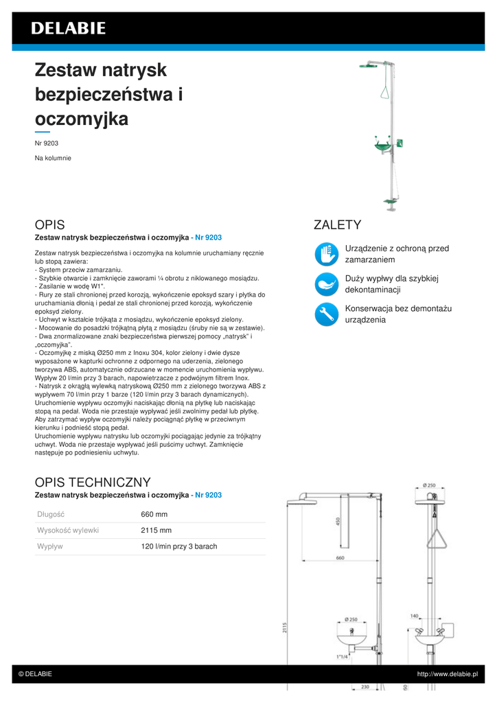 Zestaw natrysk bezpieczeństwa i oczomyjka Nr 9203 Na kolumnie OPIS ZALETY Zestaw natrysk bezpieczeństwa i oczomyjka - Nr 9203 Zestaw natrysk bezpieczeństwa i oczomyjka na kolumnie uruchamiany ręcznie lub stopą zawiera: - System przeciw zamarzaniu. - Szybkie otwarcie i zamknięcie zaworami ¼ obrotu z niklowanego mosiądzu. - Zasilanie w wodę W1". - Rury ze stali chronionej przed korozją, wykończenie epoksyd szary i płytka do uruchamiania dłonią i pedał ze stali chronionej przed korozją, wykończenie epoksyd zielony. - Uchwyt w kształcie trójkąta z mosiądzu, wykończenie epoksyd zielony. - Mocowanie do posadzki trójkątną płytą z mosiądzu (śruby nie są w zestawie). - Dwa znormalizowane znaki bezpieczeństwa pierwszej pomocy „natrysk” i „oczomyjka”. - Oczomyjkę z miską Ø250 mm z Inoxu 304, kolor zielony i dwie dysze wyposażone w kapturki ochronne z odpornego na uderzenia, zielonego tworzywa ABS, automatycznie odrzucane w momencie uruchomienia wypływu. Wypływ 20 l/min przy 3 barach, napowietrzacze z podwójnym filtrem Inox. - Natrysk z okrągłą wylewką natryskową Ø250 mm z zielonego tworzywa ABS z wypływem 70 l/min przy 1 barze (120 l/min przy 3 barach dynamicznych). Uruchomienie wypływu oczomyjki naciskając dłonią na płytkę lub naciskając stopą na pedał. Woda nie przestaje wypływać jeśli zwolnimy pedał lub płytkę. Aby zatrzymać wypływ oczomyjki należy pociągnąć płytkę w przeciwnym kierunku i podnieść stopą pedał. Uruchomienie wypływu natrysku lub oczomyjki pociągając jedynie za trójkątny uchwyt. Woda nie przestaje wypływać jeśli puścimy uchwyt. Zamknięcie następuje po podniesieniu uchwytu. Urządzenie z ochroną przed zamarzaniem Duży wypłwy dla szybkiej dekontaminacji Konserwacja bez demontażu urządzenia OPIS TECHNICZNY Zestaw natrysk bezpieczeństwa i oczomyjka - Nr 9203 Długość 660 mm Wysokość wylewki 2115 mm Wypływ 120 l/min przy 3 barach © DELABIE http://www.delabie.pl