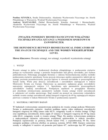Paulina SZYSZKA, Studia Doktoranckie, Akademia Wychowania Fizycznego im. Józefa Piłsudskiego w Warszawie, Wydział Wychowania Fizycznego Andrzej MASTALERZ, Zakład Biomechaniki, Katedra Anatomii i Biomechaniki, Akademia Wychowania Fizycznego im. Józefa Piłsudskiego w Warszawie, Wydział Wychowania Fizycznego ZWIĄZEK POMIĘDZY BIOMECHANICZNYMI WSKAŹNIKI TECHNIKI RWANIA SZTANGI A POZIOMEM SPORTOWYM ZAWODNICZEK THE DEPENDENCE BETWEEN BIOMECHANICAL INDICATORS OF THE SNATCH TECHNIQUE AND THE WOMEN WEIGHTLIFTERS LEVEL Słowa kluczowe: Rwanie sztangi, tor sztangi, wysokość wyniesienia sztangi 1. WSTĘP Rwanie sztangi to jedna z konkurencji dwuboju olimpijskiego w podnoszenia ciężarów polega na wyniesieniu sztangi z pomostu bezpośrednio nad głowę zawodnika, jest ruchem jednotaktowym. Dokonując przeglądu literatury z zakresu biomechanicznej analizy techniki podnoszenia ciężarów spotykamy liczne pozycje dotyczące analizy parametrów takich jak tor sztangi, poziome przemieszczenia, pozycje kątowe w stawach zawodnika w poszczególnych fazach ruchu. Wiele prac dotyczy zawodniczek i zawodników startujących w trakcie Mistrzostw Świata czy Europy. Opisywane są parametry najlepszej grupy zawodników najczęściej zajmujących miejsca 1-5. Spotykamy opis parametrów poszczególnych zawodników rzadziej zawodniczek. Pomijanym aspektem w przeglądzie literatury jest określenie zróżnicowania parametrów techniki rwania sztangi wśród zawodniczek w zależności od wyniku sportowego. Stąd zrodził się pomysł na zestawienie wskaźników techniki rwania sztangi zawodniczek jednej kategorii wagowej do 69 kg zajmujących miejsce pierwsze i ostatnie w trakcie Mistrzostw Świata w podnoszeniu ciężarów. 2. MATERIAŁ I METODY BADAŃ W badaniach wykorzystano zarejestrowane podejścia do rwania sztangi podczas Mistrzostw Świata w podnoszenia ciężarów. Analizie poddano zapisy video najlepszej zawodniczki kategorii wagowej do 69kg (masa ciała 68.51, osiągnięty wynik w rwaniu sztangi 123kg) oraz najsłabszej zawodniczki, która zajęła 25 miejsce w kategorii wagowej do 69 kg (masa ciała 68.61, osiągnięty wynik w rwaniu sztangi 79kg). Do analizy wykorzystano podejścia z maksymalnym ciężarem zaliczonym werdyktem sędziowskim w trakcie zawodów. Podejścia rejestrowano za pomocą dwóch kamer PAL z częstotliwością 50 Hz, które następnie poddano cyfrowej obróbce za pomocą systemu APAS 2000. Kamery ustawione zostały w odległości 4 metrów od pomostu pod kątem 450, zachowując kąt 90° pomiędzy XI Konferencja Naukowa Majówka Młodych Biomechaników im. prof. Dagmary Tejszerskiej s. 126 nimi. Przekształcenia obrazu do postaci cyfrowej (DLT) oraz skalowania dokonano z wykorzystaniem prostopadłościanu składającego się z 8 punktów. Ocenie podlegały parametry sztangi takie jak: tor sztangi i prędkość sztangi, oraz parametry układu zawodnik-sztanga: poziome przemieszczenia sztangi i wysokość wyniesienia sztangi. 3. WYNIKI Analizowane podejścia do rwania sztangi pierwszej i ostatniej zawodniczki Mistrzostw Świata wskazują zróżnicowanie średniej prędkości sztangi na poziomie 0,03 m/s. Różnica maksymalnej prędkości w przypadku analizowanych podejść wynosi 15%. Wysokość przewyższenia sztangi pierwszej zawodniczki wynosiła 12,7cm natomiast u ostatniej 30 cm. 4. PODSUMOWANIE Poziom sportowy zawodniczek podnoszenia ciężarów ma wpływ na analizowane wskaźniki biomechaniczne rwania sztangi. Można określić te wskaźniki, które są na zbliżonym poziomie w przypadku Mistrzyni Świata jak i zawodniczki, która zajęła ostatnie miejsce, przykładowo średnia prędkość sztangi. Wysoki poziom sportowy zawodniczek trenujących podnoszenie ciężarów charakteryzuje wysokość przewyższenia sztangi. Mistrzyni Świata w kategorii wagowej do 69kg osiąga przewyższenie 12,7 cm, natomiast zawodniczka sklasyfikowana na ostatnim miejscu 30cm, co świadczy o poziomie wyszkolenia technicznego. Im niższa wartość przewyższenia tym technika jest skuteczniejsza. 5. [1] [2] LITERATURA Hoover, Donald L., Kelvin M. Carlton, Bryan K. Christensens, and Carole J. Zebas.: Biomechanical Analysis of women weightlifters during the snatch, Journal of Strength & Conditioning Research, 2006 Ikeda, Yusuke; Jinji, Tsutomu; Matsubayashi, Takeo; Matsuo, Akifumi; Inagaki, Eiichi; Takemata, Toshiro; Kikuta, Miyoji.: Comparison of the Snatch Technique for Female Weightlifters at the 2008 Asian Championships, Journal of Strength & Conditioning Research: Vol.26 - Issue 5 - p 1281–1295, 2012