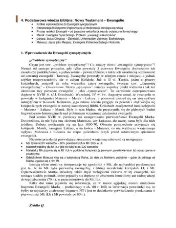 4. Podstawowa wiedza biblijna: Nowy Testament – Ewangelie • • • • • • Krótkie wprowadzenie do Ewangelii synoptycznych Interpretacja historyczno-lingwistyczna a interpretacja kierująca się wiarą Proces redakcji Ewangelii – od ipsissima verba/facta Iesu do ostatecznej formy księgi Marek: Ewangelia Syna BoŜego. Problem „urwanego zakończenia” Łukasz: Jezus Chrystus – Zbawiciel. Uniwersalizm zbawczy. Eschatologia. Mateusz: Jezus jako Mesjasz. Ewangelia Królestwa BoŜego i Kościoła. 1. Wprowadzenie do Ewangelii synoptycznych „Problem synoptyczny” Czym jest tzw. „problem synoptyczny”? Co znaczy słowo „ewangelie synoptyczne”? Niemal od samego początku, gdy tylko powstały 3 pierwsze Ewangelie dostrzeŜono ich zasadnicze podobieństwo, a jednocześnie – pewne róŜnice, a takŜe ich zasadniczą odmienność od czwartej ewangelii - Janowej. Ewangelie powstały w róŜnym czasie i miejscu, a jednak szybko rozpowszechniły się w całym Kościele. JuŜ w II w. Tacjan, jeden z pisarzy kościelnych, zestawił ze sobą wszystkie cztery ewangelie, tworząc tzw. „harmonię ewangeliczną” – Diatessaron. Słowo „syn-opsis” oznacza wspólny punkt widzenia i tak teŜ określono trzy pierwsze ewangelie – jako „synoptyczne”. To określenie zaproponowano dopiero w XVIII w. (J.J. Griesbach). Wcześniej, IV w. św. Augustyn uznał, Ŝe ewangelie te powstały w kolejności Mateusz – Marek - Łukasz, a poniewaŜ cieszył się on niezwykłym autorytetem w Kościele łacińskim, jego zdanie zostało przyjęte za pewnik i stąd wzięła się kolejność tych ewangelii w naszej kanonicznej Biblii. Griesbach zasugerował inną kolejność – Mateusz – Łukasz – Marek. Była to teza błędna, ale przyczyniła się do głębszych badań lingwistyczno-historycznych nad problemem wzajemnej zaleŜności ewangelii. Pod koniec XVIII w. pierwszy raz zasugerowano pierwszeństwo Ewangelii Marka. DostrzeŜono, Ŝe nie była ona skrótem Mateusza, czy Łukasza, ale raczej sama była dla nich źródłem. Debata rozciągnęła się na lata 1830-70. Obecnie powszechnie przyjmuje się kolejność: Marek, następnie Łukasz, a na końcu - Mateusz, co nie wyklucza wzajemnego wpływu Mateusza i Łukasza na etapie pośrednim (czyli przed ostatecznym spisaniem ewangelii). Niektóre przesłanki pozwalające zrozumieć wzajemną zaleŜność są następujące: • • • • Mk zawiera 661 wersetów – 80% powtórzonych w Mt i 65% w Łk Materiał wspólny dla Mt i Łk (ale nie Mk) to ok. 220 wersetów Materiał z Mk pojawia się w Mt i Łk w podobnej kolejności (z pewnymi przestawieniami lub opuszczeniami powtórzeń) Gdziekolwiek Mateusz mija się z kolejnością Marka, Łk idzie za Markiem; podobnie – gdzie Łk odbiega od Marka, zgadza się z nim Mt. Istnieją róŜne moŜliwe interpretacje tej zgodności z Mk, ale najbardziej przekonująca jest ta, Ŝe to Mk była pierwotną ewangelią, z której niezaleŜnie korzystali Łk i Mt. O pierwszeństwie Marka świadczy takŜe myśl teologiczna zawarta w tej ewangelii, nie nosząca śladów polemik, które pojawiły się dopiero po zburzeniu Jerozolimy ani Ŝadnej aluzji do tego zburzenia (70 r.), w przeciwieństwie do Mt i Łk. Kilka dni temu pojawiła się informacja, Ŝe w masce egipskiej mumii znaleziono fragment Ewangelii Marka – pochodzący z ok. 80 r. Jeśli ta informacja potwierdzi się, to byłby to najstarszy znaleziony fragment NT i jest to dodatkowe potwierdzenie przekonania o pierwotności Mk (Łk i Mt powstały po 80 r.). Źródło Q Obecność podobnych fragmentów u Łk i Mt moŜna tłumaczyć róŜnie, np. wzajemnymi wpływami, wcześniejszą tradycją ustną niespisaną przez Mk, a spisaną przez Łk i Mt. Jednak podobieństwo i charakter tych fragmentów wskazują, Ŝe chodzi o coś więcej: o źródło spisane, które w odróŜnieniu od Mk, koncentrującego się na czynach Jezusa, skupiło się na Jego mowach. Nie jest to tylko hipoteza oparta na spekulacji. Papiasz, biskup Hierapolis, pisząc ok. 130 r. na temat Ewangelii Mateusza wspomina o wcześniejszym ta logia (czyli słowa) – czyli spisanym zbiorze mów Pańskich. Zbiór ten w biblistyce określamy jako źródło Q (od niemieckiego Quelle). Interesujące, Ŝe tekst Q w „czystszej” (tj. mniej przeredagowanej postaci) znajdujemy u Łukasza. Jest to w ogóle cecha charakterystyczna Łukasza, odróŜniająca go od Mateusza, Ŝe nie stara się wygładzić tekstu, który otrzymał z wcześniejszej tradycji. Mateusz natomiast w wielu miejscach „oszlifowuje” tekst, tak aby bardziej pasował do jego teologii czy koncepcji redakcyjnej danego fragmentu. Widać to takŜe we fragmentach otrzymanych od Marka Przykład: Mateusza 19:16 A oto Łukasza 18:18 Zapytał Go Marka 10:17 Gdy wybierał się w drogę, podszedł do Niego pewien pewien zwierzchnik: przybiegł pewien człowiek i zapytał: Nauczycielu dobry, co mam Nauczycielu, co dobrego mam czynić, aby osiągnąć Ŝycie człowiek i upadłszy przed Nim na kolana, czynić, aby otrzymać Ŝycie wieczne? 19 Jezus mu wieczne? 17 Odpowiedział pytał Go: Nauczycielu odpowiedział: Czemu dobry, co mam czynić, mu: Dlaczego Mnie pytasz o nazywasz Mnie dobrym? Nikt aby osiągnąć Ŝycie dobro? Jeden tylko jest Dobry. nie jest dobry, tylko sam Bóg. wieczne? 18 Jezus mu A jeśli chcesz osiągnąć Ŝycie, rzekł: Czemu nazywasz zachowaj przykazania. Mnie dobrym? Nikt nie jest dobry, tylko sam Bóg. Zwróćmy uwagę, jakiego zabiegu dokonał tu Mateusz. Z oryginalnego Markowego tekstu wynika, Ŝe człowiek zwrócił się do Jezusa „Nauczycielu dobry”. Jezus nie zganił go, ale zapytał, dlaczego nazywa go „dobrym”, skoro tylko sam Bóg moŜe być uznany za dobrego. W słowach Jezusa ukryta więc była pewna dwuznaczność – wszedł w sposób myślenia rozmówcy i ukazał jego niekonsekwencję, a jednocześnie nie zaprzeczył, Ŝe faktycznie naleŜy mu się to określenie (ale nie dlatego, Ŝ