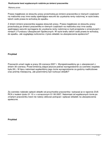Rozliczenie kwot wypłaconych rodzinie po śmierci pracownika Wpisany przez Prawa majątkowe ze stosunku pracy przechodzą po śmierci pracownika w równych częściach na małżonka oraz inne osoby spełniające warunki do uzyskania renty rodzinnej; w razie braku takich osób prawa te wchodzą do spadku. Z dniem śmierci pracownika wygasa stosunek pracy. Prawa majątkowe ze stosunku pracy przechodzą po śmierci pracownika w równych częściach na małżonka oraz inne osoby spełniające warunki wymagane do uzyskania renty rodzinnej w myśl przepisów o emeryturach i rentach z Funduszu Ubezpieczeń Społecznych. W razie braku takich osób prawa te wchodzą do spadku. Jak wyglądają rozliczenia z tytułu składek na ubezpieczenia społeczne? Przykład Pracownik umarł nagle w pracy 29 czerwca 2007 r. Wyrejestrowaliśmy go z ubezpieczeń z dniem 30 czerwca. Przed śmiercią zdążył jeszcze pobrać wynagrodzenie za czerwiec (wypłata była 28.). W lipcu natomiast wypłaciliśmy jego żonie wynagrodzenie za godziny nadliczbowe oraz premię miesięczną. Jak powinniśmy byli rozliczyć składki? Za czerwiec należało opłacić składki od przychodów pracownika i wykazać je w raporcie ZUS RCA z kodem tytułu 01 10 x x oznaczonym 01 06 2007. Natomiast od wypłaconych żonie po zmarłym pracowniku kwot nie należy obliczać potrącać i opłacać składek na ubezpieczenia społeczne. Przykład 1/3 Rozliczenie kwot wypłaconych rodzinie po śmierci pracownika Wpisany przez Pracownik zmarł 15 czerwca 2007 r. Po jego śmierci w lipcu wypłaciliśmy żonie wynagrodzenie za okres 1-10 czerwca oraz zasiłek chorobowy od 11 do 15 czerwca. Jak należało ten zasiłek rozliczyć? Jakie dokumenty trzeba było złożyć za lipiec do ZUS i jakie składki opłacić? Należało złożyć raport ZUS RSA z kodem 30 00 x x i identyfikatorem 01 07 2007, w którym trzeba było rozliczyć wypłacony zasiłek chorobowy, wpisując w nim dane zmarłego pracownika. Ponieważ wynagrodzenia za pracę nie pobrał pracownik, lecz jego żona, nie należało od tego wynagrodzenia obliczać, potrącać i opłacać składek na ubezpieczenia społeczne. Podstawa prawna: - rozporządzenie Ministra Pracy i Polityki Socjalnej z 18 grudnia 1998 r. w sprawie szczegółowych zasad ustalania podstawy wymiaru składek na ubezpieczenia emerytalne i rentowe (Dz.U.nr 161, poz.1106 ze zm.), - paragraf 3 ust.7 rozporządzenia Rady Ministrów z 30 grudnia 1998 r. w sprawie szczegółowych zasad i trybu postępowania w sprawach rozliczania składek, wypłaconych zasiłków z ubezpieczeń chorobowego i wypadkowego, zasiłków rodzinnych pielęgnacyjnych i wychowawczych oraz kolejności zaliczania wpłat na poszczególne fundusze (Dz.U. nr 165, poz.1197 ze zm.). 2/3 Rozliczenie kwot wypłaconych rodzinie po śmierci pracownika Wpisany przez Anna Jaworska Specjalista w zakresie ubezpieczeń społecznych. 3/3