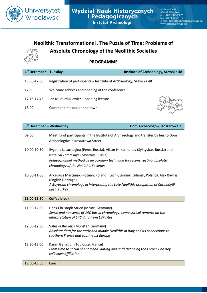 Neolithic Transformations I. The Puzzle of Time: Problems of Absolute Chronology of the Neolithic Societies PROGRAMME 4th December – Tuesday Institute of Archaeology, Szewska 48 15:30-17:00 Registration of participants – Institute of Archaeology, Szewska 48 17:00 Welcome address and opening of the conference 17:15-17:45 Jan M. Burdukiewicz – opening lecture 18:00 Common time out on the town 5th December – Wednesday Dom Archeologów, Koszarowa 3 09:00 Meeting of participants in the Institute of Archaeology and transfer by bus to Dom Archeologów in Koszarowa Street 10:00-10:30 Evgenia L. Lachagina (Perm, Russia), Viktor N. Karmanov (Syktyvkar, Russia) and Nataliya Zaretskaya (Moscow, Russia) Palaeochannel method as an auxiliary technique for reconstructing absolute chronology of the Neolithic Societies 10:30-11:00 Arkadiusz Marciniak (Poznań, Poland), Lech Czerniak (Gdańsk, Poland), Alex Bayliss (English Heritage) A Bayesian chronology in interpreting the Late Neolithic occupation of Çatalhöyük East, Turkey 11:00-11:30 Coffee break 11:30-12:00 Hans-Christoph Strien (Mainz, Germany) Sense and nonsense of 14C-based chronology: some critical remarks on the interpretation of 14C data from LBK sites 12:00-12:30 Valeska Becker, (Münster, Germany) Absolute data for the early and middle Neolithic in Italy and its connections to southern France and south-east Europe 12:30-13:00 Karim Gernigon (Toulouse, France) From time to social phenomena: dating and understanding the French Chassey collective affiliation 13:00-15:00 Lunch 15:00-15:30 Alex Gibson (Bradford, UK) Creating a Middle Neolithic in Britain 15:30-16:00 Gleser Ralf (Münster, Germany) Timescales and stilistic tendencies in the Neolithic Landscapes Between the rivers Moselle and Morava – Problems of synchronization 16:00-16:30 Coffee break 16:30-17:00 Mirosław Furmanek, Mateusz Krupski (Wrocław, Poland) When were the ditches dug? The problems of absolute dating of the Neolithic enclosures in Central Europe 17:00-17:30 Ihar Yazepenka (Minsk, Belarous) Chronology of the Neolithic Cultures of the Upper Dnieper Basin 17:30-18:00 Poster session 18:00-21:00 The wine reception within the conference venue (Koszarowa 3) 6th December Thursday 09:00 Meeting of participants in the Institute of Archaeology and transfer by bus to Dom Archeologów in Koszarowa Street 10:00-10:30 Marek Nowak (Kraków, Poland) Do 14C dates always turn into an absolute chronology? The case of the middle Neolithic in western Lesser Poland 10:30-11:00 Tomasz Chmielewski (Wrocław, Poland) What about cord? Chronology of corded-ornamented pottery in the South-Eastern Group of the Funnel Beaker Culture 11:00-11:30 Coffee break 11:30-12:00 Kamil Karski, Dariusz Król, Małgorzata Rybicka (Rzeszów, Poland) The chronology of the Funnel Beaker Culture settlements in the light of discoveries at the Site 3 in Pawłosiów, podkarpackie Voivodship 12:00-12:30 Ewa Dreczko (Wrocław, Poland) Radiocarbon chronology of the Funnel Beaker Culture in Lower Silesia 12:30-13:00 Agnieszka Przybył (Wrocław, Poland) Is it possible? The premises and controversies over the radiocarbon dating of final stages of the Funnel Beaker Culture in Polish Lowland Dom Archeologów, Koszarowa 3 13:00-15:00 Lunch 15:00-15:30 Oleksandr Pozikhovskyi (Ostrog, Ukraine), Dariusz Król, Małgorzata Rybicka (Rzeszów, Poland) Some aspects of chronological relations between the Tripolye Culture and the Funnel Beaker Culture in eastern Volhynia. New discoveries at the Site "Podobanka" in Nowomalin, Rivne Province 15:30-16:00 Piotr Włodarczak (Kraków, Poland) What is and what should never be. Remarks on the radiocarbon examination of the Middle-, Late- and Final Neolithic in southern Poland 16:00-16:30 Ł. Pospieszny (Gothenburg, Sweden), J. Sobieraj (Olsztyn, Poland) P. Iwanicki, A. Waluś, D. Manasterski, J. Okulicz-Kozaryn (Warszawa, Poland) Societies with corded ware between the Vistula and the Neman rivers. A chronometric perspective 16:30-17:00 Coffee break 17:00-18:00 Final discussion 7th December Friday 10:00 A guided tour around Wrocław