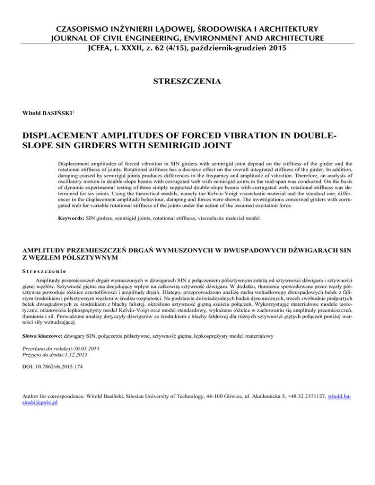 CZASOPISMO INŻYNIERII LĄDOWEJ, ŚRODOWISKA I ARCHITEKTURY JOURNAL OF CIVIL ENGINEERING, ENVIRONMENT AND ARCHITECTURE JCEEA, t. XXXII, z. 62 (4/15), październik-grudzień 2015 STRESZCZENIA Witold BASIŃSKI1 DISPLACEMENT AMPLITUDES OF FORCED VIBRATION IN DOUBLESLOPE SIN GIRDERS WITH SEMIRIGID JOINT Displacement amplitudes of forced vibration in SIN girders with semirigid joint depend on the stiffness of the girder and the rotational stiffness of joints. Rotational stiffness has a decisive effect on the overall integrated stiffness of the girder. In addition, damping caused by semirigid joints produces differences in the frequency and amplitude of vibration. Therefore, an analysis of oscillatory motion in double-slope beams with corrugated web with semirigid joints in the mid-span was conducted. On the basis of dynamic experimental testing of three simply supported double-slope beams with corrugated web, rotational stiffness was determined for six joints. Using the theoretical models, namely the Kelvin-Voigt viscoelastic material and the standard one, differences in the displacement amplitude behaviour, damping and forces were shown. The investigations concerned girders with corrugated web for variable rotational stiffness of the joints under the action of the assumed excitation force. Keywords: SIN girders, semirigid joints, rotational stiffness, viscoelastic material model AMPLITUDY PRZEMIESZCZEŃ DRGAŃ WYMUSZONYCH W DWUSPADOWYCH DŹWIGARACH SIN Z WĘZŁEM PÓŁSZTYWNYM Streszczenie Amplitudy przemieszczeń drgań wymuszonych w dźwigarach SIN z połączeniem półsztywnym zależą od sztywności dźwigara i sztywności giętej węzłów. Sztywność giętna ma decydujący wpływ na całkowitą sztywność dźwigara. W dodatku, tłumienie spowodowane przez węzły półsztywne powoduje różnice częstotliwości i amplitudy drgań. Dlatego, przeprowadzono analizę ruchu wahadłowego dwuspadowych belek z falistym środnikiem i półsztywnym węzłem w środku rozpiętości. Na podstawie doświadczalnych badań dynamicznych, trzech swobodnie podpartych belek dwuspadowych ze środnikiem z blachy falistej, określono sztywność giętną sześciu połączeń. Wykorzystując materiałowe modele teoretyczne, mianowicie lepkosprężysty model Kelvin-Voigt oraz model standardowy, wykazano różnice w zachowaniu się amplitudy przemieszczeń, tłumienia i sił. Prowadzone analizy dotyczyły dźwigarów ze środnikiem z blachy fałdowej dla różnych sztywności giętych połączeń poniżej wartości siły wzbudzającej. Słowa kluczowe: dźwigary SIN, połączenia półsztywne, sztywność giętna, lepkosprężysty model materiałowy Przesłano do redakcji:30.05.2015 Przyjęto do druku:1.12.2015 DOI: 10.7862/rb.2015.174 Author for correspondence: Witold Basiński, Silesian University of Technology, 44-100 Gliwice, ul. Akademicka 5, +48 32 2371127, [email protected] Anna BAZAN-KRZYWOSZAŃSKA1 Maria MRÓWCZYŃSKA2 Marta SKIBA3 BADANIA PERCEPCJI MIESZKAŃCÓW ZIELONEJ GÓRY – MAPY MENTALNE Artykuł przedstawia próbę zwrócenia uwagi na elementy kompozycji urbanistycznej miasta Zielona Góra, które są ważne dla jej mieszkańców. Badania percepcji umożliwiającą określenie i hierarchizację elementów przestrzennych miasta. Jako metodę badawczą przyjęto mapy mentalne tworzone przez mieszkańców. Miasto przedstawiane spontanicznie w formie graficznej, w skojarzeniach, wyróżniających elementy przestrzeni miejskiej, jest powszechnie stosowaną techniką badań. Większa część elementów i obiektów urbanistycznej kompozycji miasta powtarzała się na wszystkich mapach. Dzięki temu badaniu można określić co jest ważne i dostrzegane w przestrzeni przez jej użytkowników, a tym samym na co władze lokalne powinny zwrócić szczególną uwagę. Często wyróżniane obiekty są symbolami, punktami orientacyjnymi i elementami związanymi z wydarzeniami kulturowymi, z którymi społeczność lokalna się identyfikuje. Zapis urbanistyczny w lokalnych dokumentach planistycznych (mpzp) powinien te elementy wyróżniać i chronić. Słowa kluczowe: percepcja, obraz miasta, mapy mentalne, Zielona Góra PERCEPTIONS OF RESIDENTS CITY ZIELONA GÓRA - MENTAL MAPS Summary The article presents an attempt to draw attention to the elements of the urban composition city Zielona Gora, which are important for people. Perception study helps in identify and hierarchy of spatial elements of the city. The research method adopted mental maps which was created by the residents. The city presented in graphical case elements of urban space is a commonly used technique research. The greater part of the elements and main urban objects are repeated on all maps. With this test you can determine what is important and perceived in space by its users and what local authorities should pay particular attention. Very often it turned out that drawn by the respondents elements are symbolic objects or elements of related cultural events, important for the residents of the city. It shows that local urban planning documents (Master Plan) should stand and protect objects or spaces this elements . Keywords: perception, city image, mental maps, Zielona Gora Przesłano do redakcji:30.05.2015 Przyjęto do druku:10.01.2016 DOI: 10.7862/rb.2015.175 Autor do korespondencji: Anna Bazan-Krzywoszańska, Uniwersytet Zielonogórski, Wydział Budownictwa, Architektury i Inżynierii Środowiska, tel. 68 3282309, [email protected], 2 Maria Mrówczyńska, Uniwersytet Zielonogórski, Wydział Budownictwa, Architektury i Inżynierii Środowiska, tel. 68 3282309, [email protected], 3 Marta Skiba, Uniwersytet Zielonogórski, Wydział Budownictwa, Architektury i Inżynierii Środowiska, tel. 68 3282309, [email protected]. 1 Lidia BUDA-OŻÓG1 ANALIZA WPŁYWU KSZTAŁTOWANIA ZBROJENIA W TRACZY PROJEKTOWANEJ METODĄ ST Zgodnie z zaleceniami PN-EN-1992-1-1 stosowanie modeli ST jest szczególnie uzasadnione w obszarach dwuosiowego rozkładu napr