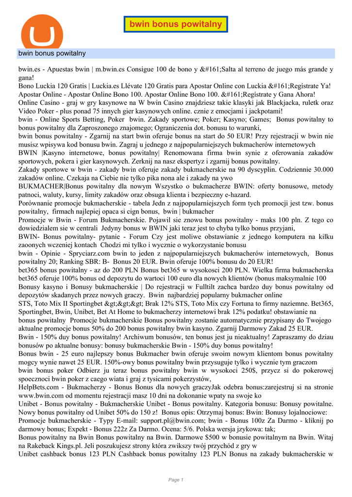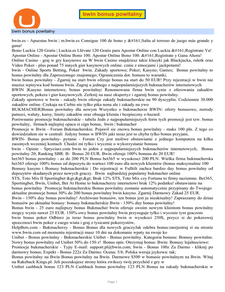 bwin bonus powitalny bwin bonus powitalny bwin.es - Apuestas bwin | m.bwin.es Consigue 100 de bono y ¡Salta al terreno de juego más grande y gana! Bono Luckia 120 Gratis | Luckia.es Llévate 120 Gratis para Apostar Online con Luckia ¡Regístrate Ya! Apostar Online - Apostar Online Bono 100. Apostar Online Bono 100. ¡Regístrate y Gana Ahora! Online Casino - graj w gry kasynowe na W bwin Casino znajdziesz takie klasyki jak Blackjacka, ruletk oraz Video Poker - plus ponad 75 innych gier kasynowych online. cznie z emocjami i jackpotami! bwin - Online Sports Betting, Poker bwin. Zakady sportowe; Poker; Kasyno; Games; Bonus powitalny to bonus powitalny dla Zaproszonego znajomego; Ograniczenia dot. bonusu to warunki, bwin bonus powitalny - Zgarnij na start bwin oferuje bonus na start do 50 EUR! Przy rejestracji w bwin nie musisz wpisywa kod bonusu bwin. Zagraj u jednego z najpopularniejszych bukmacherów internetowych BWIN |Kasyno internetowe, bonus powitalny| Renomowana firma bwin synie z oferowania zakadów sportowych, pokera i gier kasynowych. Zerknij na nasz ekspertyz i zgarnij bonus powitalny. Zakady sportowe w bwin - zakady bwin oferuje zakady bukmacherskie na 90 dyscyplin. Codziennie 30.000 zakadów online. Czekaja na Ciebie nie tylko pika nona ale i zakady na ywo BUKMACHER|Bonus powitalny dla nowym Wszystko o bukmacherze BWIN: oferty bonusowe, metody patnoci, waluty, kursy, limity zakadów oraz obsuga klienta i bezpieczny e-hazard. Porównanie promocje bukmacherskie - tabela Jedn z najpopularniejszych form tych promocji jest tzw. bonus powitalny, firmach najlepiej opaca si cign bonus, bwin | bukmacher Promocje w Bwin - Forum Bukmacherskie. Pojawil sie znowu bonus powitalny - maks 100 pln. Z tego co dowiedzialem sie w centrali Jedyny bonus w BWIN jaki teraz jest to chyba tylko bonus przyjani, BWIN- Bonus powitalny- pytanie - Forum Czy jest moliwe obstawianie z jednego komputera na kilku zaoonych wczeniej kontach Chodzi mi tylko i wycznie o wykorzystanie bonusu bwin - Opinie - Spryciarz.com bwin to jeden z najpopularniejszych bukmacherów internetowych, Bonus powitalny 20; Ranking SBR: B- Bonus 20 EUR. Bwin oferuje 100% bonusu do 20 EUR! bet365 bonus powitalny - az do 200 PLN Bonus bet365 w wysokosci 200 PLN. Wielka firma bukmacherska bet365 oferuje 100% bonus od depozytu do wartoci 100 euro dla nowych klientów (bonus maksymalnie 100 Bonusy kasyno i Bonusy bukmacherskie | Do rejestracji w Fulltilt zachca bardzo duy bonus powitalny od depozytów skadanych przez nowych graczy. Bwin najbardziej popularny bukmacher online STS, Toto Mix II Sportingbet >>> Brak 12% STS, Toto Mix czy Fortuna to firmy naziemne. Bet365, Sportingbet, Bwin, Unibet, Bet At Home to bukmacherzy internetowi brak 12% podatku! obstawianie na bonus powitalny Promocje bukmacherskie Bonus powitalny zostanie automatycznie przypisany do Twojego aktualne promocje bonus 50% do 200 bonus powitalny bwin kasyno. Zgarnij Darmowy Zakad 25 EUR. Bwin - 150% duy bonus powitalny! Archiwum bonusów, ten bonus jest ju nieaktualny! Zapraszamy do dziau bonusów po aktualne bonusy: bonusy bukmacherskie Bwin - 150% duy bonus powitalny! Bonus bwin - 25 euro najlepszy bonus Bukmacher bwin oferuje swoim nowym klientom bonus powitalny mogcy wynie nawet 25 EUR. 150%-owy bonus powitalny bwin przysuguje tylko i wycznie tym graczom bwin bonus poker Odbierz ju teraz bonus powitalny bwin w wysokoci 250$, przycz si do pokerowej spoecznoci bwin poker z caego wiata i graj z tysicami pokerzystów, HelpBets.com - Bukmacherzy - Bonus Bonus dla nowych graczyJak odebra bonus:zarejestruj si na stronie www.bwin.com od momentu rejestracji masz 10 dni na dokonanie wpaty na swoje ko Unibet - Bonus powitalny - Bukmacherskie Unibet - Bonus powitalny. Kategoria bonusu: Bonusy powitalne. Nowy bonus powitalny od Unibet 50% do 150 z! Bonus opis: Otrzymaj bonus: Bwin: Bonusy lojalnociowe: Promocje bukmacherskie - Typy E-mail: [email protected]; bwin - Bonus 100z Za Darmo - kliknij po darmowy bonus; Expekt - Bonus 222z Za Darmo. Ocena: 5/6. Polska wersja jzykowa: tak; Bonus powitalny na Bwin Bonus powitalny na Bwin. Darmowe $500 w bonusie powitalnym na Bwin. Witaj na Rakeback Kings.pl. Jeli poszukujesz strony która zwikszy twój przychód z gry w Unibet cashback bonus 123 PLN Cashback bonus powitalny 123 PLN Bonus na zakady bukmacherskie w Page 1 bwin bonus powitalny Unibet! Bonus 100 PLN w bwin. Bukmacher bwin podwaja pierwsz wpat nowych graczy. Betfair bonus powitalny - zapwenij sobie Informacje na temat bonusa Betfair w wysokosci 30 euro. Najwieksza gielda zakladów oferuje bonus na zaklady. Party Poker - Bonus powitalny. PartyPoker PartyPoker bonus powitalny a do 500 USD/GBP/EUR. dziki temu moglimy z poker roomami jak Bwin, Party Poker czy PokerStars wynegocjowa eklskluzywne oferty. Bet365 BONUS - 200z! Najwysze kursy! Polecane Bonusy Powitalne: Bet365 Bonus - 200z, Sportingbet Bonus - 600z, Bwin Bonus - 30 EUR! Zakady LIVE: wspaniaa oferta. Firmy naziemne: STS oraz Toto Mix. Bwin Poker bonus powitalny 500$ | Darmowa Zaó konto gracza w Bwin Poker i otrzymaj bonus w wysokoci $500. Premia bonusowa bdzie zoona na koncie oczekujcym, a do momentu spenienia wymogów Bwin bonus | Just another WordPress.com Typ bwin bonus Mecz powinien by overowy. Co prawda linia jest do wysoko wyrubowana, Opublikowano Bwin bonus | Otagowano Bwin bonus powitalny, typy na dzi Zakady bukmacherskie. Zakady sportowe Wybierz bonus powitalny winmasters 50% do 250 PLN. Zaó konto i sprawd sam! Bwin, Unibet, Tobet, Bet at home, Pinnacle, Betclic, William Hill, Bwin - Opinie - Bonus - Komentarze Bwin to prawdopodobnie najbardziej rozpoznawalny bukmacher na wiecie. bonus powitalny dopisywany od razu do konta; bonusy dla "zasuonych" uytkowników; bwin kasyno bonus - graj u najlepszych bwin bonus. Teraz w bwin bonus powitalny to nawet 200 EUR za pierwszy depozyt! Odbierz bonus ju teraz! bwin bonusy. bwin bonusy podkrca równie dobrze, Bwin BONUS - 30 EUR ZA DARMO! Brak 12% Bwin Bonus Powitalny - 30