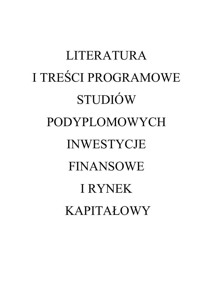 LITERATURA I TREŚCI PROGRAMOWE STUDIÓW PODYPLOMOWYCH INWESTYCJE FINANSOWE I RYNEK KAPITAŁOWY 1. Organizacja rynku kapitałowego w Polsce - rynek finansowy i jego podział rynek pieniężny i kapitałowy, - funkcje rynku kapitałowego, - uczestnicy rynku kapitałowego, - fundusze emerytalne i inwestycyjne - funkcjonowanie Giełdy Papierów Wartościowych w Warszawie - podział na rynki i systemy notowań - rodzaje zleceń giełdowych i ustalanie kursu w notowaniach jednolitych 2. Matematyka finansowa - wartość pieniądza w czasie, - stopa procentowa nominalna, efektywna, równoważna - kapitalizacja prosta i złożona, zgodna i niezgodna, - wkłady oszczędnościowe, - spłata długów, - renta kapitałowa, - wycena akcji – model zdyskontowanych dywidend, - wycena instrumentów rynku pieniężnego, - wycena obligacji i struktura czasowa stóp procentowych, - czas trwania i wypukłość obligacji, - rachunek efektywności projektów inwestycyjnych, 3. Zarządzanie finansami przedsiębiorstw - zarządzanie finansami w ujęciu dynamicznym - zarządzanie funduszami operacyjnymi - ocena wyników przedsiębiorstwa - prognozowanie potrzeb finansowych - przepływy pieniężne a wartość pieniądza w czasie - koszt kapitału - źródła finansowania 4. Metody statystyczne w finansach i ubezpieczeniach - rozkłady zmiennych losowych - podstawowe statystyki opisowe - podstawy wnioskowania statystycznego i wybrane testy statystyczne - statystyczna analiza notowań giełdowych - statystyczne podstawy oceny ryzyka inwestycji - gry losowe i zakłady bukmacherskie 5. Analiza finansowa - bilans, rachunek zysków i strat, sprawozdanie z przepływów środków pieniężnych - analiza wstępna sprawozdań finansowych - wskaźniki płynności, zadłużenia, rentowności, sprawności działania, rynku kapitałowego 2 6. Analiza techniczna i giełdowe gry symulacyjne - teoria Dowa, - pojęcie trendu, formacje kontynuacji oraz odwrócenia trendu, - średnie ruchome, oscylatory i inne wskaźniki analizy technicznej, - teoria Elliotta i cykle, - świece japońskie (candlesticks) - dane giełdowe i statystyczna analiza notowań giełdowych, - gra giełdowa – wirtualne inwestycje, - ocena i analiza wybranych metod inwestycyjnych - relacja zysków do ryzyka -rynki walutowe 7. Inżynieria finansowa - stopa zwrotu i ryzyko portfela akcji, - kryteria tworzenia portfela, - zależność ryzyko – dochód, - wyznaczanie zbioru efektywnego, - model jednowskaźnikowy Sharpe’a, - CAPM – model wyceny dóbr kapitałowych, - APT – teoria arbitrażu cenowego, - ocena efektywności zarządzania portfelem - proste i złożone strategie opcyjne, - równanie parytetu, - górne i dolne granice cen opcji, - kontrakty terminowe futures i forward -opcje egzotyczne 8. Elementy prawa wybrane zagadnienia prawa finansowego, handlowego i cywilnego związane z rynkiem kapitałowym, inwestycjami i podatkami Literatura 1. 2. 3. 4. 5. 6. 7. 8. 9. E. Brigham „Zarządzanie finansami (2 lub 3 tomy w zależności od roku wydania); R. Brealey „Podstawy finansów przedsiębiorstw” t. 1 i 2, PWN Warszawa 1999 L. Bednarski „Analiza finansowa” J. Czekaj, Z. Dresler „Zarządzanie finansami przedsiębiorstw” PWN Warszawa 2001 J. Gajdka „Zarządzanie finansowe” t. 1 i 2, Warszawa 1998 E. Helfert „Techniki analizy finansowej” PWE Warszawa 2004 M. Wypych „Finanse przedsiębiorstwa z elementami zarządzania” ,Łódź 1999 M. Sierpińska, T. Jachna „Ocena przedsiębiorstwa według standardów światowych” PWE Warszawa 2000 A. Aczer „Statystyka w zarządzaniu” PWN Warszawa 2000 3 10. M. Maliński „Weryfikacja hipotez statystycznych wspomagana komputerowo” Wyd. Politechniki Śląskiej Gliwice 200 11. M. Sobczyk „Statystyka” PWN Warszawa 1999 12. W. Krysicki „Rachunek prawdopodobieństwa i statystyka matematyczna w zadaniach” t. 1 i 2, PWN Warszawa 2000 13. M. Sobczyk „Matematyka finansowa” Placet Warszawa 1995 14. M. Dobija, E. Smaga „Podstawy matematyki finansowej i ubezpieczeniowej” PWN Warszawa 1995 15. E. Smaga „Arytmetyka finansowa” PWN Warszawa 2000 16. W. Tarczyński „Rynki kapitałowe. Metody ilościowe” t. 1 i 2, Placet Warszawa 1997 17. W. Tarczyński, M. Zwolankowski „Inżynieria finansowa”, Placet Warszawa 1999 18. K. Jajuga, T. Jajuga „Inwestycje” PWN Warszawa 2002 19. J. Czekaj „Efektywność giełdowego rynku akcji w Polsce” PWN Warszawa 2001 20. R. Haugen „Teoria nowoczesnego inwestowania” WIG- Press Warszawa 1996 21. J.J. Murphy „Analiza techniczna” WIG- Press Warszawa 1995 22. J.C. Francis „Inwestycje. Analiza i zarządzanie” WIG- Press Warszawa 2000 23. B.G. Malkiel „Błądząc po Wall Street” WIG-Press Warszawa 2003 24. J. Hull „Kontrakty terminowe i opcje” WIG- Press Warszawa 1997 25. F. Fabozzi, G. Fong „Zarządzanie portfelem inwestycji finansowych przynoszących stały dochód” PWN Warszawa 2000 26. S. Achelis „Analiza techniczna od A do Z” LT&P Warszawa 1998 27. W. Ronka-Chmielowiec „Ubezpieczenia. Rynek i ryzyko” PWE Warszawa 2002 28. A. Śliwiński „Ryzyko ubezpieczeniowe” Poltext Warszawa 2002 29. O. Doan „Ubezpieczenia życiowe” Poltext Warszawa 1996 30. W. Ostasiewicz „Składki i ryzyko ubezpieczeniowe. Modelowanie stochastyczne” Wyd. AE we Wrocławiu 2004 31. J. Socha „Rynek papierów wartościowych w Polsce” 4
