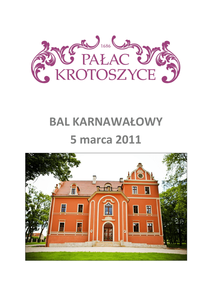 BAL KARNAWAŁOWY 5 marca 2011 „Pałac Krotoszyce” to XVII-wieczna posiadłośd - z zabudowaniami folwarcznymi i zabytkowym, sześciohektarowym parkiem. Obiekt jest malowniczo położony w Dolinie Kaczawy. Atutem Pałacu Krotoszyce jest dogodne położenie - kilka kilometrów od Legnicy i autostrady A4, niedaleko drogi krajowej nr 3. W niecałą godzinę bezpiecznie i komfortowo dotrzecie Paostwo do Wrocławia. Z Krotoszyc blisko jest też do stolic naszych sąsiadów - Pragi i Berlina. Proponujemy też mało znane, ale ciche i urokliwe Pogórze i Góry Kaczawskie. Bal będzie się odbywad na sali o powierzchni 400 m kw., nawiązującej swoim wnętrzem do tradycji. Sklepienia łukowe, oryginalne elementy z barokowej cegły, piękne oświetlenie i stylowe krzesła tworzą magiczny klimat do biesiadowania i zabawy. Atrakcją jest oświetlenie LEDowe w podłodze sali. Zapraszamy Paostwa na Bal Karnawałowy do „Pałacu Krotoszyce”. Nasi pracownicy zadbają o Paostwa ciepłe przyjęcie, szampaoską zabawę oraz bezpieczny i komfortowy pobyt. ` www.palackrotoszyce.pl MENU NA BAL KARNAWAŁOWY Zupa Żurek na białej kiełbasie i wędzonym boczku gotowany leśnymi grzybami aromatyzowany Danie główne Saltimbocca z indyka z ziemniakami z warzywami zapiekanymi ziołowym sosem aromatyzowanymi Bufet gorący Bufet zimny Bufet słodki Consome z drobiu z mięsnymi kluseczkami Filety z łososia w sosie śmietanowo-koperkowym duszone Peperonata z drobiu Involtini w sosie z leśnych grzybów Mini steki w cebuli z tymiankiem duszone Pieczone ziemniaki z rozmarynem Ryż z warzywami gotowany świeżymi ziołami aromatyzowany Ziemniaczane kluseczki klarowanym masłem i szczypiorkiem aromatyzowane Aromatyczna Ratatuilla z warzyw Fasolka szparagowa z płatkami pieczonego bekonu w pomidorach duszona Buraczki w miodzie i czerwonym winie karmelizowane Roladki z wędzonego łososia z musem kaparowym Matiasy w czerwonej cebuli i kolorowym pieprzu marynowane Wołowina po angielsku z tapenade z oliwek i koziego twarożku Rolada z szynki wiejskiej z musem ze świeżo startego chrzanu Mięsa w aromacie świeżych ziół pieczone Zestaw terin z kolorowymi farszami Mozzarella przekładana pomidorami z sosem Pesto Wieprzowe roladki z kolorowymi farszami pieczone Sałatka z jajek i kukurydzy Sałatka jarzynowa Sałatka z czerwonej fasoli z wędzonym bekonem Sałatka ze świeżych warzyw z sosem czosnkowym Kosze pieczywa świeżo wypiekanego Dip czosnkowy Dip ziołowy Ciasto czekoladowe Mini babeczki bankietowe z owocami Ciasto makowe Tartoletki z owocami Krajanka orzechowa Sernik Świeże owoce krojone www.palackrotoszyce.pl Bufet z napojami Kawa, herbata Woda mineralna Sok pomaraoczowy Sok z czarnej porzeczki Sok owocowy Koszt uczestnictwa w Balu wynosi 150 zł/os. W cenie zapewniamy Paostwu transport powrotny do 20 km od Krotoszyc. HOTEL Naszym gościom oddajemy komfortowe, nowocześnie urządzone pokoje. W każdym pokoju znajduje się łazienka z prysznicem, telewizor, telefon. Do dyspozycji gości jest całodobowa recepcja. Do dyspozycji Gości oddajemy pokoje 1-, 2-osobowe oraz DeLuxe. Pokoje są nowocześnie urządzone, wyposażone w telewizor i telefon oraz wygodne, funkcjonalne łazienki z prysznicami. Nocleg dla uczestników Balu Karnawałowego Nocleg w innym terminie www.palackrotoszyce.pl 90 zł za osobę 110 zł za osobę RESTAURACJA Zapraszamy także do restauracji, czynnej codziennie od 12:00 do 22:00. Wyśmienite menu spełni najbardziej wyrafinowane oczekiwania Gości. Bar zaskoczy Paostwa szeroką gamą koktajli bezalkoholowych i alkoholowych. Smakoszom win oferujemy pełną szafę niezwykłych gatunków win. A desery zadowolą wymagające podniebienia. KONTAKT Pałac Krotoszyce - recepcja ul. Parkowa 3 59-223 Krotoszyce tel. 76 876 83 00 www.palackrotoszyce.pl [email protected] www.palackrotoszyce.pl