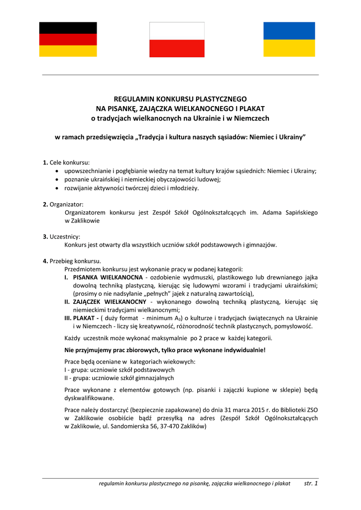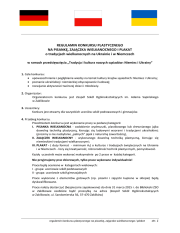 REGULAMIN KONKURSU PLASTYCZNEGO NA PISANKĘ, ZAJĄCZKA WIELKANOCNEGO I PLAKAT o tradycjach wielkanocnych na Ukrainie i w Niemczech w ramach przedsięwzięcia „Tradycja i kultura naszych sąsiadów: Niemiec i Ukrainy” 1. Cele konkursu: upowszechnianie i pogłębianie wiedzy na temat kultury krajów sąsiednich: Niemiec i Ukrainy; poznanie ukraińskiej i niemieckiej obyczajowości ludowej; rozwijanie aktywności twórczej dzieci i młodzieży. 2. Organizator: Organizatorem konkursu jest Zespół Szkół Ogólnokształcących im. Adama Sapińskiego w Zaklikowie 3. Uczestnicy: Konkurs jest otwarty dla wszystkich uczniów szkół podstawowych i gimnazjów. 4. Przebieg konkursu. Przedmiotem konkursu jest wykonanie pracy w podanej kategorii: I. PISANKA WIELKANOCNA - ozdobienie wydmuszki, plastikowego lub drewnianego jajka dowolną techniką plastyczną, kierując się ludowymi wzorami i tradycjami ukraińskimi; (prosimy o nie nadsyłanie „pełnych” jajek z naturalną zawartością), II. ZAJĄCZEK WIELKANOCNY - wykonanego dowolną techniką plastyczną, kierując się niemieckimi tradycjami wielkanocnymi; III. PLAKAT - ( duży format - minimum A3) o kulturze i tradycjach świątecznych na Ukrainie i w Niemczech - liczy się kreatywność, różnorodność technik plastycznych, pomysłowość. Każdy uczestnik może wykonać maksymalnie po 2 prace w każdej kategorii. Nie przyjmujemy prac zbiorowych, tylko prace wykonane indywidualnie! Prace będą oceniane w kategoriach wiekowych: I - grupa: uczniowie szkół podstawowych II - grupa: uczniowie szkół gimnazjalnych Prace wykonane z elementów gotowych (np. pisanki i zajączki kupione w sklepie) będą dyskwalifikowane. Prace należy dostarczyć (bezpiecznie zapakowane) do dnia 31 marca 2015 r. do Biblioteki ZSO w Zaklikowie osobiście bądź przesyłką na adres (Zespół Szkół Ogólnokształcących w Zaklikowie, ul. Sandomierska 56, 37-470 Zaklików) regulamin konkursu plastycznego na pisankę, zajączka wielkanocnego i plakat str. 1 Prace będą zwracane na życzenie uczestnika po zakończeniu wystawy pokonkursowej - 25 kwietnia 2015, natomiast prace nieodebrane po terminie 3 maja 2015 przechodzą na własność ZSO w Zaklikowie. 5. Kryteria oceniania: zgodność z tematem; walory artystyczne; estetyka, kreatywność i innowacyjność wykonania. 6. Wyniki i prezentacja prac: obrady jury konkursowego odbędą się 16 kwietnia 2015 r.; ogłoszenie wyników 17 kwietnia 2015 r. do godz 11:00 na stronie internetowej szkoły: http://zsozaklikow.szkolna.net rozdanie nagród 18 kwietnia 2015 r. godz. 12:00 w ZSO w Zaklikowie na uroczystości zakończenia naszego przedsięwzięcia: „Tradycja i kultura naszych sąsiadów: Niemiec i Ukrainy” 7. Postanowienia końcowe: Warunkiem uczestnictwa jest dołączenie do pracy ucznia zgody opiekuna prawnego – załącznik nr 1 i karty zgłoszenia – załącznik nr 2 (prosimy wypełniać czytelnie, ważne jest, aby karta była odpowiednio przymocowana, co pozwoli uniknąć kłopotów z identyfikacją autora pracy). Brak niektórych danych lub błędnie podane na karcie spowodują dyskwalifikację pracy. Organizator zastrzega sobie prawo do ewentualnych zmian w treści i wykładni regulaminu. Ocena komisji konkursowej jest ostateczna i nie podlega odwołaniom. Uczestnicy przesyłając prace na konkurs akceptują regulamin oraz wyrażają zgodę na bezpłatne publikacje swoich prac – dla celów związanych z konkursem/wystawą pokonkursową oraz publikację zdjęć z uroczystości z wizerunkami uczestników. Organizatorzy konkursu przewidują dla zwycięzców cenne nagrody Zespół Szkół Ogólnokształcących im. Adama Sapińskiego ul. Sandomierska 56, 37-470 Zaklików tel. 15 8738409 Współfinansowano ze środków Starostwa Powiatowego w Stalowej Woli regulamin konkursu plastycznego na pisankę, zajączka wielkanocnego i plakat str. 2