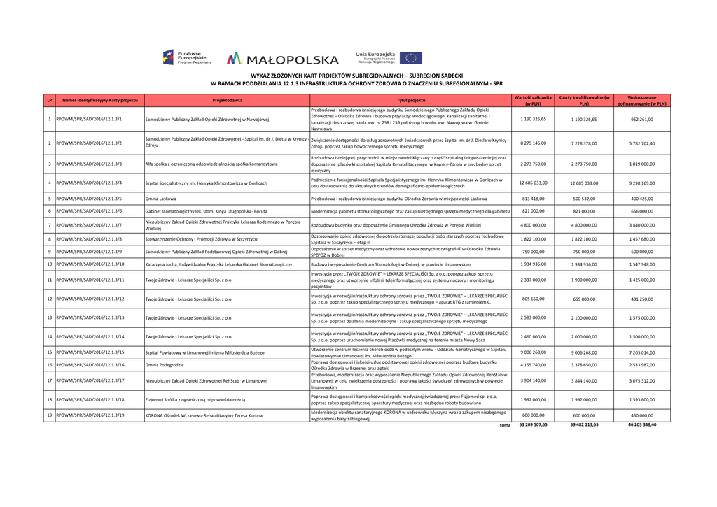 WYKAZ ZŁOŻONYCH KART PROJEKTÓW SUBREGIONALNYCH – SUBREGION SĄDECKI W RAMACH PODDZIAŁANIA 12.1.3 INFRASTRUKTURA OCHRONY ZDROWIA O ZNACZENIU SUBREGIONALNYM - SPR LP Numer identyfikacyjny Karty projektu Projektodawca Tytuł projektu Przebudowa i rozbudowa istniejącego budynku Samodzielnego Publicznego Zakładu Opieki Zdrowotnej – Ośrodka Zdrowia i budowa przyłączy: wodociągowego, kanalizacji sanitarnej i kanalizacji deszczowej na dz. ew. nr 258 i 259 położonych w obr. ew. Nawojowa w Gminie Nawojowa Wartość całkowita (w PLN) Koszty kwalifikowalne (w PLN) Wnioskowane dofinansowanie (w PLN) 1 190 326,65 1 190 326,65 952 261,00 8 275 146,00 7 228 378,00 5 782 702,40 1 RPOWM/SPR/SAD/2016/12.1.3/1 Samodzielny Publiczny Zakład Opieki Zdrowotnej w Nawojowej 2 RPOWM/SPR/SAD/2016/12.1.3/2 Samodzielny Publiczny Zakład Opieki Zdrowotnej - Szpital im. dr J. Dietla w Krynicy - Zwiększenie dostępności do usług zdrowotnych świadczonych przez Szpital im. dr J. Dietla w Krynicy Zdroju Zdroju poprzez zakup nowoczesnego sprzętu medycznego 3 RPOWM/SPR/SAD/2016/12.1.3/3 Alfa spółka z ograniczoną odpowiedzialnością spółka komandytowa Rozbudowa istniejącej przychodni w miejscowości Klęczany o część szpitalną i doposażenie jej oraz doposażenie placówki szpitalnej Szpitala Rehabilitacyjnego w Krynicy-Zdroju w niezbędny sprzęt medyczny 2 273 750,00 2 273 750,00 1 819 000,00 4 RPOWM/SPR/SAD/2016/12.1.3/4 Szpital Specjalistyczny im. Henryka Klimontowicza w Gorlicach Podniesienie funkcjonalności Szpitala Specjalistycznego im. Henryka Klimontowicza w Gorlicach w celu dostosowania do aktualnych trendów demograficzno-epidemiologicznych 12 685 033,00 12 685 033,00 9 298 169,00 5 RPOWM/SPR/SAD/2016/12.1.3/5 Gmina Laskowa Przebudowa i rozbudowa istniejącego budynku Ośrodka Zdrowia w miejscowości Laskowa 813 418,00 500 532,00 400 425,00 6 RPOWM/SPR/SAD/2016/12.1.3/6 Gabinet stomatologiczny lek. stom. Kinga Długopolska- Boruta Modernizacja gabinetu stomatologicznego oraz zakup niezbędnego sprzętu medycznego dla gabinetu 821 000,00 821 000,00 656 000,00 RPOWM/SPR/SAD/2016/12.1.3/7 Niepubliczny Zakład Opieki Zdrowotnej Praktyka Lekarza Rodzinnego w Porębie Wielkiej Rozbudowa budynku oraz doposażenie Gminnego Ośrodka Zdrowia w Porębie Wielkiej 4 800 000,00 4 800 000,00 3 840 000,00 1 822 100,00 1 822 100,00 1 457 680,00 750 000,00 750 000,00 600 000,00 7 8 RPOWM/SPR/SAD/2016/12.1.3/8 Stowarzyszenie Ochrony i Promocji Zdrowia w Szczyrzycu 9 RPOWM/SPR/SAD/2016/12.1.3/9 Samodzielny Publiczny Zakład Podstawowej Opieki Zdrowotnej w Dobrej 10 RPOWM/SPR/SAD/2016/12.1.3/10 Dostosowanie opieki zdrowotnej do potrzeb rosnącej populacji osób starszych poprzez rozbudowę Szpitala w Szczyrzycu – etap II Doposażenie w sprzęt medyczny oraz wdrożenie nowoczesnych rozwiązań IT w Ośrodku Zdrowia SPZPOZ w Dobrej Katarzyna Jucha, Indywidualna Praktyka Lekarska Gabinet Stomatologiczny Budowa i wyposażenie Centrum Stomatologii w Dobrej, w powiecie limanowskim 1 934 936,00 1 934 936,00 1 547 948,00 11 RPOWM/SPR/SAD/2016/12.1.3/11 Twoje Zdrowie - Lekarze Specjaliści Sp. z o.o. Inwestycja przez „TWOJE ZDROWIE” – LEKARZE SPECJALIŚCI Sp. z o.o. poprzez zakup sprzętu medycznego oraz utworzenie infolinii teleinformatycznej oraz systemu nadzoru i monitoringu pacjentów 2 337 000,00 1 900 000,00 1 425 000,00 12 RPOWM/SPR/SAD/2016/12.1.3/12 Twoje Zdrowie - Lekarze Specjaliści Sp. z o.o. Inwestycja w rozwój infrastruktury ochrony zdrowia przez „TWOJE ZDROWIE” – LEKARZE SPECJALIŚCI Sp. z o.o. poprzez zakup specjalistycznego sprzętu medycznego – aparat RTG z ramieniem C. 805 650,00 655 000,00 491 250,00 13 RPOWM/SPR/SAD/2016/12.1.3/13 Twoje Zdrowie - Lekarze Specjaliści Sp. z o.o. Inwestycja w rozwój infrastruktury ochrony zdrowia przez „TWOJE ZDROWIE” – LEKARZE SPECJALIŚCI Sp. z o.o. poprzez działania modernizacyjne i zakup specjalistycznego sprzętu medycznego 2 583 000,00 2 100 000,00 1 575 000,00 14 RPOWM/SPR/SAD/2016/12.1.3/14 Twoje Zdrowie - Lekarze Specjaliści Sp. z o.o. Inwestycja w rozwój infrastruktury ochrony zdrowia przez „TWOJE ZDROWIE” – LEKARZE SPECJALIŚCI Sp. z o.o. poprzez uruchomienie nowej Placówki medycznej na terenie miasta Nowy Sącz 2 460 000,00 2 000 000,00 1 500 000,00 15 RPOWM/SPR/SAD/2016/12.1.3/15 Szpital Powiatowy w Limanowej Imienia Miłosierdzia Bożego 9 006 268,00 9 006 268,00 7 205 014,00 16 RPOWM/SPR/SAD/2016/12.1.3/16 Gmina Podegrodzie 4 155 740,00 3 378 650,00 2 533 987,00 17 RPOWM/SPR/SAD/2016/12.1.3/17 Niepubliczny Zakład Opieki Zdrowotnej RehStab w Limanowej 3 904 140,00 3 844 140,00 3 075 312,00 18 RPOWM/SPR/SAD/2016/12.1.3/18 Fizjomed Spółka z ograniczoną odpowiedzialnością 1 992 000,00 1 992 000,00 1 593 600,00 19 RPOWM/SPR/SAD/2016/12.1.3/19 KORONA Ośrodek Wczasowo-Rehabilitacyjny Teresa Korona Utworzenie centrum leczenia chorób osób w podeszłym wieku - Oddziału Geriatrycznego w Szpitalu Powiatowym w Limanowej im. Miłosierdzia Bożego Poprawa dostępności i jakości usług podstawowej opieki zdrowotnej poprzez budowę budynku Ośrodka Zdrowia w Brzeznej oraz apteki Przebudowa, modernizacja oraz wyposażenie Niepublicznego Zakładu Opieki Zdrowotnej RehStab w Limanowej, w celu zwiększenia dostępności i poprawy jakości świadczeń zdrowotnych w powiecie limanowskim Poprawa dostępności i kompleksowości opieki medycznej świadczonej przez Fizjomed sp. z o.o. poprzez zakup specjalistycznej aparatury medycznej oraz niezbędne roboty budowlane Modernizacja obiektu sanatoryjnego KORONA w uzdrowisku Muszyna wraz z zakupem niezbędnego wyposażenia bazy zabiegowej suma 600 000,00 600 000,00 450 000,00 63 209 507,65 59 482 113,65 46 203 348,40