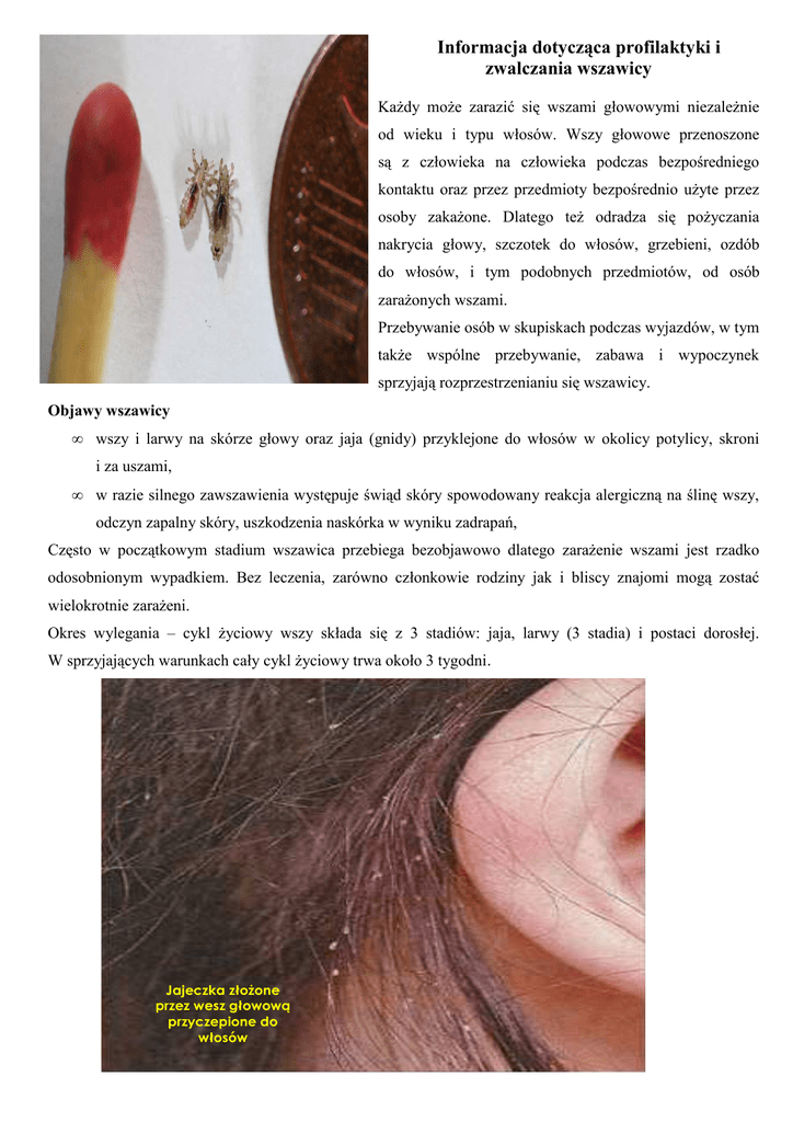 Informacja dotycząca profilaktyki i zwalczania wszawicy KaŜdy moŜe zarazić się wszami głowowymi niezaleŜnie od wieku i typu włosów. Wszy głowowe przenoszone są z człowieka na człowieka podczas bezpośredniego kontaktu oraz przez przedmioty bezpośrednio uŜyte przez osoby zakaŜone. Dlatego teŜ odradza się poŜyczania nakrycia głowy, szczotek do włosów, grzebieni, ozdób do włosów, i tym podobnych przedmiotów, od osób zaraŜonych wszami. Przebywanie osób w skupiskach podczas wyjazdów, w tym takŜe wspólne przebywanie, zabawa i wypoczynek sprzyjają rozprzestrzenianiu się wszawicy. Objawy wszawicy • wszy i larwy na skórze głowy oraz jaja (gnidy) przyklejone do włosów w okolicy potylicy, skroni i za uszami, • w razie silnego zawszawienia występuje świąd skóry spowodowany reakcja alergiczną na ślinę wszy, odczyn zapalny skóry, uszkodzenia naskórka w wyniku zadrapań, Często w początkowym stadium wszawica przebiega bezobjawowo dlatego zaraŜenie wszami jest rzadko odosobnionym wypadkiem. Bez leczenia, zarówno członkowie rodziny jak i bliscy znajomi mogą zostać wielokrotnie zaraŜeni. Okres wylegania – cykl Ŝyciowy wszy składa się z 3 stadiów: jaja, larwy (3 stadia) i postaci dorosłej. W sprzyjających warunkach cały cykl Ŝyciowy trwa około 3 tygodni. Jajeczka złoŜone przez wesz głowową przyczepione do włosów Wskazania profilaktyczne dla rodziców i dzieci • • • • • • związywanie długich włosów lub krótkie fryzury ułatwiające pielęgnację skóry głowy i włosów, posiadanie i uŜywanie wyłącznie osobistych przyborów higienicznych do pielęgnacji skóry i włosów codzienne czesanie i szczotkowanie włosów, mycie skóry głowy i włosów w miarę potrzeb (nie rzadziej niŜ raz w tygodniu), wyposaŜenie dzieci w środki higieniczne takie jak szampony z odŜywką ułatwiające rozczesywanie i wyczesywanie włosów, po powrocie do domu systematyczne sprawdzanie czystości głowy i włosów oraz systematyczne kontrole w okresie uczęszczania dziecka do przedszkola, szkoły lub pobytu w internacie, sanatorium itp. W wypadku wykrycia przyklejonych do włosów jaj pasoŜytów (gnid) lub wszy we włosach lub na okryciu głowy powinno się rozpocząć zabiegi przeciw - wszowe tak szybko jak tylko jest to moŜliwe. W tym celu naleŜy: • naleŜy dokonać przeglądu wszystkich osób z bezpośredniej styczności a zwłaszcza członków rodziny i innych współmieszkańców, • zastosować dostępne bez recepty w aptekach preparaty, które skutecznie likwidują pasoŜyty i ich jaja. Preparat naleŜy stosować wg instrukcji podanej na etykiecie. W obecnej dobie występujące w sprzedaŜy środki zwalczające wszawicę są wysoko skuteczne jednakŜe nie zapobiegają one występowaniu wszawicy. śaden z dostępnych preparatów nie jest wstanie zabić jednorazowo wszystkich wszy i jajeczek, dlatego teŜ zabieg dezynsekcji powinien odbywać się co najmniej dwa razy, w siedmio dniowych odstępach. • czesać włosy gęstym grzebieniem, regularnie i dokładnie przez osiem dni codziennie, po czym raz w tygodniu przez trzy tygodnie. Włosy powinny być czesane na mokro. Zarzuć biały ręcznik na ramiona w celu wyłapania wszy i gnid opadających podczas czesania. Po zakończonym czesaniu naleŜy wyprać ręcznik i umyć grzebień w 60oC. W sytuacji wystąpienia wszawicy u dziecka, kuracji powinni się poddać wszyscy zaraŜeni jednocześnie. W przypadku podejrzenia zakaŜenia wszawicą podczas pobytu w przedszkolu czy szkole naleŜy o tym fakcie, poinformować przedszkole/szkołę i najbliŜsze środowisko w celu zapobiegnięcia wtórnego zakaŜenia. Działania placówki nauczania i wychowania • • • • • przekazanie informacji wszystkim rodzicom o konieczności systematycznego sprawdzenia czystości skóry głowy i włosów u dzieci, w przypadku stwierdzenia występowania wszawicy u niektórych dzieci, naleŜy poinformować rodziców o konieczności wykonania wśród wszystkich domowników zabiegów leczniczych, w przypadku podejrzenia o występowaniu wszawicy wśród dzieci i młodzieŜy szkolnej, pielęgniarka szkolna moŜe przeprowadzić kontrolę czystości wśród uczniów, których rodzice wyrazili zgodę na objęcie ich profilaktyczną opieką zdrowotną, pielęgniarka informuje dyrekcję szkoły o skali zjawiska, natomiast rodzicom przekazuje informacje o stanie czystości włosów i skóry głowy ich dzieci oraz informacje dotyczące przeprowadzenia koniecznych zabiegów higienicznych, w miarę potrzeby dyrekcja placówki moŜe zorganizować działania edukacyjne dotyczące ww. problematyki skierowanej do dzieci, rodziców, opiekunów, w przypadku występowania trudności w rozwiązywaniu problemu np. w rodzinach o niskim statusie socjo - ekonomicznym naleŜy podjąć współpracę z władzami samorządowymi (opieką społeczną),w celu udzielenia wsparcia tym rodzinom w rozwiązywaniu problemu wszawicy wśród wszystkich domowników. W razie potrzeby, w trudnych sytuacjach (duŜy zasięg występowania wszawicy, przewlekłe jej występowanie, trudne do rozwiązania przypadki ) dyrekcja placówki moŜe zwrócić się o ukierunkowanie działań w rozwiązywaniu problemu do właściwej terenowo powiatowej stacji sanitarno-epidemiologicznej.