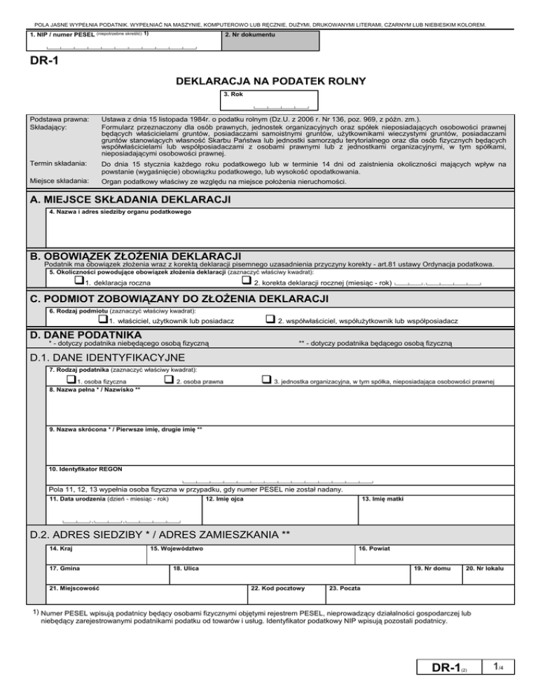 POLA JASNE WYPEŁNIA PODATNIK. WYPEŁNIAĆ NA MASZYNIE, KOMPUTEROWO LUB RĘCZNIE, DUŻYMI, DRUKOWANYMI LITERAMI, CZARNYM LUB NIEBIESKIM KOLOREM. 1. NIP / numer PESEL (niepotrzebne skreślić) 1) 2. Nr dokumentu └────┴────┴────┴────┴────┴────┴────┴────┴────┴────┴────┘ DR-1 DEKLARACJA NA PODATEK ROLNY 3. Rok └────┴────┴────┴────┘ Podstawa prawna: Składający: Ustawa z dnia 15 listopada 1984r. o podatku rolnym (Dz.U. z 2006 r. Nr 136, poz. 969, z późn. zm.). Formularz przeznaczony dla osób prawnych, jednostek organizacyjnych oraz spółek nieposiadających osobowości prawnej będących właścicielami gruntów, posiadaczami samoistnymi gruntów, użytkownikami wieczystymi gruntów, posiadaczami gruntów stanowiących własność Skarbu Państwa lub jednostki samorządu terytorialnego oraz dla osób fizycznych będących współwłaścicielami lub współposiadaczami z osobami prawnymi lub z jednostkami organizacyjnymi, w tym spółkami, nieposiadającymi osobowości prawnej. Termin składania: Do dnia 15 stycznia każdego roku podatkowego lub w terminie 14 dni od zaistnienia okoliczności mających wpływ na powstanie (wygaśnięcie) obowiązku podatkowego, lub wysokość opodatkowania. Miejsce składania: Organ podatkowy właściwy ze względu na miejsce położenia nieruchomości. A. MIEJSCE SKŁADANIA DEKLARACJI 4. Nazwa i adres siedziby organu podatkowego B. OBOWIĄZEK ZŁOŻENIA DEKLARACJI Podatnik ma obowiązek złożenia wraz z korektą deklaracji pisemnego uzasadnienia przyczyny korekty - art.81 ustawy Ordynacja podatkowa. 5. Okoliczności powodujące obowiązek złożenia deklaracji (zaznaczyć właściwy kwadrat): 1. deklaracja roczna 2. korekta deklaracji rocznej (miesiąc - rok) └────┴────┘-└────┴────┴────┴────┘ C. PODMIOT ZOBOWIĄZANY DO ZŁOŻENIA DEKLARACJI 6. Rodzaj podmiotu (zaznaczyć właściwy kwadrat): 1. właściciel, użytkownik lub posiadacz 2. współwłaściciel, współużytkownik lub współposiadacz D. DANE PODATNIKA * - dotyczy podatnika niebędącego osobą fizyczną ** - dotyczy podatnika będącego osobą fizyczną D.1. DANE IDENTYFIKACYJNE 7. Rodzaj podatnika (zaznaczyć właściwy kwadrat): 1. osoba fizyczna 8. Nazwa pełna * / Nazwisko ** 2. osoba prawna 3. jednostka organizacyjna, w tym spółka, nieposiadająca osobowości prawnej 9. Nazwa skrócona * / Pierwsze imię, drugie imię ** 10. Identyfikator REGON └────┴────┴────┴────┴────┴────┴────┴────┴────┴────┴────┴────┴────┴────┘ Pola 11, 12, 13 wypełnia osoba fizyczna w przypadku, gdy numer PESEL nie został nadany. 12. Imię ojca 11. Data urodzenia (dzień - miesiąc - rok) 13. Imię matki └────┴────┘-└────┴────┘-└────┴────┴────┴────┘ D.2. ADRES SIEDZIBY * / ADRES ZAMIESZKANIA ** 14. Kraj 17. Gmina 21. Miejscowość 15. Województwo 16. Powiat 18. Ulica 19. Nr domu 22. Kod pocztowy 20. Nr lokalu 23. Poczta 1) Numer PESEL wpisują podatnicy będący osobami fizycznymi objętymi rejestrem PESEL, nieprowadzący działalności gospodarczej lub niebędący zarejestrowanymi podatnikami podatku od towarów i usług. Identyfikator podatkowy NIP wpisują pozostali podatnicy. DR-1 (2) 1/4 POLA JASNE WYPEŁNIA PODATNIK. WYPEŁNIAĆ NA MASZYNIE, KOMPUTEROWO LUB RĘCZNIE, DUŻYMI, DRUKOWANYMI LITERAMI, CZARNYM LUB NIEBIESKIM KOLOREM. E. DANE DOTYCZĄCE UŻYTKÓW ROLNYCH STANOWIĄCYCH GOSPODARSTWO ROLNE – NIEPODLEGAJĄCYCH ZWOLNIENIU E.1. GRUNTY ORNE Klasa I II IIIa IIIb IVa IVb Powierzchnia w ha 2) Przelicznik a b 24. Powierzchnia w ha przeliczeniowych 2) c 25. , 26. , 27. , 28. , 29. , 30. , 31. , 32. , 33. , 34. , 35. , , E.2. ŁĄKI I PASTWISKA I II III IV 36. 37. , 38. , 39. , 40. , 41. , 42. , 43. , , E.3. SADY I II III IIIa IIIb IV IVa IVb 44. 45. , 46. , 47. , 48. , 49. , 50. , 51. , 52. , 53. , 54. , 55. , , E.4. GRUNTY POD STAWAMI NIEZARYBIONYMI - grunty orne I II IIIa IIIb IVa IVb 2) 56. 57. , 58. , 60. , 61. , 62. , 63. , 64. , 65. , 66. , (2) , 67. Należy podać z dokładnością do czterech miejsc po przecinku. DR-1 , 59. 2/4 , POLA JASNE WYPEŁNIA PODATNIK. WYPEŁNIAĆ NA MASZYNIE, KOMPUTEROWO LUB RĘCZNIE, DUŻYMI, DRUKOWANYMI LITERAMI, CZARNYM LUB NIEBIESKIM KOLOREM. E.5. GRUNTY POD STAWAMI NIEZARYBIONYMI - łąki i pastwiska Powierzchnia w ha 2) Klasa 68. I Powierzchnia w ha przeliczeniowych 2) Przelicznik 69. , 70. II , 71. , 72. III , 73. , 74. IV , 75. , , E.6. GRUNTY ROLNE ZABUDOWANE - grunty orne I II IIIa IIIb IVa IVb 76. 77. , 78. , 79. , 80. , 81. , 82. , 83. , 84. , 85. , 86. , 87. , , E.7. GRUNTY ROLNE ZABUDOWANE - łąki i pastwiska I II III IV 88. 89. , 90. , 91. , 92. , 93. , 94. , 95. , , E.8. ROWY - grunty orne I II IIIa IIIb IVa IVb 96. 97. , 98. , 99. , 100. , 101. , 102. , 103. , 104. , 105. , 106. , 107. , , E.9. ROWY - łąki i pastwiska I II III IV 108. 109. , 110. , 111. , 112. , 113. , 114. , 115. , , DR-1 (2) 3/4 POLA JASNE WYPEŁNIA PODATNIK. WYPEŁNIAĆ NA MASZYNIE, KOMPUTEROWO LUB RĘCZNIE, DUŻYMI, DRUKOWANYMI LITERAMI, CZARNYM LUB NIEBIESKIM KOLOREM. E.10. UŻYTKI ROLNE (ROWY, GRUNTY POD STAWAMI NIEZARYBIONYMI) BEZ OZNACZENIA KLASY GLEBOZNAWCZEJ 116. Powierzchnia w ha , E.11. GRUNTY POD STAWAMI ZARYBIONYMI - łososiem, trocią, głowacicą, palią i pstrągiem Powierzchnia w ha 2) Powierzchnia w ha przeliczeniowych 2) Przelicznik 117. 1,0 , E12. GRUNTY POD STAWAMI ZARYBIONYMI - inne gatunki ryb 118. 119. 0,20 , , E13. ŁĄCZNA POWIERZCHNIA UŻYTKÓW ROLNYCH STANOWIĄCYCH GOSPODARSTWO ROLNE 120.Powierzchnia w ha (suma z części od E.1 do E.12 kol.a) 121. Powierzchnia w ha przeliczeniowych (suma z części od E.1 do E.12 kol