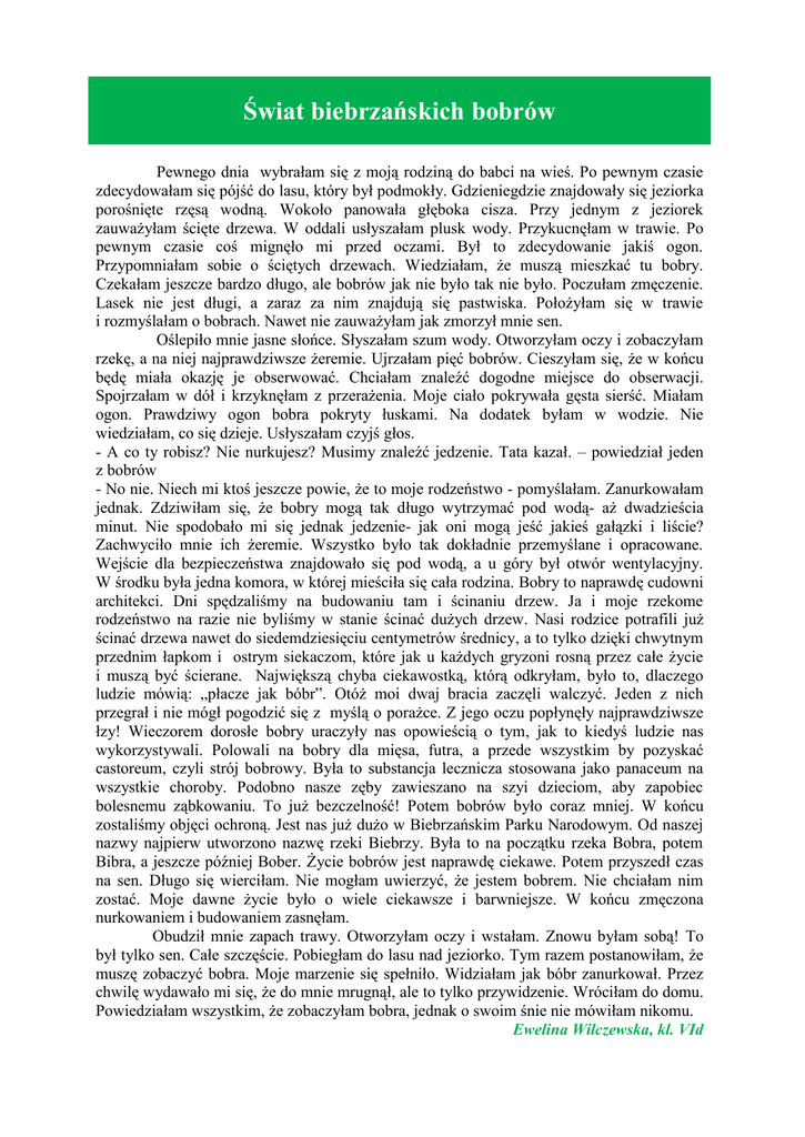 Świat biebrzańskich bobrów Pewnego dnia wybrałam się z moją rodziną do babci na wieś. Po pewnym czasie zdecydowałam się pójść do lasu, który był podmokły. Gdzieniegdzie znajdowały się jeziorka porośnięte rzęsą wodną. Wokoło panowała głęboka cisza. Przy jednym z jeziorek zauważyłam ścięte drzewa. W oddali usłyszałam plusk wody. Przykucnęłam w trawie. Po pewnym czasie coś mignęło mi przed oczami. Był to zdecydowanie jakiś ogon. Przypomniałam sobie o ściętych drzewach. Wiedziałam, że muszą mieszkać tu bobry. Czekałam jeszcze bardzo długo, ale bobrów jak nie było tak nie było. Poczułam zmęczenie. Lasek nie jest długi, a zaraz za nim znajdują się pastwiska. Położyłam się w trawie i rozmyślałam o bobrach. Nawet nie zauważyłam jak zmorzył mnie sen. Oślepiło mnie jasne słońce. Słyszałam szum wody. Otworzyłam oczy i zobaczyłam rzekę, a na niej najprawdziwsze żeremie. Ujrzałam pięć bobrów. Cieszyłam się, że w końcu będę miała okazję je obserwować. Chciałam znaleźć dogodne miejsce do obserwacji. Spojrzałam w dół i krzyknęłam z przerażenia. Moje ciało pokrywała gęsta sierść. Miałam ogon. Prawdziwy ogon bobra pokryty łuskami. Na dodatek byłam w wodzie. Nie wiedziałam, co się dzieje. Usłyszałam czyjś głos. - A co ty robisz? Nie nurkujesz? Musimy znaleźć jedzenie. Tata kazał. – powiedział jeden z bobrów - No nie. Niech mi ktoś jeszcze powie, że to moje rodzeństwo - pomyślałam. Zanurkowałam jednak. Zdziwiłam się, że bobry mogą tak długo wytrzymać pod wodą- aż dwadzieścia minut. Nie spodobało mi się jednak jedzenie- jak oni mogą jeść jakieś gałązki i liście? Zachwyciło mnie ich żeremie. Wszystko było tak dokładnie przemyślane i opracowane. Wejście dla bezpieczeństwa znajdowało się pod wodą, a u góry był otwór wentylacyjny. W środku była jedna komora, w której mieściła się cała rodzina. Bobry to naprawdę cudowni architekci. Dni spędzaliśmy na budowaniu tam i ścinaniu drzew. Ja i moje rzekome rodzeństwo na razie nie byliśmy w stanie ścinać dużych drzew. Nasi rodzice potrafili już ścinać drzewa nawet do siedemdziesięciu centymetrów średnicy, a to tylko dzięki chwytnym przednim łapkom i ostrym siekaczom, które jak u każdych gryzoni rosną przez całe życie i muszą być ścierane. Największą chyba ciekawostką, którą odkryłam, było to, dlaczego ludzie mówią: „płacze jak bóbr”. Otóż moi dwaj bracia zaczęli walczyć. Jeden z nich przegrał i nie mógł pogodzić się z myślą o porażce. Z jego oczu popłynęły najprawdziwsze łzy! Wieczorem dorosłe bobry uraczyły nas opowieścią o tym, jak to kiedyś ludzie nas wykorzystywali. Polowali na bobry dla mięsa, futra, a przede wszystkim by pozyskać castoreum, czyli strój bobrowy. Była to substancja lecznicza stosowana jako panaceum na wszystkie choroby. Podobno nasze zęby zawieszano na szyi dzieciom, aby zapobiec bolesnemu ząbkowaniu. To już bezczelność! Potem bobrów było coraz mniej. W końcu zostaliśmy objęci ochroną. Jest nas już dużo w Biebrzańskim Parku Narodowym. Od naszej nazwy najpierw utworzono nazwę rzeki Biebrzy. Była to na początku rzeka Bobra, potem Bibra, a jeszcze później Bober. Życie bobrów jest naprawdę ciekawe. Potem przyszedł czas na sen. Długo się wierciłam. Nie mogłam uwierzyć, że jestem bobrem. Nie chciałam nim zostać. Moje dawne życie było o wiele ciekawsze i barwniejsze. W końcu zmęczona nurkowaniem i budowaniem zasnęłam. Obudził mnie zapach trawy. Otworzyłam oczy i wstałam. Znowu byłam sobą! To był tylko sen. Całe szczęście. Pobiegłam do lasu nad jeziorko. Tym razem postanowiłam, że muszę zobaczyć bobra. Moje marzenie się spełniło. Widziałam jak bóbr zanurkował. Przez chwilę wydawało mi się, że do mnie mrugnął, ale to tylko przywidzenie. Wróciłam do domu. Powiedziałam wszystkim, że zobaczyłam bobra, jednak o swoim śnie nie mówiłam nikomu. Ewelina Wilczewska, kl. VId