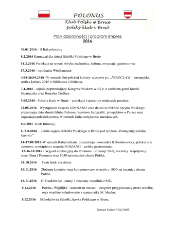 Plan działalności i program imprez 2016 30.01.2016 - II Bal polonijny 8.2.2016 Karnawał dla dzieci Szkółki Polskiego w Brnie 11.2.2016 Prelekcja na temat: Afryka zachodnia, kultura, zwyczaje, gastronomia 17.3.2016 – spotkanie Wielkanocne 4.04-26.04.2016 -W ramach Dni polskiej kultury: wystawa p.t. „WROCLAW – europejska stolica kultury 2016 w bibliotece J.Mahena, 7.4.2016 - sejmik poprzedzający Kongres Polaków w RCz, z udziałem gości Józefa Szymeczka oraz Henryka Cieślara 3.05.2016 –Polskie ślady w Brnie – prelekcja i spacer po miejscach pamięci. 22.05.2016 - Wystąpienie zespołu GIMNASCI oraz dzieci ze Szkółki Języka Polskiego, prezentacja działalności klubu Polonus /wystawa fotografii/, prospektów o Polsce oraz degustacja polskich potraw w ramach Dnia mniejszości narodowych, 8.6.2016 Klub filmowy, 1.-5.8.2016 – Letnie zajęcia Szkółki Polskiego w Brnie pod tytułem „Poznajemy polskie legendy” 14-17.09.2016-W ramach Babylonfestu prezentacja twórczości H.Sienkiewicza, polskie arie operowe, wystąpienie zespołu SUSZANIE, polska gastronomia, 13-16.10.2016 - Wyjazd edukacyjny do Poznania – z okazji 50-tej rocznicy współpracy miast Brna i Poznania oraz 1050-tej rocznicy chrztu Polski, 24.10.2016 Teatr lalek dla dzieci 10.11.2016 Złożenie kwiatów oraz komponowany wieczór z 1050-tej rocznicy chrztu Polski, 16.11.2016 H.Sienkiewicz –znany i nieznany-wspólnie z MU, 8.12.2016 Polska „Wigilijka”, koncert na ratuszu - program przygotowany przez szkółkę, oraz wspólne kolędowanie z sopranistką M. Macko, 5.12.2016 Mikołajówka Szkółki Języka Polskiego w Brnie. Zarząd Klubu POLONUS