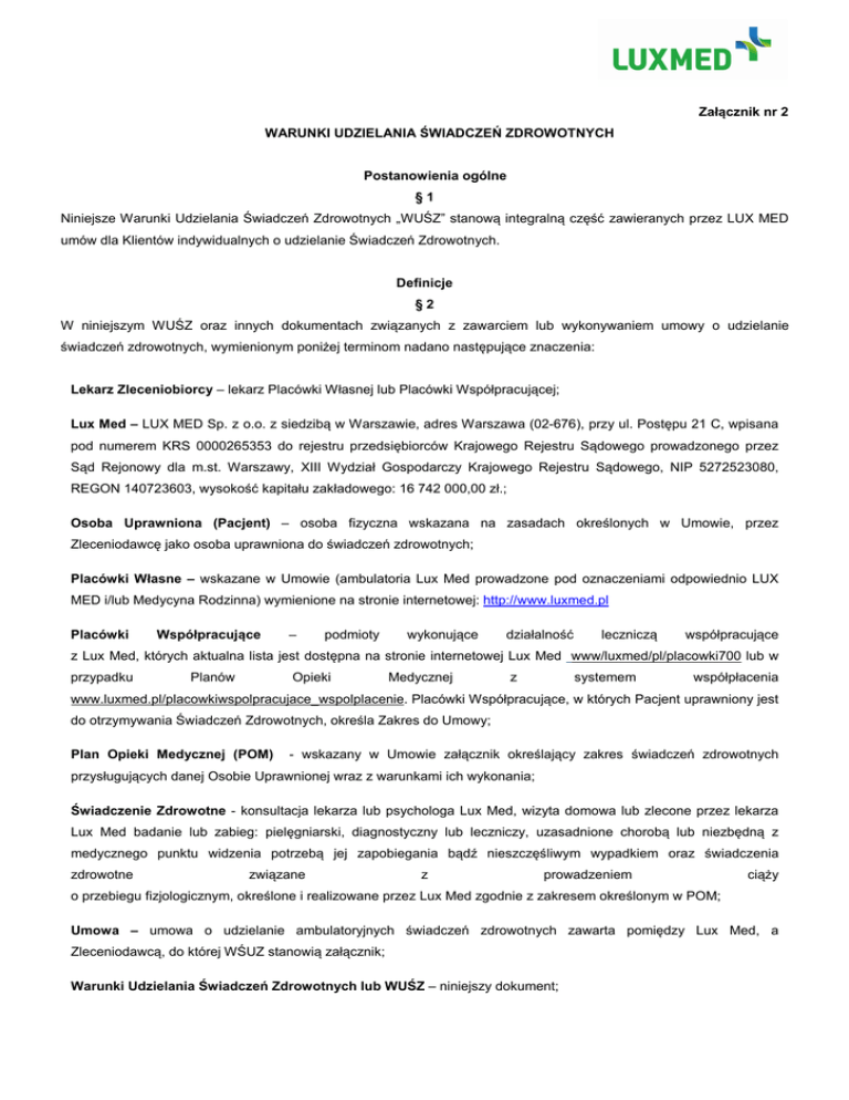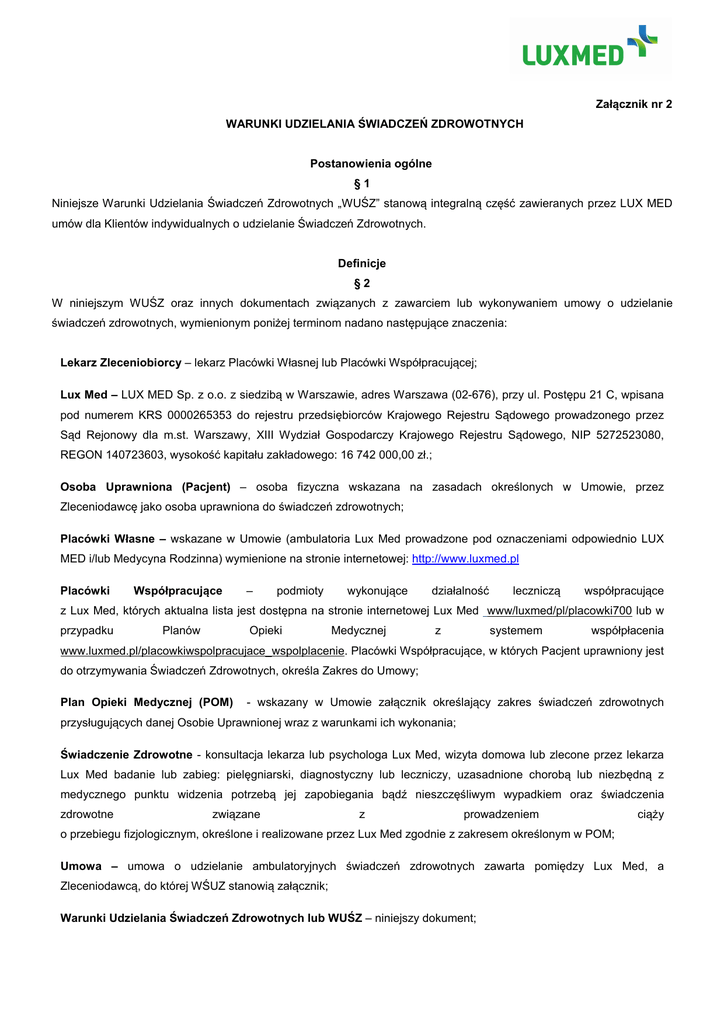 Załącznik nr 2 WARUNKI UDZIELANIA ŚWIADCZEŃ ZDROWOTNYCH Postanowienia ogólne §1 Niniejsze Warunki Udzielania Świadczeń Zdrowotnych „WUŚZ” stanową integralną część zawieranych przez LUX MED umów dla Klientów indywidualnych o udzielanie Świadczeń Zdrowotnych. Definicje §2 W niniejszym WUŚZ oraz innych dokumentach związanych z zawarciem lub wykonywaniem umowy o udzielanie świadczeń zdrowotnych, wymienionym poniżej terminom nadano następujące znaczenia: Lekarz Zleceniobiorcy – lekarz Placówki Własnej lub Placówki Współpracującej; Lux Med – LUX MED Sp. z o.o. z siedzibą w Warszawie, adres Warszawa (02-676), przy ul. Postępu 21 C, wpisana pod numerem KRS 0000265353 do rejestru przedsiębiorców Krajowego Rejestru Sądowego prowadzonego przez Sąd Rejonowy dla m.st. Warszawy, XIII Wydział Gospodarczy Krajowego Rejestru Sądowego, NIP 5272523080, REGON 140723603, wysokość kapitału zakładowego: 16 742 000,00 zł.; Osoba Uprawniona (Pacjent) – osoba fizyczna wskazana na zasadach określonych w Umowie, przez Zleceniodawcę jako osoba uprawniona do świadczeń zdrowotnych; Placówki Własne – wskazane w Umowie (ambulatoria Lux Med prowadzone pod oznaczeniami odpowiednio LUX MED i/lub Medycyna Rodzinna) wymienione na stronie internetowej: http://www.luxmed.pl Placówki Współpracujące – podmioty wykonujące działalność leczniczą współpracujące z Lux Med, których aktualna lista jest dostępna na stronie internetowej Lux Med www/luxmed/pl/placowki700 lub w przypadku Planów Opieki Medycznej z systemem współpłacenia www.luxmed.pl/placowkiwspolpracujace_wspolplacenie. Placówki Współpracujące, w których Pacjent uprawniony jest do otrzymywania Świadczeń Zdrowotnych, określa Zakres do Umowy; Plan Opieki Medycznej (POM) - wskazany w Umowie załącznik określający zakres świadczeń zdrowotnych przysługujących danej Osobie Uprawnionej wraz z warunkami ich wykonania; Świadczenie Zdrowotne - konsultacja lekarza lub psychologa Lux Med, wizyta domowa lub zlecone przez lekarza Lux Med badanie lub zabieg: pielęgniarski, diagnostyczny lub leczniczy, uzasadnione chorobą lub niezbędną z medycznego punktu widzenia potrzebą jej zapobiegania bądź nieszczęśliwym wypadkiem oraz świadczenia zdrowotne związane z prowadzeniem ciąży o przebiegu fizjologicznym, określone i realizowane przez Lux Med zgodnie z zakresem określonym w POM; Umowa – umowa o udzielanie ambulatoryjnych świadczeń zdrowotnych zawarta pomiędzy Lux Med, a Zleceniodawcą, do której WŚUZ stanowią załącznik; Warunki Udzielania Świadczeń Zdrowotnych lub WUŚZ – niniejszy dokument; Zleceniodawca – podmiot, który zawarł z Lux Med Umowę; W zależności od kontekstu, terminy wyrażone w liczbie pojedynczej mogą mieć znaczenie liczby mnogiej lub odwrotnie. Osoba uprawniona §3 1. Osobami uprawnionymi do otrzymywania świadczeń zdrowotnych w ramach Umowy są wyłącznie osoby wskazane przez Zleceniodawcę w Umowie. 2. Prawo Osoby Uprawnionej do określonych Świadczeń Zdrowotnych uzależnione jest od wieku Pacjenta i jest każdorazowo określone w POM. 3. Osoba Uprawniona nie może dokonać przelewu swoich praw wynikających z Umowy na osobę trzecią. Organizacja udzielania świadczeń zdrowotnych §4 1. Świadczenia Zdrowotne oferowane w ramach Umowy dostępne są wyłącznie w Placówkach Własnych oraz w Placówkach Współpracujących w godzinach ich funkcjonowania. 2. LUX MED jest uprawniony do zmiany listy Placówek Współpracujących z ważnych powodów, w szczególności w przypadku: − ogłoszenia upadłości podmiotu prowadzącego Placówkę Współpracującą; − wykreślenia podmiotu prowadzącego Placówkę Współpracującą z rejestru podmiotów wykonujących działalności leczniczą; − rozwiązania umowy zawartej pomiędzy LUX MED a podmiotem prowadzącym Placówkę Współpracującą wskutek wykreślenia tego podmiotu z Krajowego Rejestru Sądowego bądź Centralnej Ewidencji Działalności i Informacji Gospodarczej; − 3. rozwiązania umowy zawartej pomiędzy LUX MED a podmiotem prowadzącym Placówkę Współpracującą. "LUX MED jest uprawniony do zmiany listy Placówek Własnych z ważnych powodów, a w szczególności w przypadku: − wykreślenia danej Placówki Własnej z rejestru podmiotów wykonujących działalność leczniczą − wygaśnięcia zawartej przez LUX MED jako najemcę umowy najmu lokalu w którym prowadzona jest dana Placówka Własna; − rozwiązaniu, z przyczyn nie leżących po stronie LUX MED, zawartej przez LUX MED jako najemcę umowy najmu lokalu, w którym prowadzona jest dana Placówka Własna." 4. Warunkiem udzielenia świadczenia zdrowotnego w ramach Umowy uprzednie uzgodnienie terminu jego wykonania z LUX MED w sposób wskazany w punkcie 6 poniżej. 5. Termin wykonania Świadczenia Zdrowotnego w Placówkach Własnych można zarezerwować osobiście w Placówce Własnej lub za pośrednictwem: a. Infolinii LUX MED 22 33 22 888; b. Komunikatora e-center, który jest dostępny na stronie http://www.luxmed.pl; c. Aplikacji Portal Pacjenta, która jest dostępna na stronie www.luxmed.pl – po założeniu specjalnego konta i dopełnieniu pozostałych formalności rejestracyjnych. d. 6. Innego sposobu wskazanego przez Lux Med. Termin wykonania Świadczenia Zdrowotnego w Placówkach Współpracujących można zarezerwować osobiście w Placówce Współpracującej, dzwoniąc bezpośrednio do Placówki Współpracującej lub w inny sposób wskazany przez Lux Med. 7. Badania diagnostyczne i laboratoryjne wykonywane są w ramach Umowy wyłącznie na podstawie wskazań medycznych wynikających z procesu diagnostycznego i leczenia prowadzonego przez Lekarza Zleceniobiorcy oraz wystawionego przez Lekarza Zleceniobiorcy skierowania. Dotyczy to również pozostałych Świadczeń Zdrowotnych wymagających skierowania. 8. Korzystanie ze świadczeń zdrowotnych wykonywanych przez Zleceniodawcę odbywa się po o