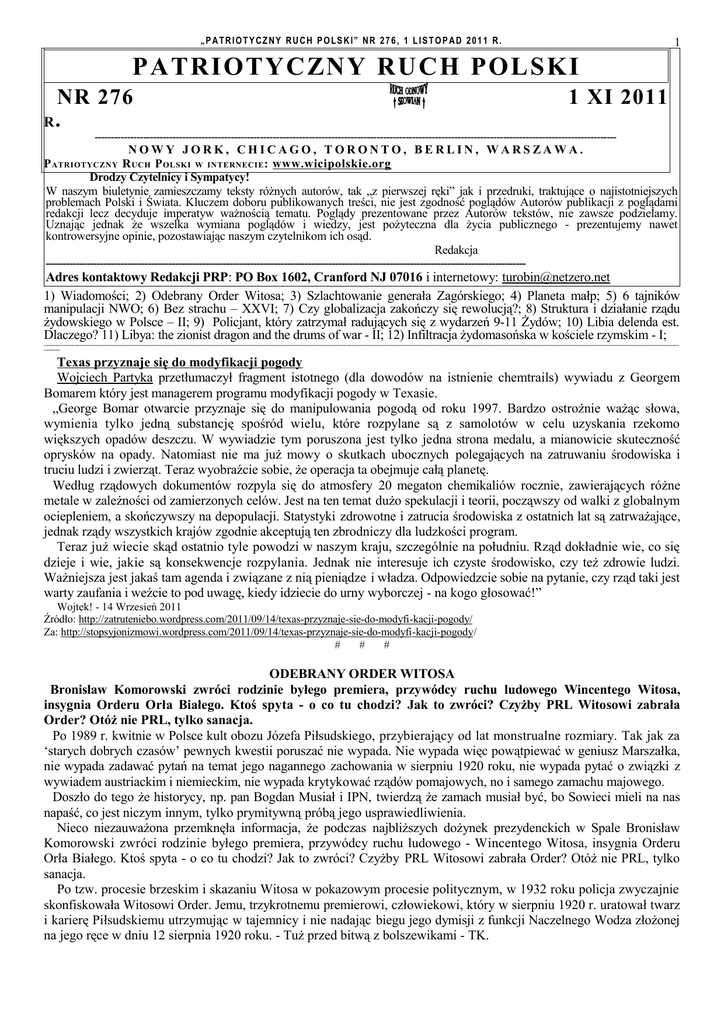 „PATRIOTYCZNY RUCH POLSKI” NR 276, 1 LISTOPAD 2011 R. 1 PATRIOTYCZNY RUCH POLSKI NR 276 R. 1 XI 2011 ----------------------------------------------------------------------------------------------------------------------------------------------------------------- NOWY JORK, CHICAGO, TORONTO, BERLIN, WARSZAWA. P ATRIOTYCZNY R UCH P OLSKI W INTERNECIE : www.wicipolskie.org Drodzy Czytelnicy i Sympatycy! W naszym biuletynie zamieszczamy teksty różnych autorów, tak „z pierwszej ręki” jak i przedruki, traktujące o najistotniejszych problemach Polski i Świata. Kluczem doboru publikowanych treści, nie jest zgodność poglądów Autorów publikacji z poglądami redakcji lecz decyduje imperatyw ważnością tematu. Poglądy prezentowane przez Autorów tekstów, nie zawsze podzielamy. Uznając jednak że wszelka wymiana poglądów i wiedzy, jest pożyteczna dla życia publicznego - prezentujemy nawet kontrowersyjne opinie, pozostawiając naszym czytelnikom ich osąd. Redakcja --------------------------------------------------------------------------------------------------------------------------------------------- Adres kontaktowy Redakcji PRP: PO Box 1602, Cranford NJ 07016 i internetowy: [email protected] 1) Wiadomości; 2) Odebrany Order Witosa; 3) Szlachtowanie generała Zagórskiego; 4) Planeta małp; 5) 6 tajników manipulacji NWO; 6) Bez strachu – XXVI; 7) Czy globalizacja zakończy się rewolucją?; 8) Struktura i działanie rządu żydowskiego w Polsce – II; 9) Policjant, który zatrzymał radujących się z wydarzeń 9-11 Żydów; 10) Libia delenda est. Dlaczego? 11) Libya: the zionist dragon and the drums of war - II; 12) Infiltracja żydomasońska w kościele rzymskim - I; ----------------------------------------------------------------------------------------------------------------------------------------------------------------------------------------------------------------------------------------------------------------------------------------------------------------------------------------------------------------------------------------------------------------- Texas przyznaje się do modyfikacji pogody Wojciech Partyka przetłumaczył fragment istotnego (dla dowodów na istnienie chemtrails) wywiadu z Georgem Bomarem który jest managerem programu modyfikacji pogody w Texasie. „George Bomar otwarcie przyznaje się do manipulowania pogodą od roku 1997. Bardzo ostrożnie ważąc słowa, wymienia tylko jedną substancję spośród wielu, które rozpylane są z samolotów w celu uzyskania rzekomo większych opadów deszczu. W wywiadzie tym poruszona jest tylko jedna strona medalu, a mianowicie skuteczność oprysków na opady. Natomiast nie ma już mowy o skutkach ubocznych polegających na zatruwaniu środowiska i truciu ludzi i zwierząt. Teraz wyobraźcie sobie, że operacja ta obejmuje całą planetę. Według rządowych dokumentów rozpyla się do atmosfery 20 megaton chemikaliów rocznie, zawierających różne metale w zależności od zamierzonych celów. Jest na ten temat dużo spekulacji i teorii, począwszy od walki z globalnym ociepleniem, a skończywszy na depopulacji. Statystyki zdrowotne i zatrucia środowiska z ostatnich lat są zatrważające, jednak rządy wszystkich krajów zgodnie akceptują ten zbrodniczy dla ludzkości program. Teraz już wiecie skąd ostatnio tyle powodzi w naszym kraju, szczególnie na południu. Rząd dokładnie wie, co się dzieje i wie, jakie są konsekwencje rozpylania. Jednak nie interesuje ich czyste środowisko, czy też zdrowie ludzi. Ważniejsza jest jakaś tam agenda i związane z nią pieniądze i władza. Odpowiedzcie sobie na pytanie, czy rząd taki jest warty zaufania i weźcie to pod uwagę, kiedy idziecie do urny wyborczej - na kogo głosować!” Wojtek! - 14 Wrzesień 2011 Źródło: http://zatruteniebo.wordpress.com/2011/09/14/texas-przyznaje-sie-do-modyfi -kacji-pogody/ Za: http://stopsyjonizmowi.wordpress.com/2011/09/14/texas-przyznaje-sie-do-modyfi -kacji-pogody/ # # # ODEBRANY ORDER WITOSA Bronisław Komorowski zwróci rodzinie byłego premiera, przywódcy ruchu ludowego Wincentego Witosa, insygnia Orderu Orła Białego. Ktoś spyta - o co tu chodzi? Jak to zwróci? Czyżby PRL Witosowi zabrała Order? Otóż nie PRL, tylko sanacja. Po 1989 r. kwitnie w Polsce kult obozu Józefa Piłsudskiego, przybierający od lat monstrualne rozmiary. Tak jak za ‘starych dobrych czasów’ pewnych kwestii poruszać nie wypada. Nie wypada więc powątpiewać w geniusz Marszałka, nie wypada zadawać pytań na temat jego nagannego zachowania w sierpniu 1920 roku, nie wypada pytać o związki z wywiadem austriackim i niemieckim, nie wypada krytykować rządów pomajowych, no i samego zamachu majowego. Doszło do tego że historycy, np. pan Bogdan Musiał i IPN, twierdzą że zamach musiał być, bo Sowieci mieli na nas napaść, co jest niczym innym, tylko prymitywną próbą jego usprawiedliwienia. Nieco niezauważona przemknęła informacja, że podczas najbliższych dożynek prezydenckich w Spale Bronisław Komorowski zwróci rodzinie byłego premiera, przywódcy ruchu ludowego - Wincentego Witosa, insygnia Orderu Orła Białego. Ktoś spyta - o co tu chodzi? Jak to zwróci? Czyżby PRL Witosowi zabrała Order? Otóż nie PRL, tylko sanacja. Po tzw. procesie brzeskim i skazaniu Witosa w pokazowym procesie politycznym, w 1932 roku policja zwyczajnie skonfiskowała Witosowi Order. Jemu, trzykrotnemu premierowi, człowiekowi, który w sierpniu 1920 r. uratował twarz i karierę Piłsudskiemu utrzymując w tajemnicy i nie nadając biegu jego dymisji z funkcji Naczelnego Wodza złożonej na jego ręce w dniu 12 sierpnia 1920 roku. - Tuż przed bitwą z bolszewikami - TK. 2 „PATRIOTYCZNY RUCH POLSKI” NR 276, 1 LISTOPAD 2011 R. Dodajmy tylko, że podczas zamachu majowego oficerowie Piłsudskiego włamali się do szafy pancernej premiera Witosa szukając odpisu tego dokumentu. Order Orła Białego przywrócił Witos