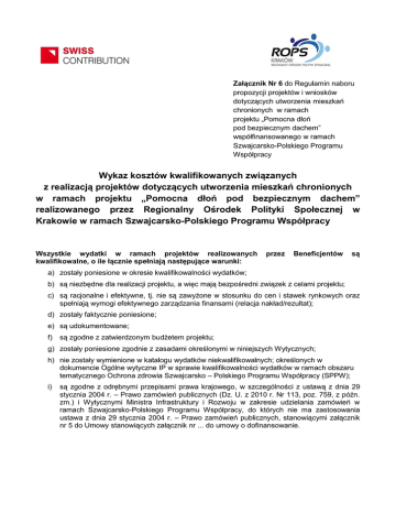 Załącznik Nr 6 do Regulamin naboru propozycji projektów i wniosków dotyczących utworzenia mieszkań chronionych w ramach projektu „Pomocna dłoń pod bezpiecznym dachem” współfinansowanego w ramach Szwajcarsko-Polskiego Programu Współpracy Wykaz kosztów kwalifikowanych związanych z realizacją projektów dotyczących utworzenia mieszkań chronionych w ramach projektu „Pomocna dłoń pod bezpiecznym dachem” realizowanego przez Regionalny Ośrodek Polityki Społecznej w Krakowie w ramach Szwajcarsko-Polskiego Programu Współpracy Wszystkie wydatki w ramach projektów realizowanych kwalifikowalne, o ile łącznie spełniają następujące warunki: przez Beneficjentów są a) zostały poniesione w okresie kwalifikowalności wydatków; b) są niezbędne dla realizacji projektu, a więc mają bezpośredni związek z celami projektu; c) są racjonalne i efektywne, tj. nie są zawyżone w stosunku do cen i stawek rynkowych oraz spełniają wymogi efektywnego zarządzania finansami (relacja nakład/rezultat); d) zostały faktycznie poniesione; e) są udokumentowane; f) są zgodne z zatwierdzonym budżetem projektu; g) zostały poniesione zgodnie z zasadami określonymi w niniejszych Wytycznych; h) nie zostały wymienione w katalogu wydatków niekwalifikowalnych; określonych w dokumencie Ogólne wytyczne IP w sprawie kwalifikowalności wydatków w ramach obszaru tematycznego Ochrona zdrowia Szwajcarsko – Polskiego Programu Współpracy (SPPW); i) są zgodne z odrębnymi przepisami prawa krajowego, w szczególności z ustawą z dnia 29 stycznia 2004 r. – Prawo zamówień publicznych (Dz. U. z 2010 r. Nr 113, poz. 759, z późn. zm.) i Wytycznymi Ministra Infrastruktury i Rozwoju w zakresie udzielania zamówień w ramach Szwajcarsko-Polskiego Programu Współpracy, do których nie ma zastosowania ustawa z dnia 29 stycznia 2004 r. – Prawo zamówień publicznych, stanowiącymi załącznik nr 5 do Umowy stanowiących załącznik nr ... do umowy o dofinansowanie. Katalog rodzajowy wydatków kwalifikowanych1 1. Wydatki poniesione na merytoryczną i techniczną realizację projektu: A. koszty organizacji szkoleń, kursów, warsztatów, seminariów, itp. (w tym: wynajem sal, wynajem sprzętu multimedialnego, catering dla uczestników, przygotowanie i powielenie materiałów edukacyjnych, wynagrodzenia szkoleniowców oraz prelegentów). W szczególności dopuszcza się kwalifikowalność szkoleń powiązanych przedmiotowo z rodzajem realizowanej w ramach projektu inwestycji. Zakres tematyczny szkoleń, których koszty kwalifikują się do współfinansowania w ramach projektu obejmują m.in. następujące zagadnienia: 1) Praca z osobami niepełnosprawnymi, 2) Techniki komunikowania z grupą docelową, 3) Nowoczesne formy terapii zajęciowej. W ramach kosztów szkoleń dla personelu domów pomocy społecznej do dofinansowania kwalifikować się będą koszty dojazdów oraz koszty noclegów uczestników szkoleń, pod następującymi warunkami: 1) udział w szkoleniach odbywa się w ramach delegacji służbowej, udokumentowanej pisemnym poleceniem wyjazdu, 2) koszty dojazdów oraz noclegów rozliczane są zgodnie z zasadami rozliczania krajowej delegacji służbowej, oraz z wykorzystaniem druków obowiązujących w danej instytucji dla udokumentowania delegacji służbowej, tj. zgodnie z zasadami określonymi w rozporządzeniu ministra pracy i polityki społecznej z dnia 23 stycznia 2013 r. (Dz.U. 2013 poz. 167) 3) koszty dojazdów oraz noclegów nie przekroczą 10% całkowitego budżetu Komponentu 2. 2. Prace inwestycyjne (maksymalny udział wydatków inwestycyjnych nie może przekroczyć 96% całkowitych kosztów kwalifikowalnych projektu): rozbudowa/przebudowa/adaptacja/ modernizacja pomieszczeń mieszkalnych; rozbudowa/przebudowa/adaptacja/ modernizacja pomieszczeń sanitarnych, kuchennych, balkonu/loggi, komunikacji wewnątrz mieszkania; koszty prac: budowlano-montażowych, instalacyjnych, wykończeniowych; koszty nadzoru inwestorskiego; koszty nadzoru autorskiego; koszty siły roboczej, z wyłączeniem pracowników Beneficjenta, materiałów, użycia sprzętu niezbędnego do realizacji inwestycji; koszt trwałego wyposażenia oraz zakupu środków trwałych, które będą na stałe zainstalowane w obiekcie realizowanym w ramach programu pod warunkiem, że środki te będą włączone w rejestr środków trwałych placówki Beneficjenta oraz wydatek ten będzie traktowany jako inwestycyjny zgodnie z zasadami rachunkowości2; 1 Katalog rodzajowy wydatków kwalifikowanych nie wyczerpuje rodzaju kosztów jakie mogą być uznane za kwalifikowane pod warunkiem spełnienia ogólnej definicji kwalifikowalności kosztów przyjętej w ramach niniejszych wytycznych oraz innych dokumentów programowych obowiązujących w ramach Obszaru tematycznego Ochrona zdrowia SPPW. Przywołane w katalogu rodzaje kosztów mają charakter przykładowy w związku z czym nie stanowią enumeratywnego, zamkniętego katalogu. 2 wydatek traktowany jako inwestycyjny zgodnie z zasadami o rachunkowości, np. pierwsze wyposażanie lub wydatek powyżej 3500,00 zł koszt zakupu sprzętu i wyposażenia związanego z realizacją projektu, pod warunkiem, że wspomniane składniki majątku trwałego podlegają amortyzacji zgodnie z odpowiednimi przepisami; zakupiony sprzęt musi być niezbędny i wykorzystywany bezpośrednio do realizacji projektu2; koszty zakupu i użycia aktywów niematerialnych (np. patenty, licencje) niezbędnych i wykorzystywanych bezpośrednio dla celów realizacji projektu (z wyłączeniem kosztów nabycia systemów zarządzania, monitorowania i ewaluacji) 2. 3. Wydatki nieinwestycyjne: remont pomieszczeń mieszkalnych, sanitarnych, kuchennych, balkonu/loggi, komunikacji wewnątrz mieszkania; koszt zakupu sprzętu i wyposażenia związanego z realizacją programu, pod warunkiem, że wspomniane składniki majątku trwałego podlegają amortyzacji zgodnie z odpowiednimi przepisami; zakupiony sprz