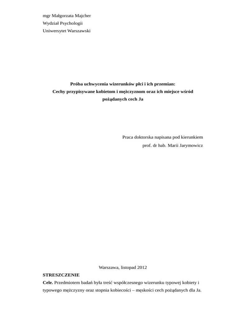 mgr Małgorzata Majcher Wydział Psychologii Uniwersytet Warszawski Próba uchwycenia wizerunków płci i ich przemian: Cechy przypisywane kobietom i mężczyznom oraz ich miejsce wśród pożądanych cech Ja Praca doktorska napisana pod kierunkiem prof. dr hab. Marii Jarymowicz Warszawa, listopad 2012 STRESZCZENIE Cele. Przedmiotem badań była treść współczesnego wizerunku typowej kobiety i typowego mężczyzny oraz stopnia kobiecości – męskości cech pożądanych dla Ja. Badania miały na celu opracowanie specjalnych metod oraz (1) wyodrębnienie puli cech uznanych za typowo kobiece i typowo męskie, (2) uchwycenie proporcji tych cech przypisanych typowej kobiecie i typowemu mężczyźnie, (3) uchwycenie proporcji cech kobiecych i męskich wymienionych wśród pożądanych cech Ja, (4) pomiar stopnia, w jakim na poszczególnych cechach Ja zależy /a/ samej osobie badanej, /b/ jej otoczeniu. Metody. W związku z celem (1) przeprowadzona została seria badań nad opracowaniem narzędzia służącego wyłonieniu puli cech uznanych za specyficznie kobiece i męskie. Powstała metoda, ta sama pula cech przypisywana była raz „typowej kobiecie” a raz „typowemu mężczyźnie”, a określone natężenia cech przypisanych reprezentantom płci były podstawą opracowania zbioru cech kobiecych i zbioru cech męskich. To autorskie narzędzie użyte zostało w badaniu właściwym, w związku z celem (2) – do pomiaru proporcji cech kobiecych i męskich w wizerunku typowych reprezentantów płci. Dla realizacji celów (3) i (4) zastosowana została technika „Moje cechy pożądane” (Chrzanowska, 2009): uczestnicy mieli generować dowolną liczbę cech, które by chcieli posiadać i rozwijać oraz odpowiadali na pytania – o to w jakim stopniu na danej cesze zależy otoczeniu, a w jakim im samym. Osoby badane. W przebadanej próbie właściwej (N=328) uczestniczyło 173 kobiet i 155 mężczyzn – osób wykształconych (studiujących bądź posiadających wyższe wykształcenie), wieku od 19 do 72 lat (M=32,31; SD=12,69). Osoby te przebadano za pośrednictwem internetu lub w kontakcie bezpośrednim. Główne rezultaty: wizerunek typowej kobiety i typowego mężczyzny. Każdemu z reprezentantów płci przypisano zarówno cechy kobiece, jak i cechy męskie (istotnie więcej cech specyficznych niż niespecyficznych), ale typowej kobiecie przypisano istotnie więcej cech męskich niż typowemu mężczyźnie cech kobiecych (z tym, że atrybuty męskie przypisały kobietom w większym stopniu badane kobiety niż badani mężczyźni). Pożądane cechy Ja i ich związek z oczekiwaniami innych i własnymi. Osoby badane wymieniły łącznie najmniej cech uznanych przez sędziów za kobiece, a więcej zarówno cech męskich, jak i androgynicznych. Niezależnie od wieku badane kobiety wygenerowały cechy Ja o istotnie wyższych natężeniach w zakresie cech kobiecych niż w zakresie cech męskich, a badani mężczyźni wygenerowali cechy Ja o podobnych natężeniach w zakresie cech kobiecych i 2 męskich. Co do związków pomiędzy stopniem kobiecości czy męskości pożądanych cech Ja, a stopniem oczekiwań własnych oraz spostrzeganych oczekiwań społecznych - z analiz korelacji i regresji wynika, że inne są związki pomiędzy stopniem oczekiwań JA CHCĘ i INNI CHCĄ, a stopniem pożądanych cech kobiecych i męskich w zależności od płci osób badanych. I tak, wśród badanych kobiet: im bardziej wymieniona cecha uznana była przez sędziów za kobiecą – tym mniej JA CHCĘ i tym bardziej INNI CHCĄ, a im bardziej cecha męska tym bardziej JA CHCĘ i tym mniej INNI CHCĄ. Natomiast wśród badanych mężczyzn: nie wystąpił istotny związek pomiędzy stopniem pożądanych cech kobiecych lub męskich i stopniem w jakim JA CHCĘ, a wystąpił dodatni związek między pożądanymi cechami kobiecymi i stopniem INNI CHCĄ. Wiek osób badanych nie miał żadnego wpływu na wyniki analiz. Konkluzje. Porównanie uznanych za typowe wizerunków kobiet i mężczyzn pokazało, że współczesnym kobietom przypisano więcej cech płci „przeciwnej“ niż mężczyznom. Czy można to uznać za spójne z aspiracjami kobiet? Tak sugerują dalsze analizy. Wśród 1084 pożądanych cech Ja wygenerowanych przez kobiety były cechy zarówno kobiece, jak i męskie, ale korelacje wskazują na to, że te pierwsze ceni sobie (zdaniem osób badanych) otoczenie, a te drugie same osoby badane. Badani mężczyźni także wymienili cechy zarówno kobiece, jak i męskie, a zarazem zadeklarowali, że chcieliby je mieć w podobnym stopniu; sądzą jednak, że im bardziej kobieca cecha, tym bardziej otoczenie chciałoby aby osoba badana je miała. Uzyskane dane sugerują, że cechy męskie są dla kobiet atrakcyjne, a cech kobiecych oczekuje od badanych mężczyzn otoczenie. Łącznie wyniki zdają się stanowić pewną przesłankę dla przewidywania zmian co do pożądanych cech ludzi różnej płci: w kierunku wzrostu androgyniczności. 3 Słowa kluczowe: społeczne kategoryzacje, prototypy i stereotypy płci, kobiecość – męskość cech psychicznych, standardy JaSPIS TREŚCI 4 SŁOWO WSTĘPNE Wizerunki płci pozostają w ścisłym związku z funkcjonowaniem ludzi. Wywierają istotny wpływ na relacje społeczne. Dotyczy to nie tylko spostrzegania reprezentantów obu płci, ale także realnego statusu społecznego oraz postaw i zachowań społecznych wobec kobiet i mężczyzn. Reprezentacje umysłowe dużych zbiorowości ludzi mają postać uogólnień, które funkcjonują bez względu na to, na ile mogą być trafne w odniesieniu do poszczególnych osób. Mają często postać stereotypów – struktur sztywnych i opornych na zmiany, bo trudno jest je zweryfikować w kontakcie z konkretnymi osobami. Bywają więc w realnym życiu społecznym źródłem napięć, a nawet realnych konfliktów. Sztywność stereotypów nie jest jednak bezwarunkowa. Poznawcze reprezentacje ulegają pewnym zmianom, zwłaszc