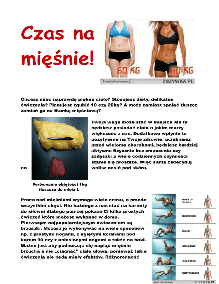Czas na mięśnie! Chcesz mieć naprawdę piękne ciało? Stosujesz diety, delikatne ćwiczenia? Planujesz zgubić 10 czy 20kg? A może zamiast spalać tłuszcz zamień go na tkankę mięśniową? Twoja waga może stać w miejscu ale ty będziesz posiadać ciało o jakim marzy większość z nas. Dodatkowo wpłynie to pozytywnie na Twoje zdrowie, uciekniesz przed wieloma chorobami, będziesz bardziej aktywna fizycznie bez zmęczenia czy zadyszki a wiele codziennych czynności stanie się prostsze. Więc sama zadecyduj wolisz nosić pod skórą. co Porównanie objętości 1kg tłuszczu do mięśni. Praca nad mięśniami wymaga wiele czasu, a przede wszystkim chęci. Nie każdego z nas stać na karnety do siłowni dlatego poniżej pokaże Ci kilka prostych ćwiczeń które możesz wykonać w domu. Pierwszym najpopularniejszym ćwiczeniem są brzuszki. Możesz je wykonywać na wiele sposobów np. z prostymi nogami, z ugiętymi kolanami pod kątem 90 czy z uniesionymi nogami a także na boki. Ważne jest aby podnosząc się napiąć mięśnie brzucha a nie „ciągnąć” ciało głową, ponieważ takie ćwiczenia nie będą miały efektów. Różnorodność brzuszków sprawia że angażują się wszystkie partie mięśni. O następnym zestawie ćwiczeń słyszała już większość z nas aerobiczna szóstka weidera „A6W”: Plan co prawda długi ale wykonany prawidłowo daje wspaniałe efekty. Jako trzeci zestaw proponuje ABS. Wiele osób zamiast A6W wybiera ten zestaw ze względu na krótszy czas ćwiczeń ale również wspaniały efekt. Brzuszek już mamy teraz czas na nogi! Wiele z nas zwraca na nie największą uwagę dlatego ważne jest aby były zadbane a także miały piękny kształt. Najczęściej wykonywane ćwiczenia polegają na unoszeniu obciążenia do kąta prostego siedząc, unoszeniu nóg „pulsacyjnie” czy tez przysiady. Ważne jest aby cały czas stać na całych stopach, unosząc się na palce mięśnie nie pracują tak jak powinny i dodatkowo możesz nabawić się kontuzji. Możesz wykonywać również stepy, których mamy mnóstwo rodzai głównie z aerobiku, wykroki do przodu, wykroki wznosząc się na stopień, wykroki pojedyncze w bok lub podwójne. Wykonując te wszystkie ćwiczenia utrzymuj cały czas delikatnie ugięte kolana oraz nie przerywaj ćwiczeń, w końcu chodzi o to aby mięśnie zaczęły pracować. Pamiętaj, że efekty nie będą widoczne po tygodniu więc wytrwale walcz o piękne ciało i stań się motywacja dla innych :)