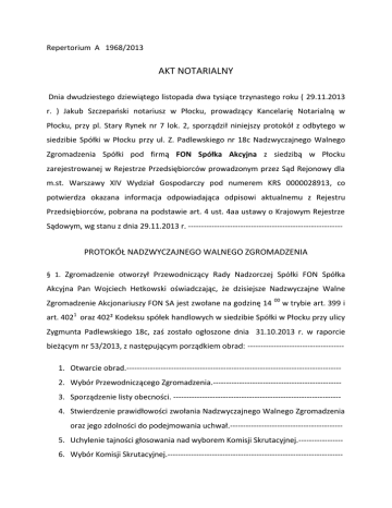 Repertorium A 1968/2013 AKT NOTARIALNY Dnia dwudziestego dziewiątego listopada dwa tysiące trzynastego roku ( 29.11.2013 r. ) Jakub Szczepański notariusz w Płocku, prowadzący Kancelarię Notarialną w Płocku, przy pl. Stary Rynek nr 7 lok. 2, sporządził niniejszy protokół z odbytego w siedzibie Spółki w Płocku przy ul. Z. Padlewskiego nr 18c Nadzwyczajnego Walnego Zgromadzenia Spółki pod firmą FON Spółka Akcyjna z siedzibą w Płocku zarejestrowanej w Rejestrze Przedsiębiorców prowadzonym przez Sąd Rejonowy dla m.st. Warszawy XIV Wydział Gospodarczy pod numerem KRS 0000028913, co potwierdza okazana informacja odpowiadająca odpisowi aktualnemu z Rejestru Przedsiębiorców, pobrana na podstawie art. 4 ust. 4aa ustawy o Krajowym Rejestrze Sądowym, wg stanu z dnia 29.11.2013 r. ----------------------------------------------------------- PROTOKÓŁ NADZWYCZAJNEGO WALNEGO ZGROMADZENIA § 1. Zgromadzenie otworzył Przewodniczący Rady Nadzorczej Spółki FON Spółka Akcyjna Pan Wojciech Hetkowski oświadczając, że dzisiejsze Nadzwyczajne Walne Zgromadzenie Akcjonariuszy FON SA jest zwołane na godzinę 14 00 w trybie art. 399 i art. 4021 oraz 402² Kodeksu spółek handlowych w siedzibie Spółki w Płocku przy ulicy Zygmunta Padlewskiego 18c, zaś zostało ogłoszone dnia 31.10.2013 r. w raporcie bieżącym nr 53/2013, z następującym porządkiem obrad: ------------------------------------1. Otwarcie obrad.---------------------------------------------------------------------------------2. Wybór Przewodniczącego Zgromadzenia.------------------------------------------------3. Sporządzenie listy obecności. ---------------------------------------------------------------4. Stwierdzenie prawidłowości zwołania Nadzwyczajnego Walnego Zgromadzenia oraz jego zdolności do podejmowania uchwał.------------------------------------------5. Uchylenie tajności głosowania nad wyborem Komisji Skrutacyjnej.----------------6. Wybór Komisji Skrutacyjnej.------------------------------------------------------------------- 7. Przyjęcie porządku obrad.-------------------------------------------------------------------8. Przedstawienie istotnych elementów treści planu połączenia Spółki ze spółkami: ATLANTIS Energy S.A. z siedzibą w Płocku, Stark Development S.A. z siedzibą w Chorzowie, Urlopy.pl S.A. z siedzibą w Płocku oraz FON Ecology S.A. z siedzibą w Płocku, sprawozdania Zarządu z dnia 24 października 2013 roku sporządzonego dla celów połączenia, opinii biegłego z dnia 24 października 2013 roku z badania planu połączenia oraz wszelkich istotnych zmian w zakresie aktywów i pasywów, które nastąpiły między dniem sporządzenia planu połączenia a dniem powzięcia uchwały.-------------------------------------------9. Podjęcie uchwały w sprawie udzielenia Zarządowi Spółki upoważnienia do nabycia własnych akcji Spółki o łącznej wartości nominalnej nieprzekraczającej 10% kapitału zakładowego w celu wydania akcji akcjonariuszom spółek przejmowanych na podstawie art. 515 § 2 k.s.h.---------------------------------------10. Podjęcie uchwały w sprawie połączenia Spółki ze spółkami: ATLANTIS Energy S.A. z siedzibą w Płocku, Stark Development S.A. z siedzibą w Chorzowie, Urlopy.pl S.A. z siedzibą w Płocku oraz FON Ecology S.A. z siedzibą w Płocku, w trybie art. 492 § 1 pkt 1 k.s.h.---------------------------------------------------------------11. Podjęcie uchwały w sprawie umorzenia akcji własnych spółki.----------------------12. Podjęcie uchwały w sprawie obniżenia kapitału zakładowego i zmiany Statutu Spółki.--------------------------------------------------------------------------------------------13. Podjęcie uchwały w sprawie upoważnienia Rady Nadzorczej do sporządzenia tekstu jednolitego Statutu Spółki. ----------------------------------------------------------14. Zmiany w składzie Rady Nadzorczej Spółki. -----------------------------------------------15. Zamknięcie obrad Walnego Zgromadzenia.------------------------------------------------ Do punktu 2 porządku obrad.--------------------------------------------------------------------------Następnie reprezentująca akcjonariusza DAMF Invest SA z/s w Płocku Prezes Zarządu Małgorzata Patrowicz przedstawiła swoją kandydaturę na Przewodniczącego Zgromadzenia i poddała ją pod głosowanie: -------------------------------------------------------- UCHWAŁA NUMER 1 Nadzwyczajnego Walnego Zgromadzenia FON SA Spółki Akcyjnej z siedzibą w Płocku z dnia 29 listopada 2013 roku w sprawie: wyboru Przewodniczącego Nadzwyczajnego Walnego Zgromadzenia §1 Na podstawie art. 409 § 1 Kodeksu Spółek Handlowych, Walne Zgromadzenie powołuje Panią Małgorzatę Patrowicz ( dane osobowe ) na Przewodniczącą Nadzwyczajnego Walnego Zgromadzenia.--------------------------------------------------------- §2 Uchwała wchodzi w życie z dniem podjęcia.------------------------------------------------------ W głosowaniu tajnym, w którym brało udział 751 520 847 akcji dysponujących tyluż głosami, oddano 751 520 847 ważnych głosów, co stanowi 74,55 % kapitału zakładowego, za uchwałą oddano 751 520 847 głosów, przeciwnych i wstrzymujących się nie było, zatem uchwała została podjęta jednogłośnie. ------------------------------------- W tym miejscu Przewodnicząca Zgromadzenia stwierdziła, że Nadzwyczajne Walne Zgromadzenie odbywa się w trybie art. 399 Kodeksu spółek handlowych, na Zgromadzeniu obecni są akcjonariusz Spółka DAMF Invest SA z siedzibą w Płocku, adres: Z. Padlewskiego 18c, 09-402 Płock, zarejestrowanej w Rejestrze Przedsiębiorców prowadzonym przez Sąd Rejonowy dla m.st. Warszawy XIV Wydział Gospodarczy pod numerem KRS 0000392143, która dokonała rejestracji na Nadzwyczajnym Walnym Zgromadzeniu odbywającym się w dniu dzisiejszym z 701 520 847 akcji i dysponuje tyluż głosami oraz akcjonariusz Spółka DAMF C