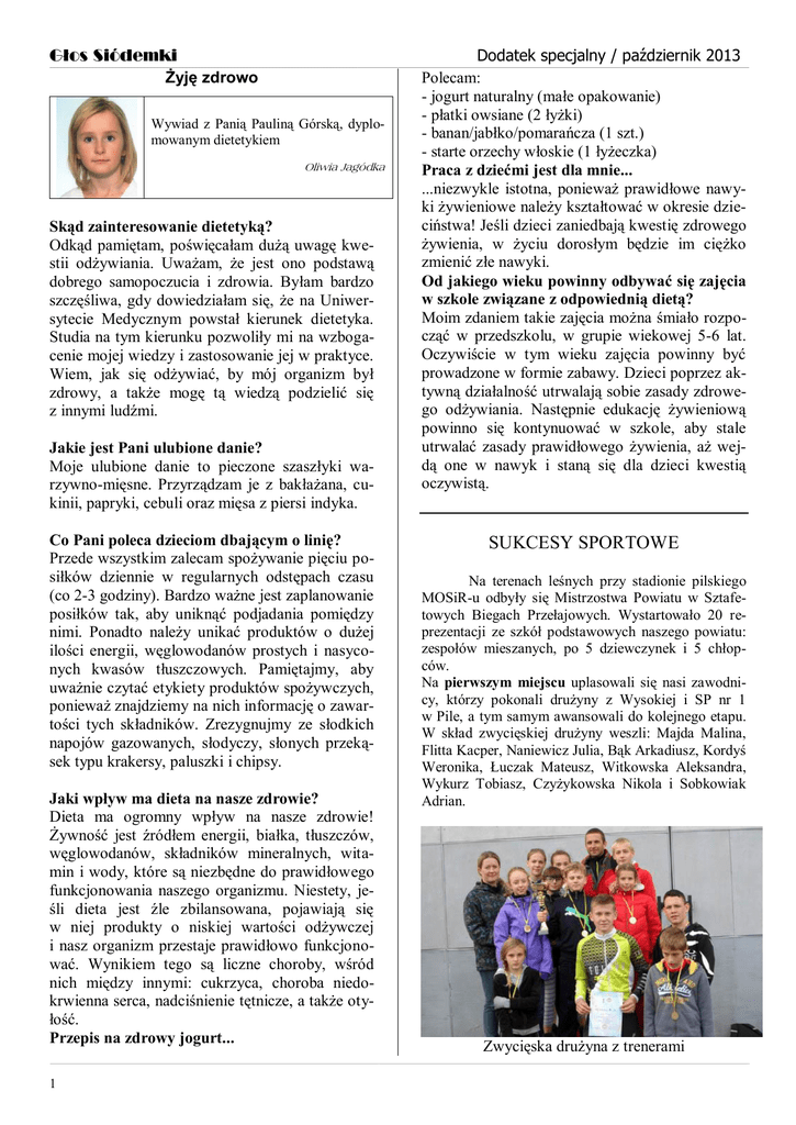 Głos Siódemki Żyję zdrowo Dodatek specjalny / październik 2013 Polecam: - jogurt naturalny (małe opakowanie) - płatki owsiane (2 łyżki) - banan/jabłko/pomarańcza (1 szt.) - starte orzechy włoskie (1 łyżeczka) Praca z dziećmi jest dla mnie... ...niezwykle istotna, ponieważ prawidłowe nawyki żywieniowe należy kształtować w okresie dzieciństwa! Jeśli dzieci zaniedbają kwestię zdrowego żywienia, w życiu dorosłym będzie im ciężko zmienić złe nawyki. Od jakiego wieku powinny odbywać się zajęcia w szkole związane z odpowiednią dietą? Moim zdaniem takie zajęcia można śmiało rozpocząć w przedszkolu, w grupie wiekowej 5-6 lat. Oczywiście w tym wieku zajęcia powinny być prowadzone w formie zabawy. Dzieci poprzez aktywną działalność utrwalają sobie zasady zdrowego odżywiania. Następnie edukację żywieniową powinno się kontynuować w szkole, aby stale utrwalać zasady prawidłowego żywienia, aż wejdą one w nawyk i staną się dla dzieci kwestią oczywistą. ____________________________________________________________________________________________________________________________________________________________________________________________________________________________________________________________________________________________________________________________________________________________________________________________________________________________________________________ Wywiad z Panią Pauliną Górską, dyplomowanym dietetykiem Oliwia Jagódka Skąd zainteresowanie dietetyką? Odkąd pamiętam, poświęcałam dużą uwagę kwestii odżywiania. Uważam, że jest ono podstawą dobrego samopoczucia i zdrowia. Byłam bardzo szczęśliwa, gdy dowiedziałam się, że na Uniwersytecie Medycznym powstał kierunek dietetyka. Studia na tym kierunku pozwoliły mi na wzbogacenie mojej wiedzy i zastosowanie jej w praktyce. Wiem, jak się odżywiać, by mój organizm był zdrowy, a także mogę tą wiedzą podzielić się z innymi ludźmi. Jakie jest Pani ulubione danie? Moje ulubione danie to pieczone szaszłyki warzywno-mięsne. Przyrządzam je z bakłażana, cukinii, papryki, cebuli oraz mięsa z piersi indyka. Co Pani poleca dzieciom dbającym o linię? Przede wszystkim zalecam spożywanie pięciu posiłków dziennie w regularnych odstępach czasu (co 2-3 godziny). Bardzo ważne jest zaplanowanie posiłków tak, aby uniknąć podjadania pomiędzy nimi. Ponadto należy unikać produktów o dużej ilości energii, węglowodanów prostych i nasyconych kwasów tłuszczowych. Pamiętajmy, aby uważnie czytać etykiety produktów spożywczych, ponieważ znajdziemy na nich informację o zawartości tych składników. Zrezygnujmy ze słodkich napojów gazowanych, słodyczy, słonych przekąsek typu krakersy, paluszki i chipsy. Jaki wpływ ma dieta na nasze zdrowie? Dieta ma ogromny wpływ na nasze zdrowie! Żywność jest źródłem energii, białka, tłuszczów, węglowodanów, składników mineralnych, witamin i wody, które są niezbędne do prawidłowego funkcjonowania naszego organizmu. Niestety, jeśli dieta jest źle zbilansowana, pojawiają się w niej produkty o niskiej wartości odżywczej i nasz organizm przestaje prawidłowo funkcjonować. Wynikiem tego są liczne choroby, wśród nich między innymi: cukrzyca, choroba niedokrwienna serca, nadciśnienie tętnicze, a także otyłość. Przepis na zdrowy jogurt... SUKCESY SPORTOWE Na terenach leśnych przy stadionie pilskiego MOSiR-u odbyły się Mistrzostwa Powiatu w Sztafetowych Biegach Przełajowych. Wystartowało 20 reprezentacji ze szkół podstawowych naszego powiatu: zespołów mieszanych, po 5 dziewczynek i 5 chłopców. Na pierwszym miejscu uplasowali się nasi zawodnicy, którzy pokonali drużyny z Wysokiej i SP nr 1 w Pile, a tym samym awansowali do kolejnego etapu. W skład zwycięskiej drużyny weszli: Majda Malina, Flitta Kacper, Naniewicz Julia, Bąk Arkadiusz, Kordyś Weronika, Łuczak Mateusz, Witkowska Aleksandra, Wykurz Tobiasz, Czyżykowska Nikola i Sobkowiak Adrian. Zwycięska drużyna z trenerami _________________________________________________________________________________________________________________________________________________________________________________________________________________________________________________________________________________________________________________________________________________________________________________________________________________________________________________________________________________________________________________________________________________________________ 1 Głos Siódemki Dodatek specjalny / październik 2013 ____________________________________________________________________________________________________________________________________________________________________________________________________________________________________________________________________________________________________________________________________________________________________________________________________________________________________________________ WOJEWÓDZKIE BIEGI PRZEŁAJOWE 11 października na terenach poznańskiej Woli odbył się organizowany przez Szkolny Związek Sportowy finał Wielkopolskich Igrzysk Młodzieży Szkolnej w Sztafetowych Biegach Przełajowych. Wystartowały 42 drużyny z całego województwa, a wśród nich nasza ekipa. Uczniowie spisali się bardzo dobrze, po raz pierwszy zdobywając medal w tej konkurencji dla naszej szkoły. Zajęli trzecie miejsce ustępując szkołom z Krzyża Wielkopolskiego i z Szamotuł. W skład brązowej drużyny weszli: Naniewicz Julia, Flitta Kacper, Witkowska Aleksandra, Sobkowiak Adrian, Czyżykowska Nikola, Bąk Arkadiusz, Majda Malina, Łuczak Mateusz, Wojtasik Wiktoria, Wykurz Tobiasz, Kordyś Weronika i Kopyciak Dawid. Sprawdzian swoich umiejętności zaliczyli na szóstkę, z czego bardzo cieszyli się trenerzy: Małgorzata i Marek W