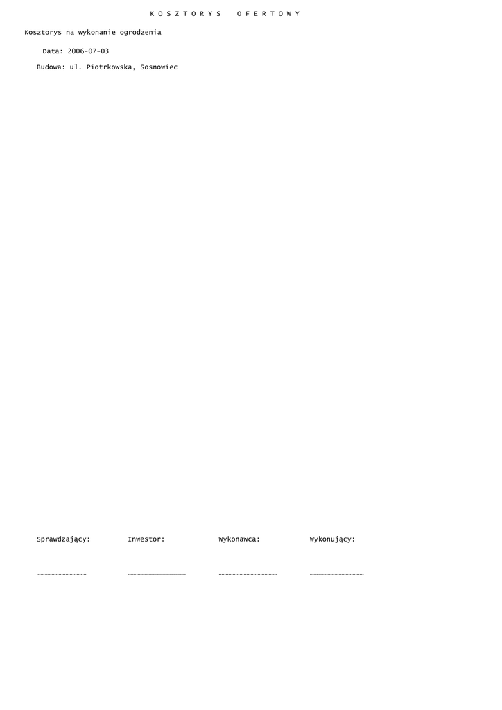 K O S Z T O R Y S O F E R T O W Y Kosztorys na wykonanie ogrodzenia Data: 2006-07-03 Budowa: ul. Piotrkowska, Sosnowiec Sprawdzający: Inwestor: Wykonawca: Wykonujący: ……………………………… …………………………………… …………………………………… ………………………………… Kosztorys na wykonanie ogrodzenia 03/07/06 Przedmiar Robót Podstawa nakładu, opis pozycji, wyliczenie ilości robót Ilość Krot. Jedn. 1 ROBOTY TOWARZYSZĄCE 1.001 KNNR 5/719/7 Rozebranie nawierzchni i chodników, płyty chodnikowe betonowe 35x35x5 na podsypce piaskowej, ręcznie KNR 11/322/3 Chodniki z kostki betonowej „Polbruk grubości 60·mm” na podsypce cementowo-piaskowej grubości 50·mm z wypełnieniem spoin zaprawą cementową, typ·70/6 2 OGRODZENIE 2.001 KNR 202/1804/11 (Analogia) Ogrodzenie z siatki systemu Ursus Betafance na słupkach stalowych (rozstaw 2,50m), wysokość 2,0m, słupki z rur o średnicy 70·mm obetonowane 2.002 KNR 201/312/2 Ręczne wykopanie dołów o powierzchni dna do 0.2·m2, głębokość do 0.4 m, kategoria gruntu III R= 0,955 M= 1,000 S= 1,000 2.003 KNR 202/1808/ Typowe wrota z furtkami na gotowych słupkach (szerokość: 5 wrota/furtka 3.0/1.0·m) z pasem dolnym z blachy 25·cm, wysokość 12 m2 12 180 1.0·m 2.009 KNR 1312/1101/7 (1) 2.005 KNRW 510/103/1 (1) 2.006 KNR 708/701/2 2.007 KNR 401/102/2 2.008 KNR 401/105/1 2.009 KNR 505/902/l m2 m 75 szt l, 1 kpl 1 t 20 m (Analogia) Bramy stalowe rozsuwane z napędem elektrycznym , R= 0,955 M= 1,000 S= 1,000 Układanie kabli w rowach kablowych. Kable wielożyłowe układane ręcznie, kabel do 0.5 kg/m, przykrycie kabla folią Szafy, tablice pomiarowe, regulacyjne i sterownicze jednopolowe 1ub 1 pole bez zabud. konstrukcji wsporcz Wykopy wąskoprzestrzenne nieumocnione o szerokości dna do 1,5·m w gruncie suchym lub wilgotnym, głębokość do 1,5·m, grunt kategorii III Zasypanie wykopów z przerzutem ziemi na odległość do 3·m i ubiciem warstwami co 15·cm, grunt kategorii I-II Układanie w korytach kablowych lub siatkach kabli i przewodów w 2 pomieszczeniach, kabel 7x2 R= 0,955 M= 1,000 1 ' S= 1,000 pole pole 2 m3 2 m3 20 m Kosztorys skrócony Opis pozycji podstawy nakładów 1 ROBOTY TOWARZYSZĄCE 1.001 KNNR 5/719/7 Rozebranie nawierzchni i chodników, płyty chodnikowe betonowe 35x35x5 na podsypce piaskowej, ręcznie KNR 11/322/3 Chodniki "z kostki betonowej "Polbruk grubości 60·mm na podsypce cementowo-piaskowej grubości 50·mm z wypełnieniem spoin zaprawą cementową, typ·70/6 2 OGRODZENIE 2.001 KNR 202/1809/11 (Analogia) Ogrodzenie z siatki systemu Ursus Betafance na słupkach stalowych (rozstaw 2,50m), wysokość 2,0m, słupki z rur o średnicy 7O·mm obetonowane 2.002 KNR 201/312/2 Ręczne wykopanie dołów o powierzchni dna do 0.2-m2, głębokość do 0.9 m, kategoria gruntu III 2.003 KNR 202/1808/5 Typowe wrota z furtkami na gotowych słupkach (szerokość: wrota/furtka 3.0/1.0·m) z pasem dolnym z blachy 25·cm, wysokość 1.0·m Ilość Krot. 12 Jedn. m2 m2 Wartość . 12 180 m 75 szt 1 kpl 1 t 20 m 2.004 KNR 1312/1101/7 (1) (Analogia) Bramy stalowe rozsuwane z napędem elektrycznym 2.005 KNRW 510/103/1 (1) Układanie kabli w rowach kablowych. Kable wielożyłowe układane ręcznie, kabel do 0.5 kg/m, przykrycie kabla folią 2.006 KNR 708/701/2 Szafy, tablice pomiarowe, regulacyjne i sterownicze jednopolowe lub 1 pole bez zabud. konstrukcji wsporcz 2.007 KNR 401/102/2 Wykopy wąskoprzestrzenne nieumocnione o szerokości dna do 1,5- m w gruncie suchym lub wilgotnym, głębokość do 1,5·m, grunt kategorii III 2.008 KNR 401/105/1 Zasypanie wykopów z przerzutem ziemi na odległość do 3·m i ubiciem warstwami co 15·cm, grunt kategorii I-II 2.009 KNR 505/902/1 Układanie w korytach kablowych lub siatkach kabli i przewodów w 2 pomieszczeniach, kabel 7x2 Kc,sztorys na wykonanie ogrodzenia 1 pole 2 m3 2 m3 20 m 03/07/06 Zestawienie robocizny Nazwa zawodu Betoniarze grupa II Brukarze grupa III Elektromonter aparatury kontrolno-pomiarowej III Malarze grupa II Monter grupa II Monter urządzeń i konstrukcji metalowych II Robotnicy Robotnicy grupa I Robotnicy grupa II Jedn. r-g r-g r-g r-g r-g r-g r-g r-g r-g Razem (z dokładnością do zaokrągleń): Ilość 111,395 4,9008 18,018 30,208 0,90133 3,355 58,233 339,276 6,6024 Cena Wartość Cena Wartość Cena Wartość 572,89 Zestawienie materiałów Nazwa materiału Beton zwykły z kruszywa naturalnego B-10 (mieszanka betonowa) Bramy stalowe Cement portlandzki zwykły „35” bez dodatków Folia kalandrowana z PVC uplastycznionego Kabel Kostka betonowa „Polbruk” grubości 60·mm, typ·70/6 Lina stalowa jednozwita z drutu ocynkowanego T1x19 Fi·6.3·mm Nieznany Ss= 1510102 0 Opaski kablowe instalacyjne typu Oki Piasek Siatka ogrodzeniowa z drutu ocynkowanego sys. Ursus Betafance, wys. 2.0m wraz ze słupkami Słupek betonowy oznaczeniowy SO 115x20x30·cm Słupki z rur stalowych Tarcza diamentowa do cięcia kamieni naturalnych i betonu Uchwyty metalowe Wazelina techniczna niskotopliwa N (TN) Woda przemysłowa Wrota stalowe Zaprawa cementowa M7 (m.50) Jedn. m3 kg t m2 m szt m ??? szt m3 m2 szt kg szt kg kg m3 kg m3 Ilość 7,524 1100 0,2976 9,24 22,88 615 617,76 6,6264 2,2 1,1196 360 0,33 839,52 0,0036 31,68 0198 0,4308 121,66 0,0088 Razem (z dokładnością do zaokrągleń): Zestawienie sprzętu Nazwa sprzętu Ciągnik kołowy (1) Ciągnik kołowy 37 kW (50 KM) (1) Piła do cięcia płytek Przyczepa do przewożenia kabli do 4·t Przyczepa skrzyniowa 3-5·t Spawarka elektryczna wirująca 500 A Środek transportowy (1) Ubijak spalinowy 50·kg Wyciąg towarowo-osobowy 1.0·t Żuraw samochodowy (1) Żuraw samochodowy do 4·t (1) Razem (z dokładnością do zaokrągleń): Jedn. m-g m-g m-g m-g m-g m-g m-g m-g m-g m-g m-g Ilość 0,0946 1,551 0,36 0,0946 1,551 5,28 1,5774 0,636 7,7 0,0946 1,551