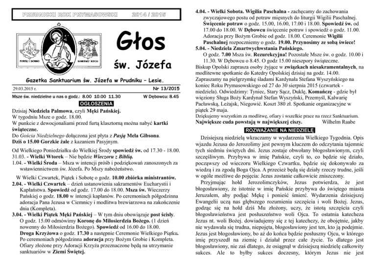 PRUDNICKI ROK PRYMASOWSKI 2014 / 2015 Głos św. Józefa Gazetka Sanktuarium św. Józefa w Prudniku – Lesie. Nr 13/2015 29.03.2015 r. Msze św. niedzielne u nas o godz.: 8.00 10.00 11.30 W Dębowcu: 8.45 OGŁOSZENIA Dzisiaj Niedziela Palmowa, czyli Męki Pańskiej. W tygodniu Msze o godz. 18.00. W punkcie z dewocjonaliami przed furtą klasztorną można nabyć kartki świąteczne. Do Gościa Niedzielnego dołączona jest płyta z Pasją Mela Gibsona. Dziś o 15.00 Gorzkie żale z kazaniem Pasyjnym. Od Wielkiego Poniedziałku do Wielkiej Środy spowiedź św. od 17.30 - 18.00. 31.03. - Wielki Wtorek – Nie będzie Wieczoru z Biblią. 1.04. - Wielki Środa – Msza w intencji próśb i podziękowań zanoszonych za wstawiennictwem św. Józefa. Po Mszy nabożeństwo. W Wielki Czwartek, Piątek i Sobotę o godz. 10.00 zbiórka ministrantów. 2.04. - Wielki Czwartek – dzień ustanowienia sakramentów Eucharystii i Kapłaństwa. Spowiedź od godz. 17.00 do 18.00. Msza św. Wieczerzy Pańskiej o godz. 18.00 w intencji kapłanów. Po ceremoniach półgodzinna adoracja Pana Jezusa w Ciemnicy i modlitwa brewiarzowa na zakończenie dnia (Kompleta). 3.04. - Wielki Piątek Męki Pańskiej – W tym dniu obowiązuje post ścisły. O godz. 15.00 odmówimy Koronę do Miłosierdzia Bożego. (1 dzień nowenny do Miłosierdzia Bożego). Spowiedź od 16.00 do 18.00. Droga Krzyżowa o godz. 17.30 a następnie Ceremonie Wielkiego Piątku. Po ceremoniach półgodzinna adoracja przy Bożym Grobie i Kompleta. Ofiary złożone przy Adoracji Krzyża przeznaczone będą na utrzymanie sanktuariów w Ziemi Świętej. 4.04. - Wielki Sobota. Wigilia Paschalna - zachęcamy do zachowania zwyczajowego postu od potraw mięsnych do liturgii Wigilii Paschalnej. Święcenie potraw o godz. 15.00, 16.00, 17.00 i 18.00. Spowiedź św. od 17.00 do 18.00. W Dębowcu święcenie potraw i spowiedź o godz. 11.00. Adoracja przy Bożym Grobie od godz. 18.00. Ceremonie Wigilii Paschalnej rozpoczniemy o godz. 19.00. Przynosimy ze sobą świece! 5.04. - Niedziela Zmartwychwstania Pańskiego. O godz. 7.00 Msza św. Rezurekcyjna! Pozostałe Msze św. o godz. 10.00 i 11.30. W Dębowcu o 8.45. O godz 15.00 nieszpory świąteczne. Biskup Opolski zaprasza osoby żyjące w związkach niesakramentalnych, na modlitewne spotkanie do Katedry Opolskiej dzisiaj na godz. 14.00. Zapraszamy na pielgrzymkę śladami Kardynała Stefana Wyszyńskiego na koniec Roku Prymasowskiego od 27 do 30 sierpnia 2015 (czwartek niedziela). Odwiedzimy: Tyniec, Stary Sącz, Duklę, Komańczę - gdzie był więziony Sługa Boży Kardynał Stefan Wyszyński, Przemyśl, Kalwarię Pacławską, Leżajsk, Niegowić. Koszt 380 zł. Spotkanie organizacyjne w piątek 29 maja. Dziękujemy wszystkim za modlitwę, ofiary i wszelkie prace na rzecz Sanktuarium. Największe cuda powstają w największej ciszy. Wilhelm Raabe ROZWAŻANIE NA NIEDZIELĘ Dzisiejszą niedzielą wkraczamy w wydarzenia Wielkiego Tygodnia. Opis wjazdu Jezusa do Jerozolimy jest pewnym kluczem do odczytania tajemnic tych siedmiu świętych dni. Jezus zostaje obwołany błogosławionym, czyli szczęśliwym. Przybywa w imię Pańskie, czyli to, co będzie się działo, począwszy od wieczoru Wielkiego Czwartku, będzie się dokonywało za wiedzą i za zgodą Boga Ojca. A przecież będą się działy rzeczy trudne, jeśli w ogóle możliwe do pojęcia: Jezus zostanie całkowicie zniszczony. Przyjmując hołd Jerozolimczyków, Jezus potwierdza, że jest błogosławiony, że istotnie w imię Pańskie przybywa do świętego miasta Jeruzalem, aby podjąć Mękę i ponieść śmierć. Wydarzenia dzisiejszej Ewangelii uczą nas głębszego rozumienia szczęścia i woli Bożej. Jezus, godząc się na hołd dziś Mu złożony, uczy, że istotą szczęścia czyli błogosławieństwa jest posłuszeństwo woli Ojca. To ostatnia katecheza Jezus nt. woli Bożej. dowiadujemy się z tej katechezy, że obojętnie, jakby nie wydawała się trudna, niepojęta, błogosławiony jest ten, kto ją podejmie. Jezus jest błogosławiony, bo aż do końca będzie posłuszny Ojcu, w którego imię przyszedł na ziemię i działał przez całe życie. To dlatego jest błogosławiony, nie zaś dlatego, że osiągnął w dzisiejszą niedzielę całkowity sukces. Ale to byłby sukces doczesny, którym Jezus nie jest zainteresowany. Może w wielkopiątkowym Ukrzyżuj dałoby się usłyszeć nutę rozczarowania albo i gniewu na Jezusa, bo nie wziął władzy, bo niczego nie da się przy Nim załatwić, uzyskać, nie będzie się pod co podłączyć, bo nic się nie zmieni. Warto pytać, dlaczego jestem chrześcijaninem, dlaczego chce nim pozostać, za co jestem Jezusowi wdzięczny? Za co błogosławię Jezusa? On chce nam dziś powiedzieć, że istotne jest to, aby iść przez życie w imię Pańskie. W imię Boże można wyjść naprzeciw temu, co trudne, bolesne. Czasami bywa tak, że człowiek dopiero po jakimś czasie odkrywa, że to, co się w jego życiu działo, dokonało się w imię Pańskie, zatem było dobre, było potrzebne. Jezus che, abyśmy zgodzili się na to, że Bóg może dopuścić ból, cierpienie, że ono może być dla mnie dobrem. Wymowne jest świadectwo Aleksandra Sołżenicyna: laureata Nagrody Nobla, długoletnie więźnia politycznego w ZSRR: Ujrzałem, że przez całe moje świadome życie nie rozumiałem ani siebie samego ani swoich dążeń. Przez długi czas uważałem za ratunek dla siebie to, co właśnie było moją zgubą. Na swoim zgiętym, niemal przetrąconym grzbiecie wyniosłem jednak z głębi więziennych lat świadomość tego, jak człowiek staje się dobry i jak człowiek staje się zły. Oszołomiony sukcesami, odniesionymi w młodości, uważałem się za istotę niezdolną do omyłek. Dlatego stałem się okrutnym. Gdy dano mi w ręce władzę i to w nadmiarze, stałem się mordercą i zadawałem ludziom gwałt. Nawet gdy czyniłem zło byłem przekonany, że postępki moje są dobre i miałe