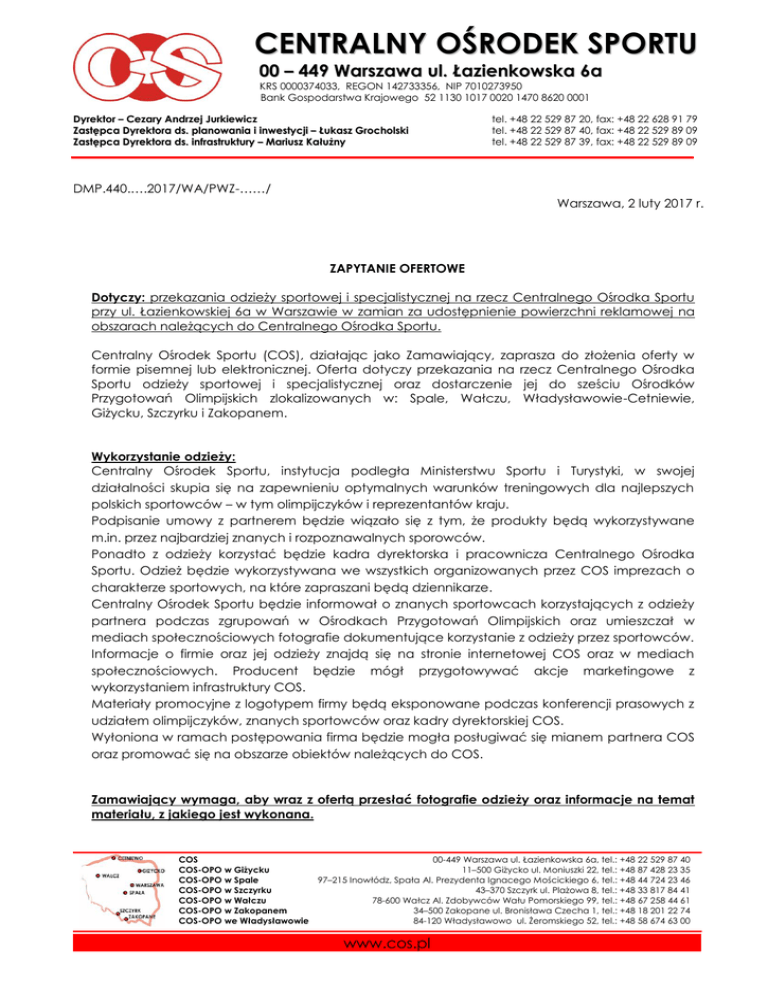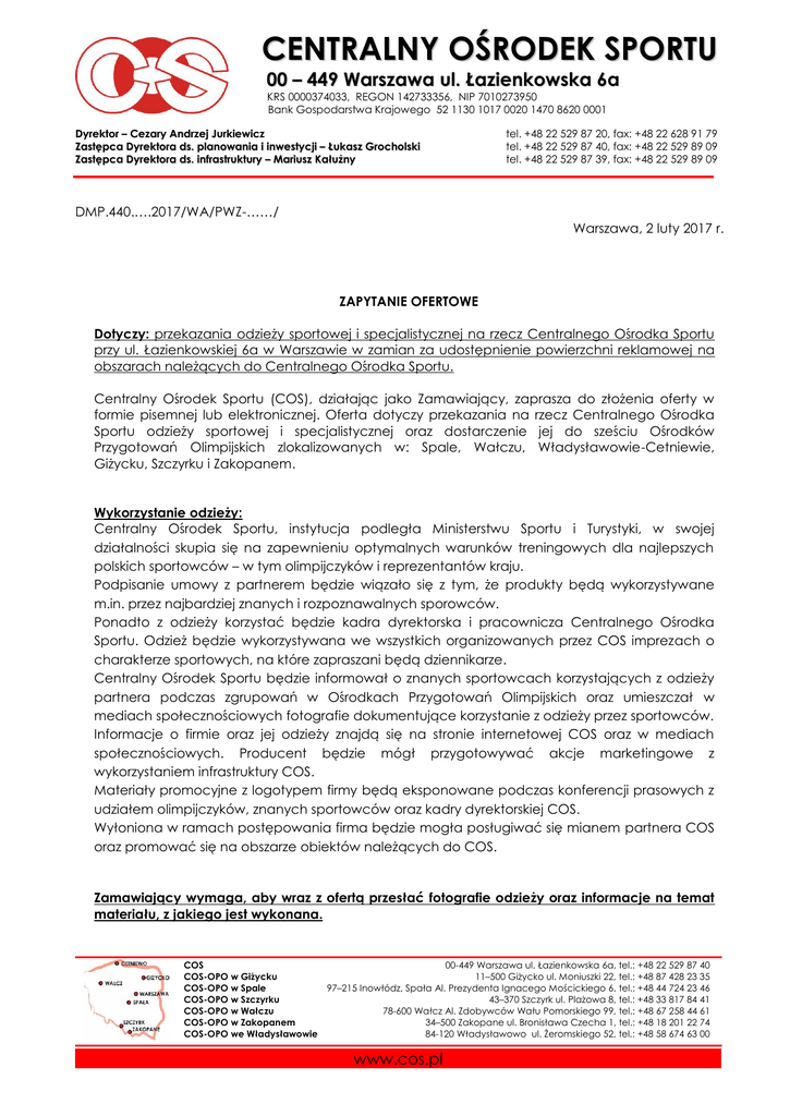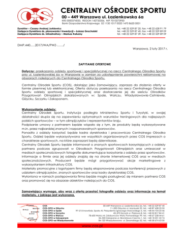 CENTRALNY OŚRODEK SPORTU 00 – 449 Warszawa ul. Łazienkowska 6a KRS 0000374033, REGON 142733356, NIP 7010273950 Bank Gospodarstwa Krajowego 52 1130 1017 0020 1470 8620 0001 Dyrektor – Cezary Andrzej Jurkiewicz Zastępca Dyrektora ds. planowania i inwestycji – Łukasz Grocholski Zastępca Dyrektora ds. infrastruktury – Mariusz Kałużny tel. +48 22 529 87 20, fax: +48 22 628 91 79 tel. +48 22 529 87 40, fax: +48 22 529 89 09 tel. +48 22 529 87 39, fax: +48 22 529 89 09 DMP.440.….2017/WA/PWZ-……/ Warszawa, 2 luty 2017 r. ZAPYTANIE OFERTOWE Dotyczy: przekazania odzieży sportowej i specjalistycznej na rzecz Centralnego Ośrodka Sportu przy ul. Łazienkowskiej 6a w Warszawie w zamian za udostępnienie powierzchni reklamowej na obszarach należących do Centralnego Ośrodka Sportu. Centralny Ośrodek Sportu (COS), działając jako Zamawiający, zaprasza do złożenia oferty w formie pisemnej lub elektronicznej. Oferta dotyczy przekazania na rzecz Centralnego Ośrodka Sportu odzieży sportowej i specjalistycznej oraz dostarczenie jej do sześciu Ośrodków Przygotowań Olimpijskich zlokalizowanych w: Spale, Wałczu, Władysławowie-Cetniewie, Giżycku, Szczyrku i Zakopanem. Wykorzystanie odzieży: Centralny Ośrodek Sportu, instytucja podległa Ministerstwu Sportu i Turystyki, w swojej działalności skupia się na zapewnieniu optymalnych warunków treningowych dla najlepszych polskich sportowców – w tym olimpijczyków i reprezentantów kraju. Podpisanie umowy z partnerem będzie wiązało się z tym, że produkty będą wykorzystywane m.in. przez najbardziej znanych i rozpoznawalnych sporowców. Ponadto z odzieży korzystać będzie kadra dyrektorska i pracownicza Centralnego Ośrodka Sportu. Odzież będzie wykorzystywana we wszystkich organizowanych przez COS imprezach o charakterze sportowych, na które zapraszani będą dziennikarze. Centralny Ośrodek Sportu będzie informował o znanych sportowcach korzystających z odzieży partnera podczas zgrupowań w Ośrodkach Przygotowań Olimpijskich oraz umieszczał w mediach społecznościowych fotografie dokumentujące korzystanie z odzieży przez sportowców. Informacje o firmie oraz jej odzieży znajdą się na stronie internetowej COS oraz w mediach społecznościowych. Producent będzie mógł przygotowywać akcje marketingowe z wykorzystaniem infrastruktury COS. Materiały promocyjne z logotypem firmy będą eksponowane podczas konferencji prasowych z udziałem olimpijczyków, znanych sportowców oraz kadry dyrektorskiej COS. Wyłoniona w ramach postępowania firma będzie mogła posługiwać się mianem partnera COS oraz promować się na obszarze obiektów należących do COS. Zamawiający wymaga, aby wraz z ofertą przesłać fotografie odzieży oraz informacje na temat materiału, z jakiego jest wykonana. COS 00-449 Warszawa ul. Łazienkowska 6a, tel.: +48 22 529 87 40 COS-OPO w Giżycku 11–500 Giżycko ul. Moniuszki 22, tel.: +48 87 428 23 35 COS-OPO w Spale 97–215 Inowłódz, Spała Al. Prezydenta Ignacego Mościckiego 6, tel.: +48 44 724 23 46 COS-OPO w Szczyrku 43–370 Szczyrk ul. Plażowa 8, tel.: +48 33 817 84 41 COS-OPO w Wałczu 78-600 Wałcz Al. Zdobywców Wału Pomorskiego 99, tel.: +48 67 258 44 61 COS-OPO w Zakopanem 34–500 Zakopane ul. Bronisława Czecha 1, tel.: +48 18 201 22 74 COS-OPO we Władysławowie 84-120 Władysławowo ul. Żeromskiego 52, tel.: +48 58 674 63 00 www.cos.pl Świadczenia oferowane przez Zamawiającego na rzecz firmy, która wygra postępowanie przetargowe: Tytuł partnera Centralnego Ośrodka Sportu (COS) Możliwość wykorzystywania znaków graficznych COS w komunikacji zewnętrznej firmy (po wcześniejszej akceptacji treści przez COS) Możliwość zainstalowania banerów reklamowych i innych form przestrzennych zaakceptowanych przez COS na obszarze należącym do COS, tj. na terenie Centralnego Ośrodka Sportu w Warszawie, przy ul. Łazienkowskiej 6a oraz na terenie Ośrodków Przygotowań Olimpijskich, które zlokalizowane są w: Spale, Wałczu, Władysławowie-Cetniewie, Giżycku, Szczyrku i Zakopanem. Proponowane kanały komunikacji marketingowej oraz możliwości świadczeń reklamowych: Udostępnienie powierzchni reklamowych we wszystkich ośrodkach COS OPO w Polsce (Warszawa, Cetniewo, Spała, Giżycko, Wałcz, Szczyrk, Zakopane) Zawieszenie banerów reklamowych na obiektach COS OPO Udział w eventach organizowanych w COS OPO Możliwość umieszczenia drukowanych materiałów reklamowych firmy w COS OPO Przyznanie oficjalnego tytułu partnera Centralnego Ośrodka Sportu Logotyp firmy na materiałach poligraficznych COS typu foldery reklamowe, ulotki, plakaty itp. Reklama stojąca przy wejściach na hale sportowe, konferencyjne w hotelach przy recepcji Reklama na oficjalnej stronie internetowej COS oraz na stronach wszystkich ośrodków z odnośnikiem do witryny internetowej firmy (łącznie osiem www) Logo firmy w publikacjach, sprawozdaniach i materiałach telewizyjnych Reklama w Social Media COS: 8 x profil Facebook (profil główny COS, profil COS hala Torwar oraz 6 profili Ośrodków Przygotowań Olimpijskich), Twitter, Instagram, Snapchat, Youtube Możliwość organizacji eventów firmy w COS OPO na preferencyjnych warunkach Pula voucherów na pobyty w COS OPO dla pracowników firmy Inne formy promocji – do uzgodnienia pomiędzy stronami Możliwość wykorzystywania znaków graficznych COS w komunikacji zewnętrznej firmy (po wcześniejszej akceptacji treści przez COS) Informacje dodatkowe: 1. Termin realizacji – 4 tygodnie od daty podpisania umowy. 2. Kryterium oceny ofert: parametry techniczne oraz ilość zaoferowanej odzieży. 3. Wszelkie pytania proszę kierować za pośrednictwem drogi elektronicznej na wszystkie podane adresy, tj.: [email protected], [email protected]; 4. Oferty przesłane w postaci elektronicznej w formie plików PDF proszę kierować na wszystkie podane adresy, tj.: [email protected], [email protected]; [email protected] 5. Zamawi