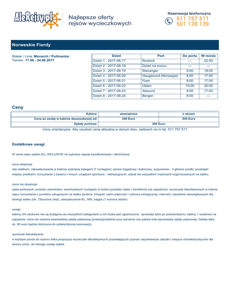Norweskie Fiordy Dzień Statek / Linia: Monarch / Pullmantur Termin: 17.06 - 24.06.2017 Port Do portu W morze --- 22:00 Dzień 1 - 2017-06-17 Rostock Dzień 2 - 2017-06-18 Dzień na morzu --- --- Dzień 3 - 2017-06-19 Stavanger 9:00 18:00 Dzień 4 - 2017-06-20 Haugesund (Norwegia) 8:00 17:00 Dzień 5 - 2017-06-21 Flam 8:00 17:00 Dzień 6 - 2017-06-22 Olden 10:00 20:00 Dzień 7 - 2017-06-23 Alesund 8:00 17:00 Dzień 8 - 2017-06-24 Bergen 8:00 --- Ceny Kabina: Cena za osobę w kabinie dwuosobowej od: wewnętrzna z oknem 449 Euro 545 Euro Opłaty portowe: 200 Euro Ceny orientacyjne. Aby uzyskać cenę aktualną w danym dniu, zadzwoń na nr tel. 511 757 511 Dodatkowe uwagi W cenie rejsu pakiet ALL INCLUSIVE na wybrane napoje bezalkoholowe i alkoholowe. cena obejmuje: rejs statkiem; zakwaterowanie w kabinie wybranej kategorii (7 noclegów); serwis bagażowy i kabinowy; wyżywienie - 3 główne posiłki, przekąski między posiłkami, korzystanie z basenu i innych urządzeń sportowo - rekreacyjnych; udział we wszystkich imprezach organizowanych na statku. cena nie obejmuje: opłat portowych; przelotu samolotem; ewentualnych noclegów w hotelu przed/po rejsie i transferów (na zapytanie); wycieczek fakultatywnych w trakcie rejsu; korzystania z punktów usługowych na statku (pralnia, fotograf, salon piękności i odnowy biologicznej, internet); napiwków obowiązkowych dla obsługi statku (ok. 72euro/os./rejs), ubezpieczenia KL, NW, bagaż (1 euro/os./dzień). uwagi: kabiny 3/4 osobowe nie są dostępne we wszystkich kategoriach a ich liczba jest ograniczona - sprzedaż tylko po potwierdzeniu; kabiny 1 osobowe na zapytanie; cena nie zawiera ewentualnej opłaty paliwowej (prawdopodobnie przy wzroście cen paliwa linia wprowadza opłaty paliwowej. Opłata taka ok. 90 euro będzie doliczona do potwierdzonej rezerwacji). wycieczki fakultatywne: w każdym porcie do wyboru kilka propozycji wycieczek fakultatywnych pozwalających poznać najciekawsze zabytki i miejsca charakterystyczne dla okolicy portu, do którego zawija statek. Monarch Monarch Tonaż: 73,937 ton Liczba pokładów: 12 Pasażerowie: 3333 Załoga: 780 Do dyspozycji: 4 restauracje, restauracja Fusion (dodatkowo płatna), bary, kawiarnie, kasyno, teatr, dyskoteka, jacuzzi, pokój gier, ścianka wspinaczkowa, pokój zabaw i opieka dla dzieci, klub dla nastolatków, salon odnowy biologicznej, solarium, fitness, biblioteka, kafejka internetowa, biblioteka, galeria zdjęć, butiki, centrum konferencyjne,centrum medyczne. Kabiny: 1193 kabiny wyposażone w łazienkę (prysznic, wc, suszarka; w kabinach typu suite wanna z prysznicem) telewizor, sejf, mini bar(w kabinach typu suite), odtwarzacz DVD i odtwarzacz CD (w kabinach typu suite), indywidualnie sterowana klimatyzacja. W kabinkach typu Deluxe suite z balkonem sypialnia jest wizualnie oddzielona od części dziennej, posiada podwójne łoże. W kabinach posiadających 2 pojedyncze łóżka, istnieje możliwość połączenia ich w 1 podwójne. Istnieje możliwość umieszczenia w kabinie łóżeczka dla dziecka. Statek dysponuje również kabinami, które są przystosowane dla osób niepełnosprawnych. Room Service dostępny 24h na dobę.