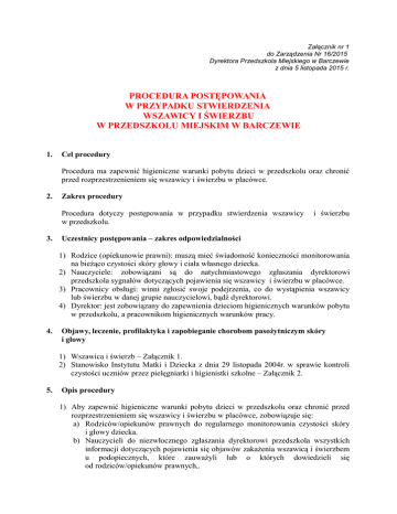 Załącznik nr 1 do Zarządzenia Nr 16/2015 Dyrektora Przedszkola Miejskiego w Barczewie z dnia 5 listopada 2015 r. PROCEDURA POSTĘPOWANIA W PRZYPADKU STWIERDZENIA WSZAWICY I ŚWIERZBU W PRZEDSZKOLU MIEJSKIM W BARCZEWIE 1. Cel procedury Procedura ma zapewnić higieniczne warunki pobytu dzieci w przedszkolu oraz chronić przed rozprzestrzenieniem się wszawicy i świerzbu w placówce. 2. Zakres procedury Procedura dotyczy postępowania w przypadku stwierdzenia wszawicy w przedszkolu. 3. i świerzbu Uczestnicy postępowania – zakres odpowiedzialności 1) Rodzice (opiekunowie prawni): muszą mieć świadomość konieczności monitorowania na bieżąco czystości skóry głowy i ciała własnego dziecka. 2) Nauczyciele: zobowiązani są do natychmiastowego zgłaszania dyrektorowi przedszkola sygnałów dotyczących pojawienia się wszawicy i świerzbu w placówce. 3) Pracownicy obsługi: winni zgłosić swoje podejrzenia, co do wystąpienia wszawicy lub świerzbu w danej grupie nauczycielowi, bądź dyrektorowi. 4) Dyrektor: jest zobowiązany do zapewnienia dzieciom higienicznych warunków pobytu w przedszkolu, a pracownikom higienicznych warunków pracy. 4. Objawy, leczenie, profilaktyka i zapobieganie chorobom pasożytniczym skóry i głowy 1) Wszawica i świerzb – Załącznik 1. 2) Stanowisko Instytutu Matki i Dziecka z dnia 29 listopada 2004r. w sprawie kontroli czystości uczniów przez pielęgniarki i higienistki szkolne – Załącznik 2. 5. Opis procedury 1) Aby zapewnić higieniczne warunki pobytu dzieci w przedszkolu oraz chronić przed rozprzestrzenieniem się wszawicy i świerzbu w placówce, zobowiązuje się: a) Rodziców/opiekunów prawnych do regularnego monitorowania czystości skóry i głowy dziecka. b) Nauczycieli do niezwłocznego zgłaszania dyrektorowi przedszkola wszystkich informacji dotyczących pojawienia się objawów zakażenia wszawicą i świerzbem u podopiecznych, które zauważyli lub o których dowiedzieli się od rodziców/opiekunów prawnych,. 2) 3) 4) 5) c) Pracowników obsługi do niezwłocznego zgłaszania dyrektorowi przedszkola podejrzeń co do wystąpienia wszawicy lub świerzbu w danej grupie. d) Nauczycieli do pozyskania na początku roku szkolnego pisemnej zgody rodziców (Załącznik 3) na objęcie dziecka opieką profilaktyczną (co jest równoznaczne z wyrażeniem zgody na dokonanie w przypadku uzasadnionym przeglądu czystości skóry dziecka). Rodzice lub opiekunowie dziecka winni być powiadomieni o terminie planowanej kontroli higienicznej poprzez wywieszenie stosownej informacji na tablicy ogłoszeń w kąciku dla rodziców. W przypadku wystąpienia choroby pasożytniczej na terenie placówki: a) Dyrektor przedszkola zarządza dokonanie przez osobę upoważnioną (nauczyciel) kontroli czystości skóry i głowy wszystkich dzieci w grupie, z zachowaniem zasady intymności (kontrola indywidualna w wydzielonym pomieszczeniu). b) Nauczyciel zawiadamia rodziców dzieci, u których stwierdzono wszawicę o konieczności podjęcia niezwłocznie zabiegów higienicznych skóry głowy. W przypadku stwierdzenia świerzbu skierowanie do lekarza. Rodzic jest zobowiązany do niezwłocznego odebrania dziecka z przedszkola i podjęcia leczenia. c) Nauczyciel zapoznaje rodziców o sposobie działań, informuje też o konieczności poddania się kuracji wszystkich domowników, jednocześnie informuje dyrektora przedszkola o wynikach kontroli i skali zjawiska. d) Dyrektor lub upoważniona osoba niezwłocznie powiadamia innych rodziców o wystąpieniu przypadku choroby pasożytniczej, z zaleceniem codziennej kontroli czystości głowy i skóry dziecka oraz czystości skóry i głów domowników. W celu prowadzenia jednolitej współpracy w działaniach na linii pracownicy placówki – rodzice (prawni opiekunowie). Rodzic/opiekun prawny otrzymanie informacji potwierdza własnoręcznym podpisem na liście grupowej. e) W trakcie leczenia dziecko powinno pozostać w domu, żeby zapobiec przenoszeniu się pasożyta na inne dzieci. Dziecko wraca do przedszkola po zakończeniu leczenia. f) Rodzice (opiekunowie prawni) dziecka, po przebytej chorobie pasożytniczej skóry głowy i ciała (jeśli zaistnieje taka potrzeba), zobowiązani są do dostarczenia zaświadczenia lekarskiego, że dziecko jest zdrowe i może uczęszczać do przedszkola. W przypadku, gdy rodzice zgłoszą trudności w przeprowadzeniu kuracji (np. brak środków finansowych na zakup preparatu), dyrektor przedszkola we współpracy z ośrodkiem pomocy społecznej, udzielają rodzicom lub opiekunom niezbędnej pomocy. Nauczyciel (lub inna osoba posiadająca stosowne kwalifikacje, którą dyrektor upoważnił) po upływie 7 – 10 dni kontroluje stan czystości skóry głowy dzieci po przeprowadzonych zabiegach higienicznych przez rodziców. W sytuacji stwierdzenia nieskuteczności zalecanych działań, nauczyciel zawiadamia o tym dyrektora przedszkola w celu podjęcia bardziej radykalnych kroków (zawiadomienie ośrodka pomocy społecznej o konieczności wzmożenia nadzoru nad realizacją funkcji opiekuńczych przez rodziców dziecka oraz udzielenia potrzebnego wsparcia). 6. Sposób prezentacji procedur 1) Umieszczenie treści dokumentu na stronie internetowej przedszkola i tablicy ogłoszeń. 2) Zapoznanie rodziców z obowiązującą w placówce procedurą na zebraniach organizacyjnych we wrześniu każdego roku szkolnego. 3) Zapoznanie wszystkich pracowników przedszkola z treścią procedury. 7. Tryb dokonywania zmian w procedurze 1) Wszelkich zmian w opracowanej procedurze może dokonać z własnej inicjatywy lub na wniosek rady pedagogicznej dyrektor placówki. Wnioskodawcą zmian może być również rada rodziców. 2) Proponowane zmiany nie mogą być sprzeczne z prawem. Załącznik nr 1 do Procedury postępowania w przypadku stwierdzenia wszawicy i świerzbu w Przedszkolu Miejskim w Barczewie wprowadzonej Zarządzeniem Nr 16/2015 Dyrektora Przedszkola Miejskiego w Barczewie z dnia 5 list