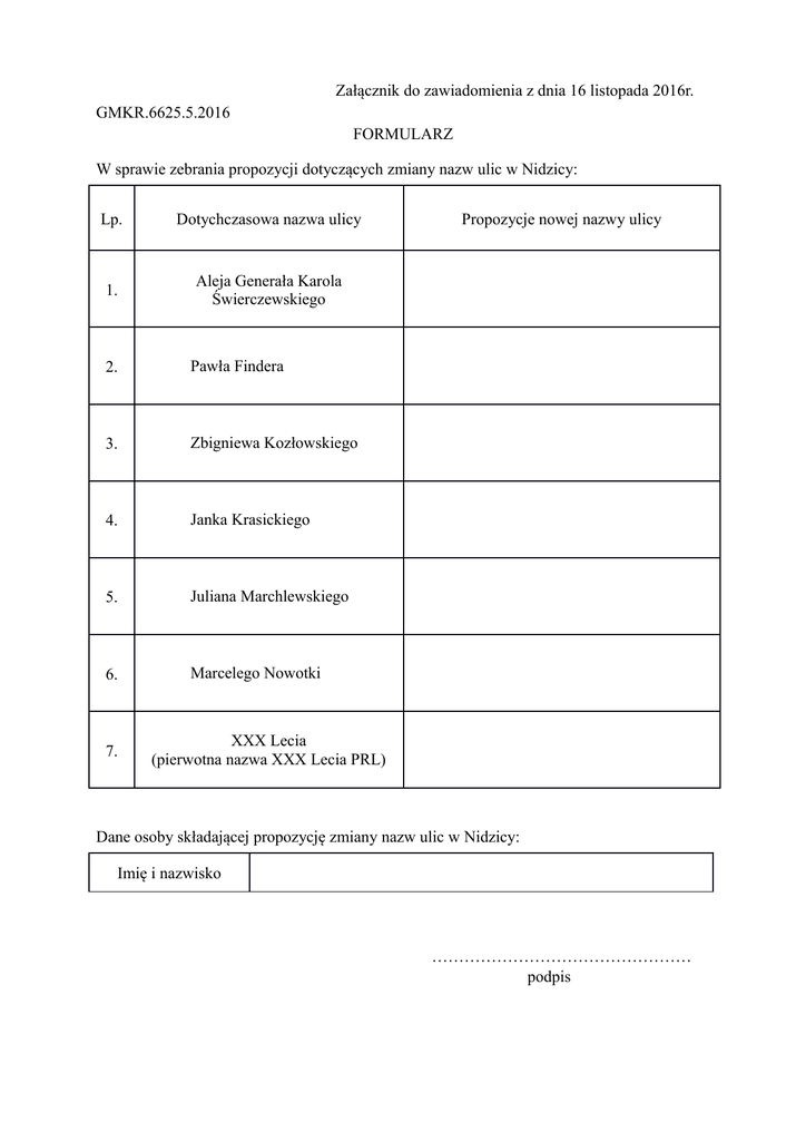 Załącznik do zawiadomienia z dnia 16 listopada 2016r. GMKR.6625.5.2016 FORMULARZ W sprawie zebrania propozycji dotyczących zmiany nazw ulic w Nidzicy: Lp. Dotychczasowa nazwa ulicy 1. Aleja Generała Karola Świerczewskiego 2. Pawła Findera 3. Zbigniewa Kozłowskiego 4. Janka Krasickiego 5. Juliana Marchlewskiego 6. Marcelego Nowotki 7. Propozycje nowej nazwy ulicy XXX Lecia (pierwotna nazwa XXX Lecia PRL) Dane osoby składającej propozycję zmiany nazw ulic w Nidzicy: Imię i nazwisko ………………………………………… podpis