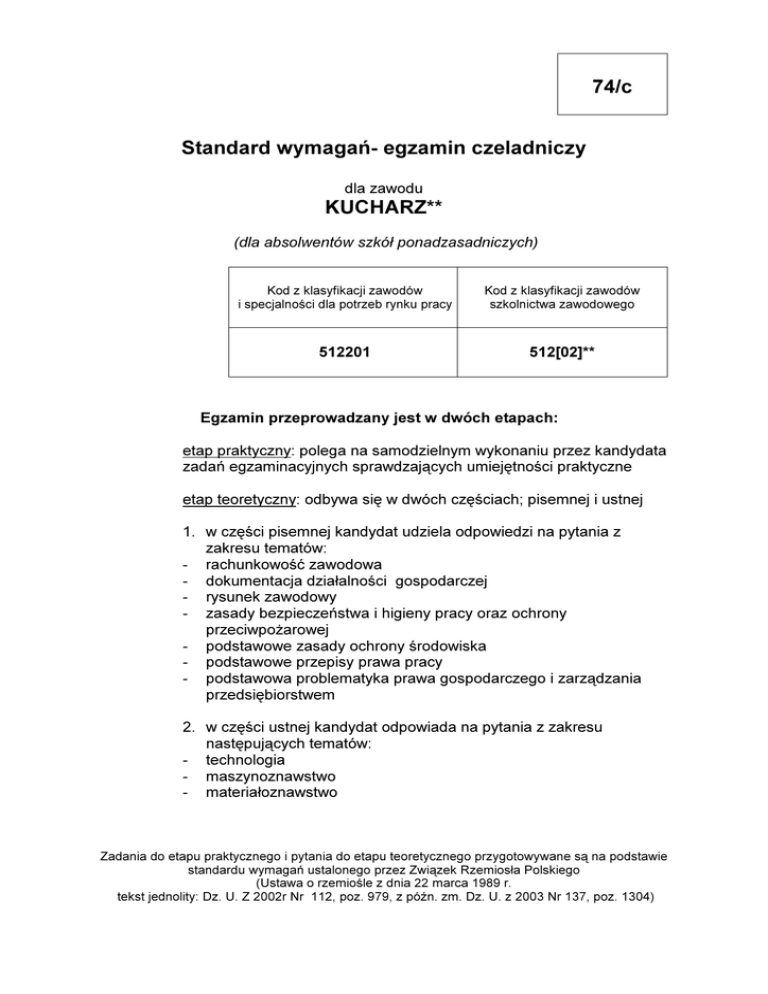 74/c Standard wymagań- egzamin czeladniczy KUCHARZ**