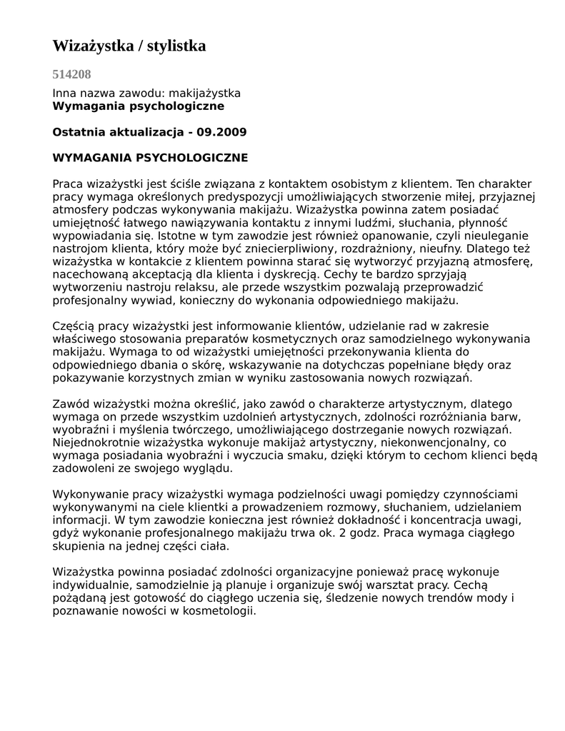 Wizażystka / stylistka 514208 Inna nazwa zawodu: makijażystka Wymagania psychologiczne Ostatnia aktualizacja - 09.2009 WYMAGANIA PSYCHOLOGICZNE Praca wizażystki jest ściśle związana z kontaktem osobistym z klientem. Ten charakter pracy wymaga określonych predyspozycji umożliwiających stworzenie miłej, przyjaznej atmosfery podczas wykonywania makijażu. Wizażystka powinna zatem posiadać umiejętność łatwego nawiązywania kontaktu z innymi ludźmi, słuchania, płynność wypowiadania się. Istotne w tym zawodzie jest również opanowanie, czyli nieuleganie nastrojom klienta, który może być zniecierpliwiony, rozdrażniony, nieufny. Dlatego też wizażystka w kontakcie z klientem powinna starać się wytworzyć przyjazną atmosferę, nacechowaną akceptacją dla klienta i dyskrecją. Cechy te bardzo sprzyjają wytworzeniu nastroju relaksu, ale przede wszystkim pozwalają przeprowadzić profesjonalny wywiad, konieczny do wykonania odpowiedniego makijażu. Częścią pracy wizażystki jest informowanie klientów, udzielanie rad w zakresie właściwego stosowania preparatów kosmetycznych oraz samodzielnego wykonywania makijażu. Wymaga to od wizażystki umiejętności przekonywania klienta do odpowiedniego dbania o skórę, wskazywanie na dotychczas popełniane błędy oraz pokazywanie korzystnych zmian w wyniku zastosowania nowych rozwiązań. Zawód wizażystki można określić, jako zawód o charakterze artystycznym, dlatego wymaga on przede wszystkim uzdolnień artystycznych, zdolności rozróżniania barw, wyobraźni i myślenia twórczego, umożliwiającego dostrzeganie nowych rozwiązań. Niejednokrotnie wizażystka wykonuje makijaż artystyczny, niekonwencjonalny, co wymaga posiadania wyobraźni i wyczucia smaku, dzięki którym to cechom klienci będą zadowoleni ze swojego wyglądu. Wykonywanie pracy wizażystki wymaga podzielności uwagi pomiędzy czynnościami wykonywanymi na ciele klientki a prowadzeniem rozmowy, słuchaniem, udzielaniem informacji. W tym zawodzie konieczna jest również dokładność i koncentracja uwagi, gdyż wykonanie profesjonalnego makijażu trwa ok. 2 godz. Praca wymaga ciągłego skupienia na jednej części ciała. Wizażystka powinna posiadać zdolności organizacyjne ponieważ pracę wykonuje indywidualnie, samodzielnie ją planuje i organizuje swój warsztat pracy. Cechą pożądaną jest gotowość do ciągłego uczenia się, śledzenie nowych trendów mody i poznawanie nowości w kosmetologii.