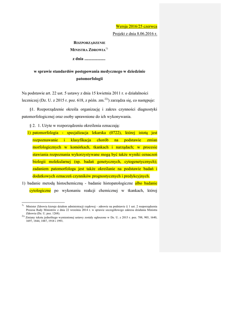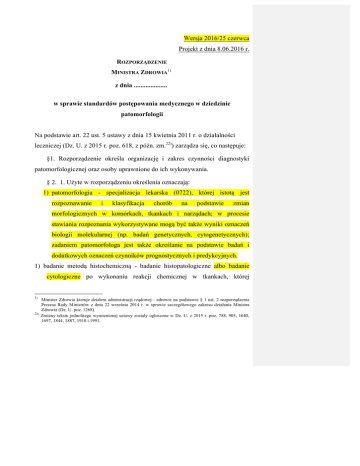 Wersja 2016/25 czerwca Projekt z dnia 8.06.2016 r. ROZPORZĄDZENIE MINISTRA ZDROWIA1) z dnia .................... w sprawie standardów postępowania medycznego w dziedzinie patomorfologii Na podstawie art. 22 ust. 5 ustawy z dnia 15 kwietnia 2011 r. o działalności leczniczej (Dz. U. z 2015 r. poz. 618, z późn. zm.22)) zarządza się, co następuje: §1. Rozporządzenie określa organizację i zakres czynności diagnostyki patomorfologicznej oraz osoby uprawnione do ich wykonywania. § 2. 1. Użyte w rozporządzeniu określenia oznaczają: 1) patomorfologia - specjalizacja lekarska (0722), której istotą jest rozpoznawanie i klasyfikacja chorób na podstawie zmian morfologicznych w komórkach, tkankach i narządach; w procesie stawiania rozpoznania wykorzystywane mogą być także wyniki oznaczeń biologii molekularnej (np. badań genetycznych, cytogenetycznych); zadaniem patomorfologa jest także określanie na podstawie badań i dodatkowych oznaczeń czynników prognostycznych i predykcyjnych. 1) badanie metodą histochemiczną - badanie histopatologiczne albo badanie cytologiczne po wykonaniu reakcji chemicznej w tkankach, której 1) Minister Zdrowia kieruje działem administracji rządowej - zdrowie na podstawie § 1 ust. 2 rozporządzenia Prezesa Rady Ministrów z dnia 22 września 2014 r. w sprawie szczegółowego zakresu działania Ministra Zdrowia (Dz. U. poz. 1268). 22) Zmiany tekstu jednolitego wymienionej ustawy zostały ogłoszone w Dz. U. z 2015 r. poz. 788, 905, 1640, 1697, 1844, 1887, 1918 i 1991. –2– wynikiem jest powtarzalna reakcja barwna tkanek i komórek; 2) badanie metodą immunohistochemiczną - badanie histopatologiczne albo badanie cytologiczne po wykonaniu reakcji immunologicznej w tkankach lub komórkach przy zastosowaniu reakcji antygen–przeciwciało, mające na celu zlokalizowanie antygenu i określenie konkretnej cechy biologicznej komórki lub tkanki; 3) badanie hybrydyzacji wewnątrztkankowej - badanie histopatologiczne albo badanie cytologiczne, po wykonaniu reakcji hybrydyzacji z sondą ze znacznikiem fluoroscencyjnym (FISH) lub barwnym (CISH); 4) badanie makroskopowe materiału tkankowego - ocena nieuzbrojonym okiem i opis materiału tkankowego pobranego od pacjenta, pobranie z niego wycinków oraz umieszczenie ich w kasetce; 5) badanie metodami mikroskopii elektronowej - ocena komórek lub tkanek wraz z oceną ich ultrastruktury, także z wykorzystaniem technik dodatkowych; X1) pobranie materiału cytologicznego do oceny mikroskopowej – biopsja aspiracyjna cienkoigłowa (bac) – wykonanie aspiracji materiału cytologicznego zmiany wyczuwalnej palpacyjnie wraz z wykonaniem rozmazu i jego utrwaleniem lub biopsja aspiracyjna cienkoigłowa celowana (bacc) – wyczuwalnej wykonanie aspiracji palpacyjnie pod materiału kontrolą cytologicznego technik zmiany obrazowych (ultrasonograficznych, radiologicznych, tomografii komputerowej) wraz z wykonaniem rozmazu i jego utrwaleniem, pobranie wymazów, zeskrobin, płynów; 6) badanie mikroskopowe materiału cytologicznego (badanie cytologiczne) ocena preparatu cytologicznego w mikroskopie świetlnym lub za pomocą obrazu wirtualnego wraz z jego opisem oraz autoryzowanie wyniku badania, a w przypadku gdy wynik badania wskazuje na istnienie zmiany –3– chorobowej także ustalenie rozpoznania patomorfologicznego lub określenie kręgu różnicowego w celu dalszej diagnostyki z uwzględnieniem obrazu klinicznego; w przypadku gdy badanie wykonuje się w celu wykrycia komórek nowotworowych lub atypowych lub dysplastycznych ustalenie rozpoznania patomorfologicznego. 7) badanie mikroskopowe materiału tkankowego (badanie histopatologiczne) ocena preparatu histopatologicznego w mikroskopie świetlnym lub za pomocą obrazu wirtualnego wraz z jego opisem oraz ustalenie rozpoznania patomorfologicznego lub określenie kręgu różnicowego w celu dalszej diagnostyki z uwzględnieniem obrazu klinicznego; X2) Badanie cytometryczne - Badanie zawiesiny komórkowej w cytometrze przepływowym. Sposobem pobierania materiału komórkowego do oceny w cytometrze przepływowym jest biopsja aspiracyjna cienkoigłowa lub biopsja aspiracyjna cienkoigłowa celowana (patrz podpunkt 16) węzłów i zmian pozawęzłowych oraz krew obwodowa, aspirant szpiku i płyny ustrojowe. Dodatkowo, podczas pobierania komórek do badania cytometrycznego (immunofenotypowanie) wykonywana jest aspiracji materiału cytologicznego z równoczesnym rozmazem do oceny morfologicznej (patrz podpunkt 20), integralnej części badania cytometrycznego. 8) badanie metodami molekularnymi - ocena struktury lub produktów ekspresji genu w komórkach lub tkankach; 9) badanie pośmiertne (autopsyjne) - ocena makroskopowa zwłok tj. oględziny zewnętrzne oraz otwarcie jam ciała połączone z badaniem makroskopowym narządów wewnętrznych i mikroskopową oceną materiału tkankowego pobranego ze zwłok wraz z ustaleniem rozpoznania patomorfologicznego oraz określeniem przyczyn zgonu; 10) badanie śródoperacyjne - ocena makroskopowa i mikroskopowa materiału –4– tkankowego oraz ew. cytologicznego, wykonywana w trakcie zabiegu operacyjnego wykonana przez lekarza patomorfologa; materiał do badania śródoperacyjnego powinien być dostarczony do zakładu patologii niezwłocznie, a czas trwania badania w zakładzie patologii nie powinien być dłuższy niż 20 min od dostarczenia materiału; optymalny czas trwania całej procedury wynosi 30 min od jego pobrania; materiał oceniany w trakcie badania śródoperacyjnego jest następnie opracowywany w sposób rutynowy jak dla materiału tkankowego;. 11) bloczek parafinowy - zatopione w parafinie jeden albo więcej wycinków lub zawiesina komórek oznaczony w sposób umożliwiający identyfikację pacjenta, którego dotyczą; 12) kasetka - plastikowy pojemnik, w którym umieszczone są jeden albo więcej wycinków lub zawiesina komórek, oznaczony w sposób umożliwiający identyfikację pacjenta, którego dotyc