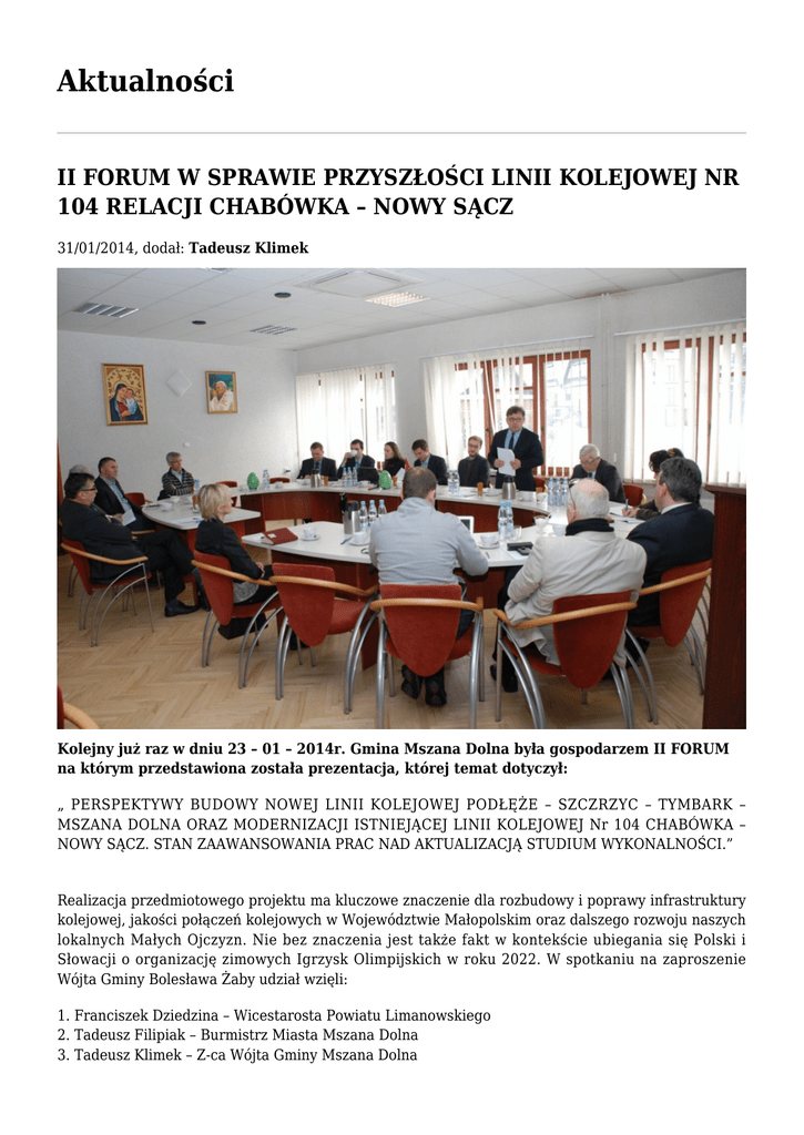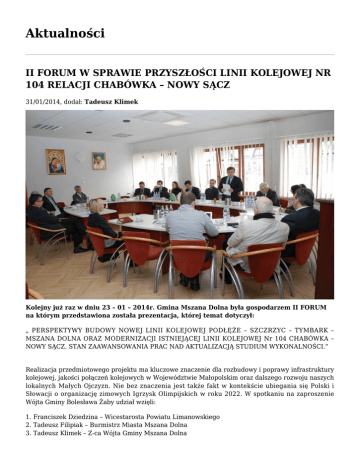Aktualności II FORUM W SPRAWIE PRZYSZŁOŚCI LINII KOLEJOWEJ NR 104 RELACJI CHABÓWKA – NOWY SĄCZ 31/01/2014, dodał: Tadeusz Klimek Kolejny już raz w dniu 23 – 01 – 2014r. Gmina Mszana Dolna była gospodarzem II FORUM na którym przedstawiona została prezentacja, której temat dotyczył: „ PERSPEKTYWY BUDOWY NOWEJ LINII KOLEJOWEJ PODŁĘŻE – SZCZRZYC – TYMBARK – MSZANA DOLNA ORAZ MODERNIZACJI ISTNIEJĄCEJ LINII KOLEJOWEJ Nr 104 CHABÓWKA – NOWY SĄCZ. STAN ZAAWANSOWANIA PRAC NAD AKTUALIZACJĄ STUDIUM WYKONALNOŚCI.” Realizacja przedmiotowego projektu ma kluczowe znaczenie dla rozbudowy i poprawy infrastruktury kolejowej, jakości połączeń kolejowych w Województwie Małopolskim oraz dalszego rozwoju naszych lokalnych Małych Ojczyzn. Nie bez znaczenia jest także fakt w kontekście ubiegania się Polski i Słowacji o organizację zimowych Igrzysk Olimpijskich w roku 2022. W spotkaniu na zaproszenie Wójta Gminy Bolesława Żaby udział wzięli: 1. Franciszek Dziedzina – Wicestarosta Powiatu Limanowskiego 2. Tadeusz Filipiak – Burmistrz Miasta Mszana Dolna 3. Tadeusz Klimek – Z-ca Wójta Gminy Mszana Dolna 4. Ewa Filipiak – Radna Powiatu Limanowskiego 5. Bożena Matras – p.o. kierownika inwestycji, Urząd Gminy Tymbark 6. Mariusz Undas – inspektor ds. budownictwa , Urząd Gminy Raciechowice 7. Mateusz Małecki – kierownik projektu, firma WS Atkins 8. Piotr Majerczak – kierownik centrum realizacji inwestycji PKP PLK S.A. 9. Izabela Zielińska – koordynator projektu, Firma Halcrow 10. Łukasz Wosiewicz – projektant branży drogowej, Firma Halcrow 11. Marcin Morawski – asystent projektanta branży drogowej, Firma Halcrow 12. Elżbieta Baran – PKP S.A. Dyrektor Regionalny 13. Andrzej Majchrzak – przedstawiciel właściciela stacji PKP w Kasinie W. 14. Czesław Szynalik – członek Stowarzyszenia Lokomotywa 15. Jakub Toporkiewicz - członek Stowarzyszenie Lokomotywa 16. Przedstawiciele lokalnych mediów: - Radio RDN – Natalia Graczykowska - Tygodnik Podhalański – Józef Figura - TV 28 – Józef Budacz Głównymi prelegentami przedstawiającymi prezentację byli: Pani Izabela Zielińska – koordynator projektu, Firma Halcrow, Pan Mateusz Małecki – kierownik projektu, firma WS Atkins oraz Pan Piotr Majerczak – kierownik centrum realizacji inwestycji PKP PLK S.A. W imieniu Wójta Gminy uczestników II FORUM powitał Z-ca Wójta Tadeusz Klimek, który w swoim wstępie do dyskusji przypomniał wnioski wypracowane podczas I FORUM oraz szczegółowo omówił najważniejsze zagrożenia ale i też korzyści dotyczące przedmiotowego projektu. Wnioski z I FORUM – Mszana Dolna – 16 września 2013r. 1. Wszystkie samorządy lokalne usytuowane wzdłuż linii Nr 104 powinny niezwłocznie uchwalić i wystosować do odpowiednich władz rezolucję o wsparcie i podjęcie decyzji na szczeblu rządowym w sprawie budowy nowej linii relacji Chabówka – Nowy Sącz. 2. PKP S.A. do następnego spotkania oczekuje od poszczególnych JST na jednoznaczne stanowisko w kwestii nabycia do swoich zasobów nieruchomości położonych wzdłuż linii Chabówka – Nowy Sącz. Po złożeniu deklaracji przez poszczególne gminy PKP S.A. przedstawi warunki szczegółowe dotyczące ich odpłatnego lub nieodpłatnego przekazania. 3. Niezbędne jest wsparcie przez lokalne samorządy działań wprowadzenia do Programu Strategicznego Dziedzictwo i Przemysły Czasu Wolnego produktu turystycznego związanego z linią Chabówka- Nowy Sącz i skansenem kolejowym w Chabówce. 4. Wstrzymanie ostatecznej decyzji dotyczącej likwidacji linii kolejowej Nr 104 do czasu analizy i wyczerpania wszystkich możliwości mających na celu jej budowę. 5. Przygotowanie przez odpowiednie podmioty dokumentacji takich jak: studium wykonalności z uwzględnieniem prac modernizacyjnych i eksploatacyjnych. 6. Wspieranie finansowe przez władze samorządowe, rządowe, PPP, PKP i inne podmioty pociągu RETRO w celu rozwoju turystki i kolejnictwa. Z kolei kierownik inwestycji Pan Mateusz Małecki reprezentujący Firmę WS Atkins przybliżył dotychczasowe dokonania, komplikacje i proponowane rozwiązania dotyczące aktualizacji studium wykonalności projektu. Omówił opracowane analizy techniczne pierwotnie trzech, a docelowo dwóch wariantów trasowań linii Podłęże – Szczyrzyc – Tymbark/ Mszana Dolna. Zaznaczył, że podstawowym celem projektu jest poprawa komunikacji południowej części woj. małopolskiego i podniesienie atrakcyjności terenu z uwzględnieniem istotnych czynników: - zgodność z projektem Natura 2000 - pogodzenie aspektów społecznych - zagospodarowanie przestrzenne - rachunek ekonomiczno- techniczny Szczegółowego omówienia poszczególnych wariantów i opcji dotyczących nowego trasowania linii kolejowej, w formie prezentacji dokonała p. Izabela Zielińska, przedstawiciel Firmy Halcrow. Omówiła szczegóły każdego z wariantów i opcji trasowań uwzględniających zmiany w infrastrukturze otaczającej, przy czym zaznaczyła, że istnieją możliwości dowolnej kombinacji zaprezentowanych wariantów i opcji. Prace nadal są w toku, a wybór ścieżki działania będzie zależał od wyników analiz - wybrana zostanie opcja optymalna. W dalszej części spotkania Pan M. Małecki poruszył kwestię dotyczącą ekonomii i zysków płynących z budowy kolei dla naszego regionu oraz formy finansowania inwestycji (tradycyjna lub Partnerstwo Publiczno- Prywatne). Kolejną osobą, która zabrała głos w dyskusji był Wicestarosta Powiatu Limanowskiego Pan Franciszek Dziedzina, który wyraził aprobatę i poparcie ze strony Powiatu dla inicjatywy budowy linii kolejowej oraz podkreślił, że aby osiągnąć cel, trzeba stanąć ponad podziałami partyjnymi i potraktować to jako wspólne zadanie dla wszystkich samorządów. W podobnym tonie wypowiadali się pozostali uczestnicy. W dalszej części istotną kwestię poruszyła Pani Elżbieta Baran – brak deklaracji
