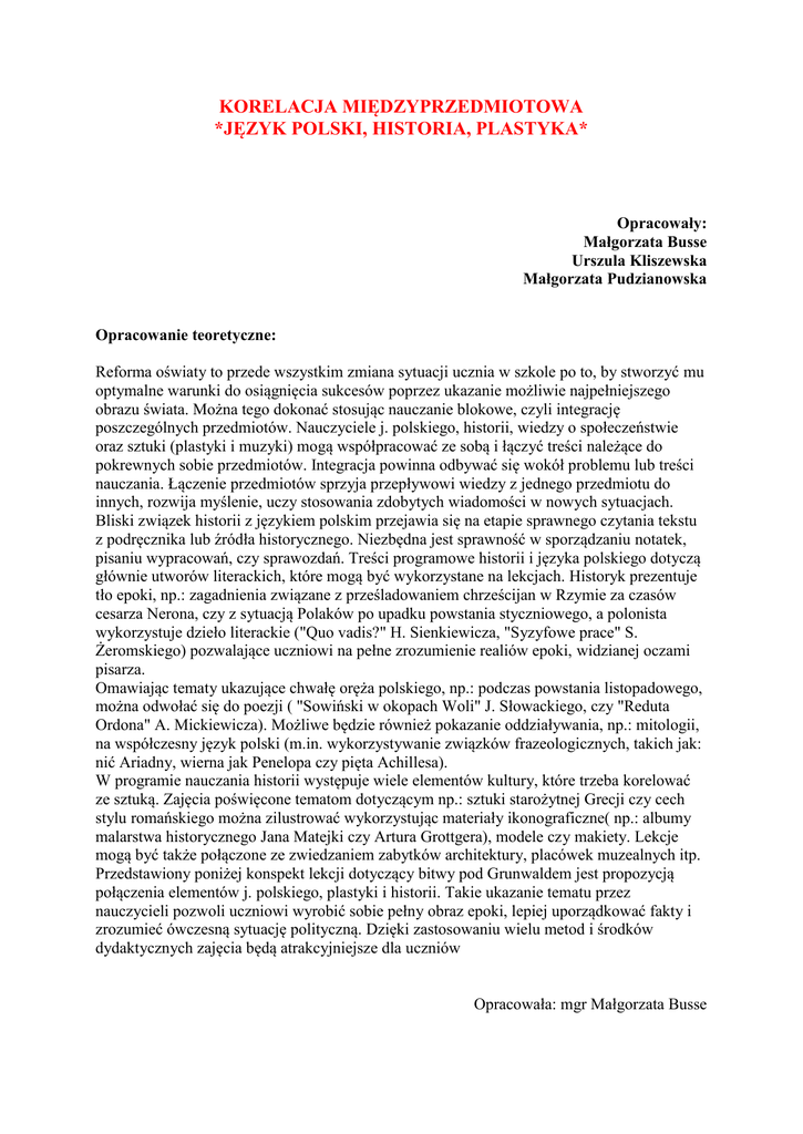 korelacja międzyprzedmiotowa *język polski, historia, plastyka
