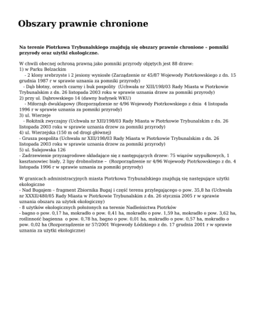 Obszary prawnie chronione Na terenie Piotrkowa Trybunalskiego znajdują się obszary prawnie chronione – pomniki przyrody oraz użytki ekologiczne. W chwili obecnej ochroną prawną jako pomniki przyrody objętych jest 88 drzew: 1) w Parku Belzackim - 2 klony srebrzyste i 2 jesiony wyniosłe (Zarządzenie nr 45/87 Wojewody Piotrkowskiego z dn. 15 grudnia 1987 r w sprawie uznania za pomniki przyrody) - Dąb błotny, orzech czarny i buk pospolity (Uchwała nr XIII/198/03 Rady Miasta w Piotrkowie Trybunalskim z dn. 26 listopada 2003 roku w sprawie uznania drzew za pomniki przyrody) 2) przy ul. Dąbrowskiego 14 (dawny budynek WKU) - Miłorząb dwuklapowy (Rozporządzenie nr 4/96 Wojewody Piotrkowskiego z dnia 4 listopada 1996 r w sprawie uznania za pomniki przyrody) 3) ul. Wierzeje - Rokitnik zwyczajny (Uchwała nr XIII/198/03 Rady Miasta w Piotrkowie Trybunalskim z dn. 26 listopada 2003 roku w sprawie uznania drzew za pomniki przyrody) 4) ul. Wierzejska (150 m od drogi głównej) - Grusza pospolita (Uchwała nr XIII/198/03 Rady Miasta w Piotrkowie Trybunalskim z dn. 26 listopada 2003 roku w sprawie uznania drzew za pomniki przyrody) 5) ul. Sulejowska 126 - Zadrzewienie przyzagrodowe składające się z następujących drzew: 75 wiązów szypułkowych, 1 kasztanowiec biały, 2 lipy drobnolistne – (Rozporządzenie nr 4/96 Wojewody Piotrkowskiego z dn. 4 listopada 1996 r w sprawie uznania za pomniki przyrody) W granicach administracyjnych miasta Piotrkowa Trybunalskiego znajdują się następujące użytki ekologiczne - Nad Bugajem – fragment Zbiornika Bugaj i część terenu przylegającego o pow. 35,8 ha (Uchwała nr XXXII/480/05 Rady Miasta w Piotrkowie Trybunalskim z dn. 26 stycznia 2005 r w sprawie uznania obszaru za użytek ekologiczny) - 8 użytków ekologicznych położonych na terenie Nadleśnictwa Piotrków - bagno o pow. 0,17 ha, mokradło o pow. 0,41 ha, mokradło o pow. 1,59 ha, mokradło o pow. 3,62 ha, roślinność bagienna o pow. 0,78 ha, bagno o pow. 0,01 ha, mokradło o pow. 0,57 ha, mokradło o pow. 0,02 ha (Rozporządzenie nr 57/2001 Wojewody Łódzkiego z dn. 17 grudnia 2001 r w sprawie uznania za użytki ekologiczne)