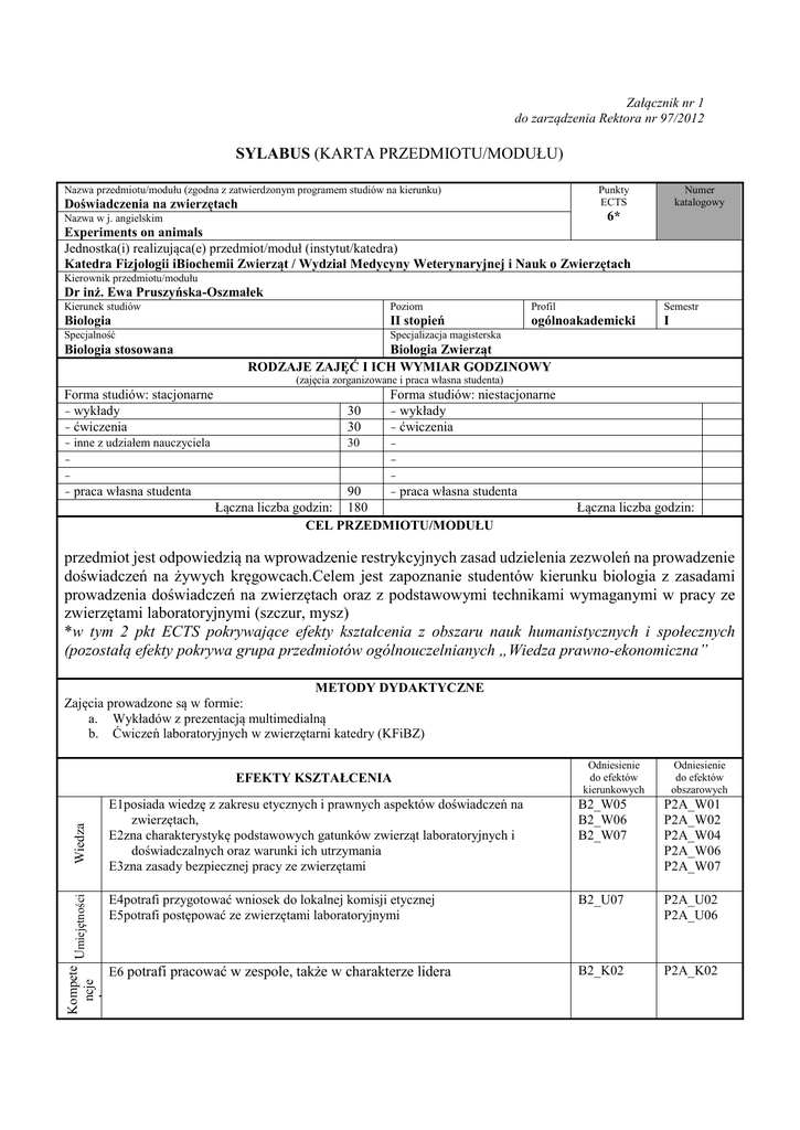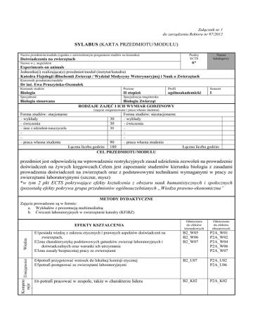 Załącznik nr 1 do zarządzenia Rektora nr 97/2012 SYLABUS (KARTA PRZEDMIOTU/MODUŁU) Nazwa przedmiotu/modułu (zgodna z zatwierdzonym programem studiów na kierunku) Punkty ECTS Doświadczenia na zwierzętach Numer katalogowy 6* Experiments on animals Jednostka(i) realizująca(e) przedmiot/moduł (instytut/katedra) Katedra Fizjologii iBiochemii Zwierząt / Wydział Medycyny Weterynaryjnej i Nauk o Zwierzętach Nazwa w j. angielskim Kierownik przedmiotu/modułu Dr inż. Ewa Pruszyńska-Oszmałek Kierunek studiów Poziom Profil Semestr Biologia II stopień ogólnoakademicki I Specjalność Specjalizacja magisterska Biologia stosowana Biologia Zwierząt RODZAJE ZAJĘĆ I ICH WYMIAR GODZINOWY (zajęcia zorganizowane i praca własna studenta) Forma studiów: stacjonarne wykłady ćwiczenia 30 30 inne z udziałem nauczyciela 30 praca własna studenta Forma studiów: niestacjonarne wykłady ćwiczenia praca 90 własna studenta Łączna liczba godzin: 180 CEL PRZEDMIOTU/MODUŁU Łączna liczba godzin: przedmiot jest odpowiedzią na wprowadzenie restrykcyjnych zasad udzielenia zezwoleń na prowadzenie doświadczeń na żywych kręgowcach.Celem jest zapoznanie studentów kierunku biologia z zasadami prowadzenia doświadczeń na zwierzętach oraz z podstawowymi technikami wymaganymi w pracy ze zwierzętami laboratoryjnymi (szczur, mysz) *w tym 2 pkt ECTS pokrywające efekty kształcenia z obszaru nauk humanistycznych i społecznych (pozostałą efekty pokrywa grupa przedmiotów ogólnouczelnianych „Wiedza prawno-ekonomiczna” METODY DYDAKTYCZNE Zajęcia prowadzone są w formie: a. Wykładów z prezentacją multimedialną b. Ćwiczeń laboratoryjnych w zwierzętarni katedry (KFiBZ) Odniesienie do efektów kierunkowych Odniesienie do efektów obszarowych E1posiada wiedzę z zakresu etycznych i prawnych aspektów doświadczeń na zwierzętach, E2zna charakterystykę podstawowych gatunków zwierząt laboratoryjnych i doświadczalnych oraz warunki ich utrzymania E3zna zasady bezpiecznej pracy ze zwierzętami B2_W05 B2_W06 B2_W07 P2A_W01 P2A_W02 P2A_W04 P2A_W06 P2A_W07 .E4potrafi przygotować wniosek do lokalnej komisji etycznej E5potrafi postępować ze zwierzętami laboratoryjnymi B2_U07 P2A_U02 P2A_U06 E6 potrafi pracować w zespole, także w charakterze lidera B2_K02 P2A_K02 Kompete Umiejętności ncje społeczne Wiedza EFEKTY KSZTAŁCENIA Numery efektów Metody weryfikacji efektów kształcenia Opisowa ocena pracy w zespole na ćwiczeniach (protokoły, wnioski) Kolokwium E4, E5, E6 E1, E2, E3 TREŚCI KSZTAŁCENIA WYKŁADY 1. Regulacje prawne – omówienie ustaw i rozporządzeń dotyczących doświadczeń na zwierzętach i praw zwierząt 2. Działanie Krajowej i Lokalnych Komisji Etycznych 3. Omówienie obowiązków instytucji i osób uprawnionych do pracy ze zwierzętami 4. Skala inwazyjności doświadczeń przeprowadzanych na zwierzętach – próba oceniania inwazyjności procedur proponowanych we wnioskach 5. Zwierzętarnia – jakie warunki muszą zostać spełnione aby móc utrzymywać/hodować zwierzęta doświadczalne, rodzaje zwierzętarni 6. Charakterystyka poszczególnych gatunków zwierząt laboratoryjnych - sposoby ich żywienia, kojarzenia, fizjologii i biologii rozrodu (szczur, mysz, świnka morska, królik, chomik), badania prowadzone z udziałem tych zwierząt 7. Zwierzęta gospodarskie jako zwierzęta, na których również prowadzone są doświadczenia 8. Inne gatunki zwierząt (pies, kot), które wykorzystywane są do badań 9. Przedstawienie podstawowych zabiegów przeprowadzanych na zwierzętach, omówienie sposobów wykonania anestezji i analgezji 10. Modela zwierzęce 11. Eutanazja – humanitarne metody uśmiercania zalecane przez Krajową Komisję Etyczną 12. Metody alternatywne czyli sposoby ograniczania ilości zwierząt laboratoryjnych do doświadczeń 13. Organizmy modyfikowane genetycznie – manipulacje genetyczne prowadzone na zwierzętach, prawne regulacje ĆWICZENIA Ćwiczenia praktyczne pozwalają na zapoznanie studentów ze sposobami postępowania ze zwierzętami laboratoryjnymi i pozwalają na zdobycie minimalnej praktyki w tym zakresie. Przez zdobywanie praktyki w tym zakresie rozumie się m.in: sposoby chwytania i przenoszenia zwierząt laboratoryjnych, sposoby podskórnego i dootrzewnowego podawania substancji zwierzętom, sposobach kontrolowania stanu zdrowia zwierząt, systemach eutanazji. Studenci zostaną zapoznani z zasadami funkcjonowania zwierzętarni, z żywieniem i utrzymaniem dwóch gatunków zwierząt laboratoryjnych (na ćwiczeniach zostaną wykorzystane myszy i szczury laboratoryjne). Formy i kryteria zaliczenia przedmiotu/modułu Procentowy udział w końcowej ocenie Protokoły Kolokwium/Test zaliczeniowy (minimum 60%) 20% 80% WYKAZ LITERATURY Literatura podstawowa 1. Brylińska J, Kwiatkowska J (1996) Zwierzęta laboratoryjne; Metody hodowli i doświadczeń Praca Zbiorowa Kraków: Universitas 2. Krzanowska H, Prebisch J, Korda P (1974) Zwierzęta Laboratoryjne hodowla i użytkowanie PZWL Literatura uzupełniająca 1. Bishop J (2001) “Ssaki transgeniczne” PWN 2. Masters JR. W (2000) “Animal Cell Culture” Oxford University Press 3rd Edition 3. Sharp PE., La Regina MC. (1998) “The Laboratory Rat” CRC Press LLC