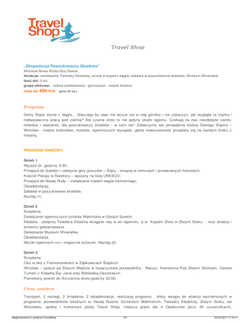 Travel Shop „Ekspedycja Poszukiwaczy Skarbów” Wrocław,Nowa Ruda,Góry Sowie, Atrakcje: zwiedzanie Twierdzy Kłodzkiej, wizyta w kopalni węgla, zabawa w poszukiwanie skarbów, Muzeum Minerałów ilość dni: 3 dni grupa wiekowa: - szkoła podstawowa - gimnazjum - szkoła średnia cena od: 450 PLN (przy 45 os.) Program Dolny Śląsk słynie z węgla… Dlaczego by więc nie wczuć się w rolę górnika i nie zobaczyć, jak wygląda ta ciężka i niebezpieczna praca pod ziemią? Ale czarne złoto to nie jedyny skarb regionu. Czekają na nas niezdobyte zamki, twierdze i warownie, dla poszukiwaczy skarbów - w sam raz! Zobaczymy tez przepiękną stolicę Dolnego Śląska – Wrocław - miasto kościołów, mostów, tajemniczych wysepek, gdzie nowoczesność przeplata się na każdym kroku z historią. PROGRAM RAMOWY: Dzień 1 Wyjazd ok. godziny 5:30; Przejazd do Sobótki i zdobycie góry piorunów – Ślęży - tonącej w chmurach i przedziwnych historiach; Kościół Pokoju w Świdnicy – wpisany na listę UNESCO; Przejazd do Nowej Rudy – zwiedzanie kopalni węgla kamiennego; Obiadokolacja; Zabawa w poszukiwanie skarbów. Nocleg (1) Dzień 2 Śniadanie. Zwiedzanie tajemniczych sztolnie Walimskie w Górach Sowich. Kłodzko - potężna Twierdza Kłodzka wciągnie nas w wir tajemnic, a w Kopalni Złota w Złotym Stoku - moc atrakcji i śmiechu gwarantowana. Zwiedzanie Muzeum Minerałów. Obiadokolacja. Wyrób tajemnych run i magiczne sztuczki. Nocleg (2) Dzień 3 Śniadanie. Oko w oko z Frankensteinem w Ząbkowicach Śląskich. Wrocław – spacer po Starym Mieście w towarzystwie przewodnika - Ratusz, Kamienica Pod Złotym Słońcem, Ostrów Tumski z Katedrą Św. Jana oraz Biblioteką Ossolineum. Planowany powrót do Szczecina około godziny 22:00. Cena zawiera Transport, 2 noclegi, 2 śniadania, 2 obiadokolacje, realizację programu , bilety wstępu do atrakcji wymienionych w programie, przewodników lokalnych w: Nowej Rudzie, Sztolniach Walimskich, Twierdzy Kłodzkiej, Złotym Stoku, we Wrocławiu, opiekę i komentarz pilota Travel Shop, miejsca gratis dla 4 Opiekunów (przy 45 uczestnikach), Wygenerowane w systemie TravelShop 1/2 02-03-2017 17:10:11 ubezpieczenie NNW i KL, podatek VAT. CENA NIE ZAWIERA: Ewentualnego obiadu w drodze powrotnej +20 PLN/os. Dodatkowe informacje UWAGI: *Cena zostały ustalona dla grup liczących co najmniej 45 pełnopłatnych uczestników, **Cena dla grupy wyjeżdżającej ze Szczecina, ***Kolejność zwiedzania może ulec zmianie – wszelkie potencjalne zmiany wprowadzone będą po konsultacji z grupą; Treść oferty nie stanowi oferty handlowej w rozumieniu art 66 § 1 kodeksu cywilnego oraz innych właściwych przepisów prawnych. Wygenerowane w systemie TravelShop 2/2 02-03-2017 17:10:11