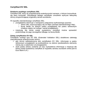 Certyfikat EV SSL Działanie zwykłego certyfikatu SSL Certyfikat SSL słuŜy do poświadczania autentyczności serwera, z którym komunikuje się dany komputer. Weryfikacja takiego certyfikatu umoŜliwia wykrycie fałszywej strony przypominającej oryginalny serwis eurobanku. W wypadku standardowego certyfikatu SSL: • przeglądarka informuje o nawiązaniu połączenia szyfrowanego poprzez: o adres URL rozpoczynający się od https (zamiast standardowego http), o ikonę kłódki na dolnym pasku przeglądarki lub pasku adresowym (miejsce zaleŜy od rodzaju i wersji przeglądarki), • instytucję dla której został wystawiony certyfikat moŜna sprawdzić przechodząc do jego szczegółów klikając na ikonę kłódki. Zalety certyfikatów EV SSL Certyfikatu nowego typu EV SSL (Extended Validation SSL) dodatkowo ułatwiają zweryfikowanie autentyczności strony: gdy strona zabezpieczona jest certyfikatem EV SSL, informacje w pasku adresowym przeglądarki są podświetlone na zielono (podświetlone elementy róŜnią się w zaleŜności od przeglądarki), obok paska adresu zostanie od razu wyświetlona informacja o instytucji dla której został wystawiony certyfikat (w wypadku serwisu eurobank online jest to Euro Bank S.A.) Strona z certyfikatem EV SSL w przeglądarce Internet Explorer 7: Strona z certyfikatem EV SSL w przeglądarce FireFox 3: Zalety certyfikatów EV SSL dostępne są w nowych wersjach przeglądarek. Z pośród przeglądarek rekomendowanych przez eurobank są to: Microsoft Internet Explorer 7, Mozilla Firefox 3. W wypadku uŜycia innych przeglądarek obsługujących certyfikat EV, sposób jego prezentacji moŜe się róŜnić od powyŜszego opisu. Na starszych wersjach tych przeglądarek (od Internet Exlorer 6 i FireFox 1.5) serwis eurobank online będzie nadal działał prawidłowo, jednak ułatwienia wynikające z certyfikatu EV SSL nie będą dostępne (pasek adresowy nie będzie podświetlany na zielono). Kontakt W wypadku jakichkolwiek wątpliwości co do autentyczności strony (w szczególności braku zielonego podświetlenia w przeglądarce obsługującej certyfikaty EV SSL lub niewłaściwej nazwy instytucji dla której wystawiony jest certyfikat) niezwłocznie skontaktuj się telefonicznie z eurobankiem pod numerem tel.: 0801 700 100. Więcej informacji na temat bezpiecznego korzystania z serwisu znajdziesz w „Instrukcji obsługi serwisu eurobank online” dostępnej na stronie www.eurobank.pl. Pamiętaj ! Zawsze sprawdzaj instytucję, dla której został wystawiony certyfikat. Samo nawiązanie połączenia szyfrowanego nie gwarantuje autentyczności strony.