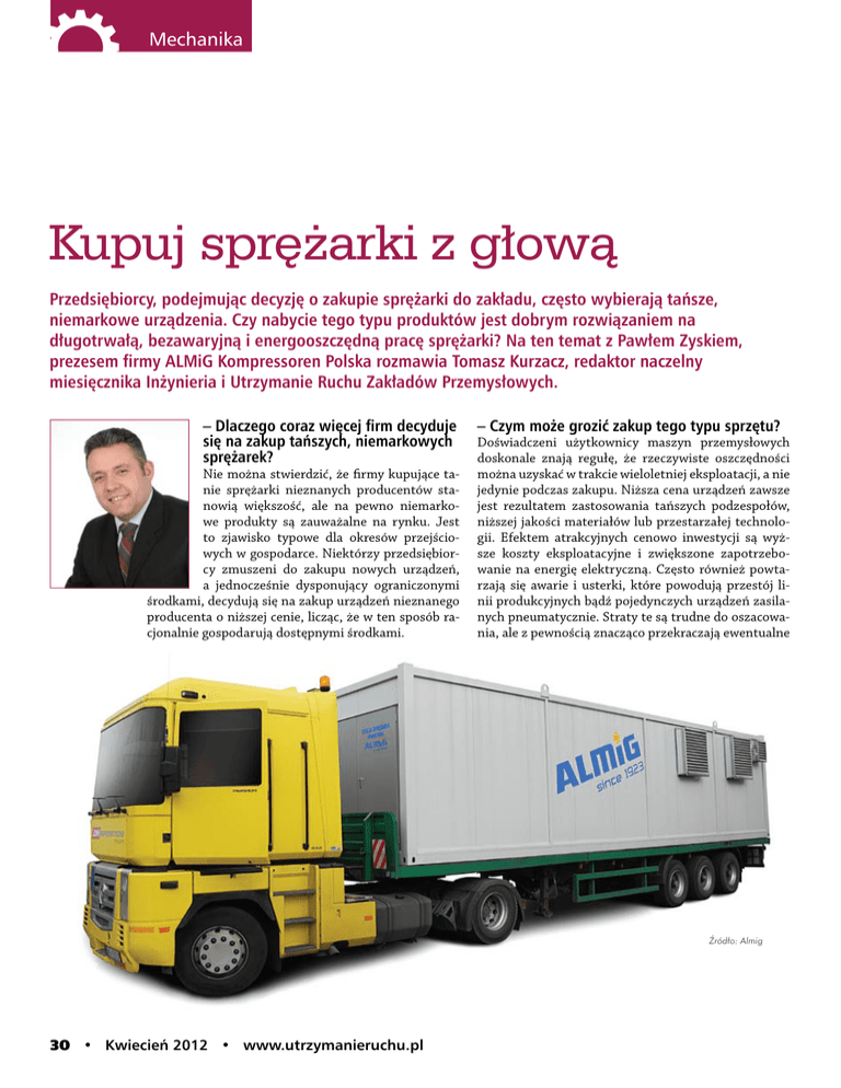Mechanika Kupuj sprężarki z głową Przedsiębiorcy, podejmując decyzję o zakupie sprężarki do zakładu, często wybierają tańsze, niemarkowe urządzenia. Czy nabycie tego typu produktów jest dobrym rozwiązaniem na długotrwałą, bezawaryjną i energooszczędną pracę sprężarki? Na ten temat z Pawłem Zyskiem, prezesem firmy ALMiG Kompressoren Polska rozmawia Tomasz Kurzacz, redaktor naczelny miesięcznika Inżynieria i Utrzymanie Ruchu Zakładów Przemysłowych. – Dlaczego coraz więcej firm decyduje się na zakup tańszych, niemarkowych sprężarek? Nie można stwierdzić, że firmy kupujące tanie sprężarki nieznanych producentów stanowią większość, ale na pewno niemarkowe produkty są zauważalne na rynku. Jest to zjawisko typowe dla okresów przejściowych w gospodarce. Niektórzy przedsiębiorcy zmuszeni do zakupu nowych urządzeń, a jednocześnie dysponujący ograniczonymi środkami, decydują się na zakup urządzeń nieznanego producenta o niższej cenie, licząc, że w ten sposób racjonalnie gospodarują dostępnymi środkami. – Czym może grozić zakup tego typu sprzętu? Doświadczeni użytkownicy maszyn przemysłowych doskonale znają regułę, że rzeczywiste oszczędności można uzyskać w trakcie wieloletniej eksploatacji, a nie jedynie podczas zakupu. Niższa cena urządzeń zawsze jest rezultatem zastosowania tańszych podzespołów, niższej jakości materiałów lub przestarzałej technologii. Efektem atrakcyjnych cenowo inwestycji są wyższe koszty eksploatacyjne i zwiększone zapotrzebowanie na energię elektryczną. Często również powtarzają się awarie i usterki, które powodują przestój linii produkcyjnych bądź pojedynczych urządzeń zasilanych pneumatycznie. Straty te są trudne do oszacowania, ale z pewnością znacząco przekraczają ewentualne Źródło: Almig 30 • Kwiecień 2012 • www.utrzymanieruchu.pl wyższe nakłady na zakup dobrej jakościowo sprężarki od dostawcy z wieloletnim doświadczeniem. Tanie sprężarki oferowane są przez niewielkie firmy lub rozpoczynające swoją działalność, gdyż konkurowanie ceną jest najprostszym i wymagającym najmniejszych nakładów sposobem pozyskania zamówienia. Należy przy tym pamiętać, że zakup urządzenia od firmy oferującej najniższą cenę za sprężarkę nieznanej marki wiąże się również z zaakceptowaniem gorszej obsługi posprzedażowej, co wynika z mniejszych nakładów dostawcy czy producenta na profesjonalne przygotowanie zespołu serwisowego i zaplecza magazynowego. Sprężarki ALMiG o zmiennej wydajności zapewniają największe oszczędności energetyczne – Dlaczego warto wybierać markowe urządzenia? Budowanie marki i renomy zawsze jest bardzo pracochłonne i kosztowne, dlatego też dostawcy markowych urządzeń, dbając o swój ciężko wypracowany wizerunek, oferują sprężarki nowocześniejsze, bardziej oszczędne energetycznie i bardziej niezawodne niż nieznani producenci, którzy nie dysponują wystarczającymi środkami na wieloletnie kosztowne badania technologiczne i modyfikacyjne swoich urządzeń. Dostawcy markowych urządzeń tacy jak np. ALMiG Kompressoren Polska (oferujący pełen typoszereg sprężarek obejmujący moce od 1,5 kW do 2000 kW w technologii sprężarek tłokowych, śrubowych z wtryskiem oleju, śrubowych bezolejowych i sprężarek odśrodkowych) mają odpowiednio przeszkolony i przygotowany zespół techników serwisu, dysponujący wieloma w pełni wyposażonymi samochodami serwisowymi i zapleczem magazynowym zlokalizowanym w Polsce i obejmującym kilka tysięcy części zamiennych. – Czy tania sprężarka zawsze oznacza zła? Nierzetelne byłoby określenie, że tania sprężarka zawsze jest zła, natomiast można stwierdzić, że każde tanie urządzenie jest mniej pewnym źródłem zasilania ze względu na niższą jakość wykonania bądź na brak pełnego wsparcia serwiso- Informacje o naszych sprężarkach o zmiennej wydajności i obniżeniu kosztów energii elektrycznej do 35% na stronie www.almig.pl Nasze urządzenia zaspokoją każde zapotrzebowanie na sprężone powietrze: sprężarki śrubowe z wtryskiem oleju (2,2 – 500 kW) sprężarki bezolejowe (2,2 – 250 kW) sprężarki tłokowe (0,75 – 45 kW) turbosprężarki (do 2 MW) sprężarki wysokociśnieniowe (do 420 bar) układy uzdatniania sprężonego powietrza układy sterowania i monitoringu systemy odzysku energii Nasze innowacyjne rozwiązania znajdują zastosowanie w produkowanych urządzeniach, jak również w obsłudze serwisowej. Sprawdź nas… www.almig.pl ALMiG Kompressoren Polska S.A. • ul. K. Kolumba 22 02-288 Warszawa • tel.: 22 868 00 33, 22 846 62 54 e-mail: [email protected] • www.almig.pl Źródło: Almig Mechanika wego ze strony dostawcy. Również, co bardzo istotne, w czasach nieprzerwanie rosnących cen energii należy podkreślić, że tanie sprężarki są bardziej energochłonne, co wynika z zastosowania silników elektrycznych o mniejszej sprawności, bloków śrubowych o niższych wydajnościach, bardziej energochłonnych sposobów przeniesienia napędu, niedowymiarowania układów chłodzenia czy mniej zaawansowanych układów sterowania. – Na co należy zwrócić uwagę przy zakupie nowej sprężarki? Decydując się na zakup nowej sprężarki, należy zwrócić uwagę na sposób podawania parametrów przez dostawców. Wydajność określona w litrach na minutę (l/ min) lub w metrach sześciennych na minutę bądź na godzinę (m3/min; m3/h) musi być odniesiona do normy definiującej sposób określenia wydajności. Normą obowiązującą w krajach Unii Europejskiej jest ISO 1217 aneks C. Oferenci podający wydajność i ciśnienia bez odniesienia się do normy robią to nie bez przyczyny. W przypadku niezgodności deklarowanej wydajności z zapotrzebowaniem zasilanych urządzeń i z ewentualnie wykonanym pomiarem jest znacznie trudniej udowodnić takiemu dostawcy wprowadzenie w błąd nabywcy. Ważnym para