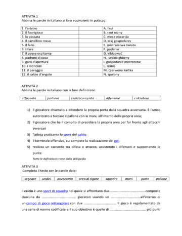 ATTIVITÀ 1 Abbina le parole in italiano ai loro equivalenti in polacco: 1. l'arbitro 2. il fuorigioco 3. la passata 4. il cartellino rosso 5. il fallo 6. tifare 7. il paese ospitante 8. padroni di casa 9. gara d'apertura 10. i mondiali 11. il pareggio 12. il calcio d'angolo A. faul B. rzut rożny C. mecz otwarcia D. kraj gospodarzy E. mistrzostwa świata F. podanie G. kibicować H. sędzia główny I. gospodarze mistrzostw L. remis M. czerwona kartka N. spalony ATTIVITÀ 2 Abbina le parole in italiano con le loro definizioni: attacante portiere centrocampista difensore calciatore 1) il giocatore chiamato a difendere la propria porta dalla squadra avversaria. È l'unico autorizzato a toccare il pallone con le mani, all'interno della propria area; 2) il giocatore che ha il compito di presidiare la propria area per far fronte agli attacchi avversari 3) l'atleta praticante lo sport del calcio. 4) il terminale offensivo, cui compete la realizzazione dei gol; 5) realizza un raccordo tra difesa e attacco, assistendo i difensori e supportando le punte Tutte le definizioni tratte dalla Wikipedia ATTIVITÀ 3 Completa il testo con le parole date: segnare undici avversaria area di rigore squadre mani porte pallone Il calcio è uno sport di squadra nel quale si affrontano due.......................................composte ciascuna da ..................................... giocatori usando un ................................all'interno di un campo di gioco rettangolare con due ................................... Il gioco è regolamentato da una serie di norme codificate e il suo obiettivo è quello di ....................................... più punti (detti gol o reti) dell'avversario, facendo passare il pallone fra i pali della porta ...................................... La regola principale che caratterizza e differenzia questo sport rispetto al rugby e alla pallamano è che la palla non può essere toccata o colpita con .............................. Il giocatore deputato al ruolo di portiere è l'unico che può toccare il pallone con le mani, ma solo all'interno della propria .......................................... La descrizione tratta dalla Wikipedia ATTIVITÀ 4 Conosci le squadre italiane? Abbinale ai nomi delle città. 1.Associazione Calcio 2.Associazione Sportiva 3.AC Fiorentina 4.Società Sportiva Lazio 5.Juventus 6.Internazionale a) Firenze b) Torino c) Roma d) Roma e) Milano f) Milano