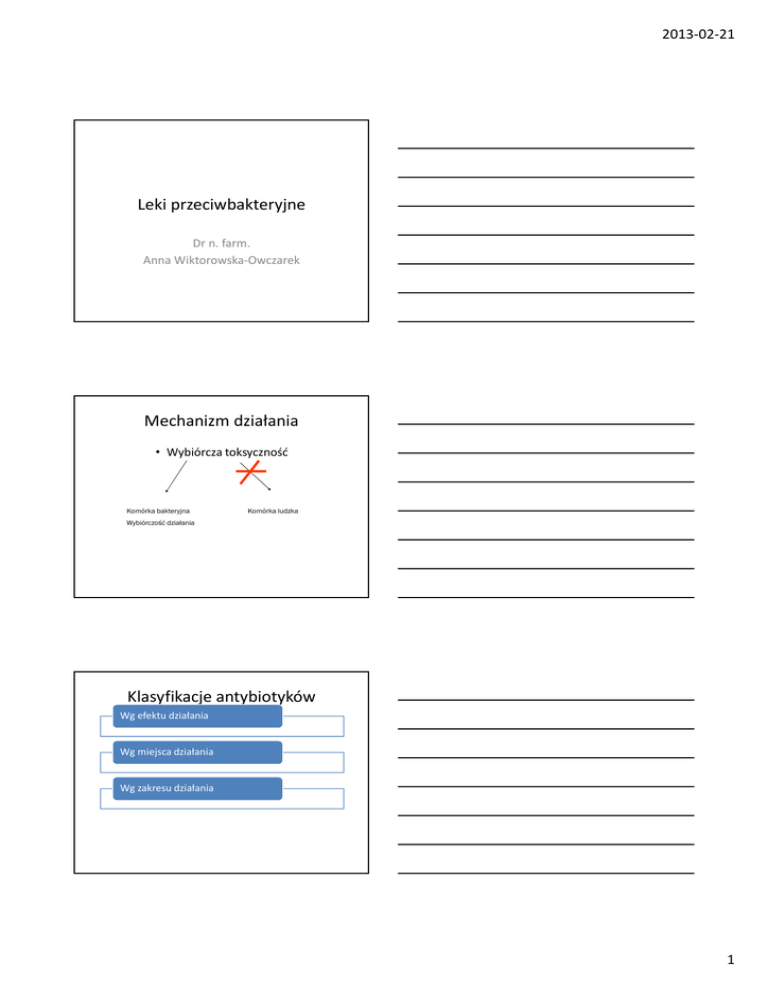 2013-02-21 Leki przeciwbakteryjne Dr n. farm. Anna Wiktorowska-Owczarek Mechanizm działania • Wybiórcza toksyczność Komórka bakteryjna Komórka ludzka Wybiórczość działania Klasyfikacje antybiotyków Wg efektu działania Wg miejsca działania Wg zakresu działania 1 2013-02-21 MIC – MINIMALNE STĘŻENIE HAMUJĄCE MBC – MINIMALNE STĘŻENIE BAKTERIOBÓJCZE bakteriobójcze bakteriostatyczne Dany lek może być bakteriostatyczny względem jednego organizmu i bakteriobójczy względem innego. Leki bakteriostatyczne względem danego patogenu to te, których MBC jest wyższe od MIC • Dla optymalnego przebiegu antybiotykoterapii w miejscu infekcji stężenie pozostawało stale powyżej wartości MIC • Wymagane stałe odstępy między dawkami co 8 godzin (nie 3 x dziennie) Efekt antybakteryjny czynnika bakteriobójczego i bakteriostatycznego Kiedy wybrać bakteriobójczy lek? 2 2013-02-21 Antybiotyki bakteriobójcze • • • • • • Beta –laktamowe Glikopeptydy Bacytracyna Daptomycyna Aminoglikozydy Fluorochinolony Antybiotyki bakteriostatyczne • • • • • • • • Tetracykliny Makrolidy Linkozamidy Chloramfenikol Linezolid Streptograminy Sulfonamidy Kotrimoksazol Klasyfikacja antybiotyków wg miejsca działania Hamujące syntezę ściany komórkowej Hamujące syntezę białka Hamujące metabolizm kwasu foliowego Beta-laktamy Glikopeptydy Bacytracyna Daptomycyna Aminoglikozydy Sulfonamidy Makrolidy Trimetoprim Tetracykliny Linkozamidy Chloramfenikol Streptograminy Linezolid Wpływają na metabolizm bakteryjnych kwasów nukleinowych Fluorochinolony 3 2013-02-21 Racjonalna antybiotykoterapia • Kiedy i jakich leków przeciwdrobnoustrojowych powinniśmy używać? • Oporność drobnoustrojów Rodzaje antybiotykoterapii Konwencjonalna • W przypadku infekcji. Czas leczenia do 14 dni Intensywna • Leczenie infekcji o ostrym przebiegu Profilaktyka Przewlekła • Zapobieganie infekcjom bakteryjnym. Leczenie długotrwałe powyżej 14 dni Stosowanie profilaktyczne antybiotyków Profilaktyka przeciwbakteryjna –Pacjenci z przebytą chorobą reumatyczną serca –Pacjenci przed zabiegami chirurgicznymi i stomatologicznymi –Zapobieganie gruźlicy i zapalenia opon mózgowo-rdzeniowych u osób mających kontakt z chorymi –Leczenie kobiet w ciąży zakażonych wirusem HIV –ochrona dziecka 4 2013-02-21 Czynniki decydujące o wyborze antybakteryjnego leku •Drug specific – Rodzaj bakterii powodującej infekcje – Spektrum działania i wpływ na florę niecelowaną – Dawkowania – Farmakokinetyczne właściwości – Farmakodynamiczne właściwości – Side effects –działania niepożądane – Interakcje – Koszt •Patient specific – Anatomiczna lokalizacja infekcji – Antymikrobiologiczna historia – Alergiczna historia – Funkcja nerek i wątroby – Stosowane inne leki – Ciąża i laktacja – Bezpieczeństwo stosowania •Empiric therapy – in the critically ill patient • • • • Terapia empiryczna Przebieg – Nagły – Pośredni – Stopniowy Miejsce nabycia infekcji – Zewnątrzszpitalna – Wewnatrzszpitalna Lokalna sytuacja epidemiologiczna Stan układu immunologicznego pacjenta – Kryteria wyboru • Cechy kliniczne infekcji • Miejsce infekcji • Ciężkość zakażenia • Stosowane antybiotyki szrokowidmowe 5 2013-02-21 Czynniki decydujące o wyborze leku przeciwbakteryjnego •Drug specific •Patient specific – Rodzaj bakterii powodującej infekcje – Spektrum działania i wpływ na florę niecelowaną – Dawkowania – Farmakokinetyczne właściwości – Farmakodynamiczne właściwości – Side effects – Interakcje – Koszt – Anatomiczna lokalizacja infekcji – Antimikrobiologiczna historia – Alergiczna historia – Renal and hepatic function – Stosowane inne leki – Ciąża i laktacja – Bezpieczeństwo stosowania Rzekomobłoniaste zapalenie jelita grubego • Clostridium difficile Pseudomembranous colitis (PMC) High risk Medium risk Low risk Clindamycin Cephalosporin (2&3) Macrolides Tetracyclines Metronidazole Vancomycin Aminoglycosides Penicillins with betabeta-lactamase inhibitors Chinolones 6 2013-02-21 Symptoms PMC • • Symptoms can start as early as the first day of antimicrobial therapy or several weeks after antibiotc therapy is completed. Diarrhea – Acute watery diarrhea with lower abdominal pain – C. difficile toxins are present in stool – Mild, with only 3 or 4 loose watery stools per day – In colitis – profuse, watery diarrhea with 5 to 15 bowel movements per day, abdominal pain, abdominal distention, nausea and anorexia Treatment of PMC • Metronidazol (10-14 dni) • Vankomycyna 125 mg co 6 h p.o. Czynniki decydujące o wyborze antybakteryjnego leku •Drug specific – Rodzaj bakterii powodującej infekcje – Spektrum działania i wpływ na florę niecelowaną – Dawkowania –Farmakokinetyczn e właściwości – Farmakodynamiczne właściwości – Side effects – Interakcje – Koszt •Patient specific – Anatomiczna lokalizacja infekcji – Antimikrobiologiczna historia – Alergiczna historia – Renal and hepatic function – Stosowane inne leki – Ciąża i laktacja – Bezpieczeństwo stosowania 7 2013-02-21 Bioavailability Drugs wchich are absorbed from GIS Drugs wchich are not absorbed from GIS Amoxicilin Aminoglycosides Macrolides Tetracyclines Quinolones Drugs which are sensitive to acidic pH Cefuroxime Vancomycin Właściwości farmakokinetyczne/ •Leki, które miejsce infekcji przechodzą przez bariere krew: mózg Farmakokinetyka antybiotyków • Przenikanie do płynu mózgowo rdzeniowego – Dobrze penetrują do oun • Metronidazol • Mezlocylina • kotrimoksazol – Nie przenikają lub bardzo słabo: • amfoterycyna B, • linkozamidy, makrolidy, ketokonazol, itrakonazol 8 2013-02-21 Farmakokinetyka antybiotykoterapii • Penetrujące do oun w stanie zapalnym – Amikacyna – Penicylina G – Karbenicylina – Aztreonam – Cefolosporyny I