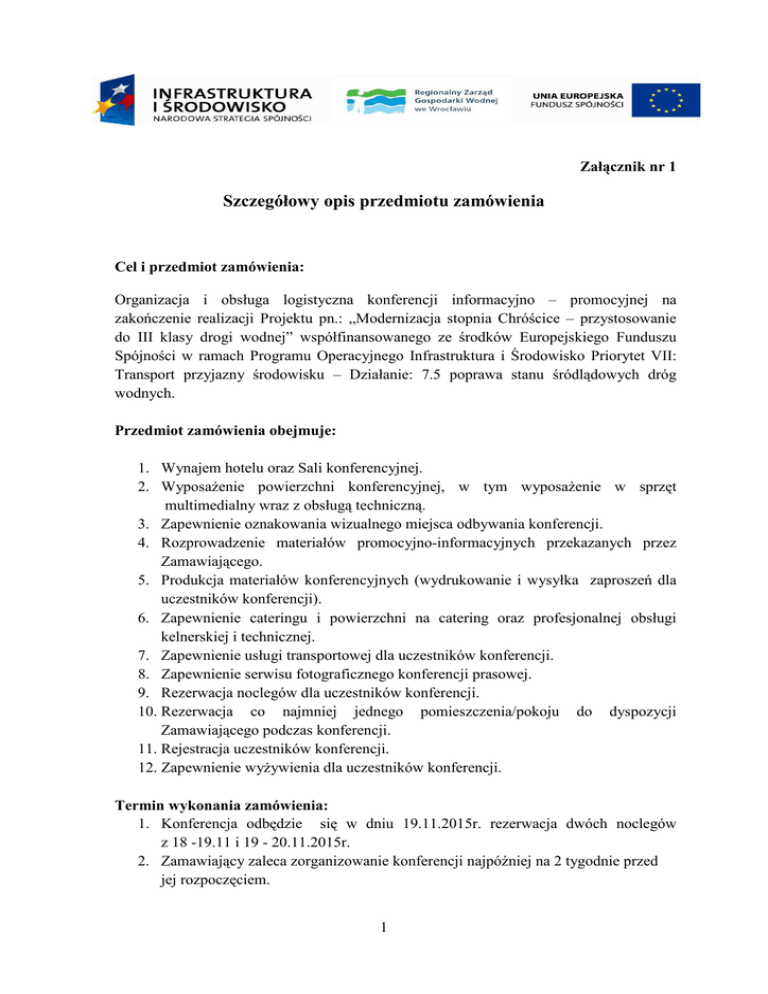 Załącznik nr 1 Szczegółowy opis przedmiotu zamówienia Cel i przedmiot zamówienia: Organizacja i obsługa logistyczna konferencji informacyjno – promocyjnej na zakończenie realizacji Projektu pn.: „Modernizacja stopnia Chróścice – przystosowanie do III klasy drogi wodnej” współfinansowanego ze środków Europejskiego Funduszu Spójności w ramach Programu Operacyjnego Infrastruktura i Środowisko Priorytet VII: Transport przyjazny środowisku – Działanie: 7.5 poprawa stanu śródlądowych dróg wodnych. Przedmiot zamówienia obejmuje: 1. Wynajem hotelu oraz Sali konferencyjnej. 2. Wyposażenie powierzchni konferencyjnej, w tym wyposażenie w sprzęt multimedialny wraz z obsługą techniczną. 3. Zapewnienie oznakowania wizualnego miejsca odbywania konferencji. 4. Rozprowadzenie materiałów promocyjno-informacyjnych przekazanych przez Zamawiającego. 5. Produkcja materiałów konferencyjnych (wydrukowanie i wysyłka zaproszeń dla uczestników konferencji). 6. Zapewnienie cateringu i powierzchni na catering oraz profesjonalnej obsługi kelnerskiej i technicznej. 7. Zapewnienie usługi transportowej dla uczestników konferencji. 8. Zapewnienie serwisu fotograficznego konferencji prasowej. 9. Rezerwacja noclegów dla uczestników konferencji. 10. Rezerwacja co najmniej jednego pomieszczenia/pokoju do dyspozycji Zamawiającego podczas konferencji. 11. Rejestracja uczestników konferencji. 12. Zapewnienie wyżywienia dla uczestników konferencji. Termin wykonania zamówienia: 1. Konferencja odbędzie się w dniu 19.11.2015r. rezerwacja dwóch noclegów z 18 -19.11 i 19 - 20.11.2015r. 2. Zamawiający zaleca zorganizowanie konferencji najpóźniej na 2 tygodnie przed jej rozpoczęciem. 1 Miejsce realizacji zamówienia: Konferencja powinna odbyć się w województwie opolskim w odległości do 30 km od granic administracyjnych miejscowości Chróścice. Ośrodek powinien spełniać wymogi hotelu 3 gwiazdkowego. Liczba uczestników i czas trwania: 1. Konferencja dla max 160 osób. 2. Czas trwania konferencji wynosić będzie 2 dni w tym dwa noclegi. Ramowy plan konferencji: 1 dzień: 1. Rejestracja i zakwaterowanie uczestników konferencji w pokojach hotelowych ( dla max. 20 osób ). 2. Kolacja - zorganizowana w restauracji hotelowej, powinna zawierać ciepły posiłek i przystawki oraz ciepłe i zimne napoje (dla max. 20 osób). 2 dzień: 1. Śniadanie tzw. „stół szwedzki” dla zakwaterowanych w hotelu uczestników konferencji (dla max. 20 osób) 2. Rejestracja uczestników konferencji i odbiór materiałów promocyjno – informacyjnych 3. Otwarcie konferencji i powitanie uczestników ( przez Dyrektora RZGW) 4. Wystąpienie zaproszonych gości: Minister Środowiska, Prezes KZGW, Dyrektor CUPT, Marszałek Województwa Opolskiego, 5. Prezentacja multimedialna na temat realizowanych inwestycji przez RZGW we Wrocławiu. 6. Prezentacja multimedialna na temat realizowanej inwestycji pn. „Modernizacja stopnia Chróścice – przystosowanie do III klasy drogi wodnej”. 7. Prezentacja filmu na temat realizowanej inwestycji pn. „Modernizacja stopnia Chróścice – przystosowanie do III klasy drogi wodnej”. 8. Przerwa kawowa – catering 9. Podczas przerwy cateringowej odbędzie się konferencja prasowa – w formie stand-breifing prasowego. 10. Wyjazd techniczny do miejscowości Chróścice – wizja lokalna zrealizowanej inwestycji pn. „Modernizacja stopnia Chróścice – przystosowanie do III klasy drogi wodnej”. Po przyjeździe do Chróścic uczestnicy konferencji ustawią się pod namiotami rozłożonymi przez Wykonawcę w miejscu wyznaczonym przez Zamawiającego. Wykonawca ustawi ściankę pop-up lub roll- up, dostarczoną przez Zamawiającego oraz zapewni mikrofony na statywach + nagłośnienie + przewody do podpięcia, sprzęt audio. Zamawiający zapewni źródło prądu do podłączenia powyższych urządzeń. 11. Uroczyste otwarcie obiektu (przecięcie wstęgi). 2 Wykonawca zapewni: ⋅ błękitno-niebieską wstęgę z satyny, szerokość 10 cm i długość 10 mb. + stojaki, ⋅ dwie kokardy do dekoracji, ⋅ nożyce duże 3 szt. (wykonane ze stali węglowej niklowane, kolor srebrny min. 23 cm) oraz etui, ⋅ paterę do podawania nożyczek (np. szerokość 26 cm. wysokość 3 cm, metal, srebrny kolor, niklowana) ⋅ stolik okolicznościowy z wytworną oprawą wizualną ⋅ oprawę muzyczną adekwatną podczas przecinania wstęgi. 12. Powrót do hotelu – uroczysty obiad dla 160 uczestników konferencji. 13. Sesja dyskusyjna na temat inwestycji w nowej perspektywie POIiŚ. 14. Kolacja dla około 80 osób. 3 dzień Śniadanie tzw. „stół szwedzki” dla zakwaterowanych w hotelu uczestników konferencji (dla max. 15 osób). Harmonogram realizacji przedmiotu zamówienia zostanie ustalony niezwłocznie po podpisaniu umowy (tj. w dniu podpisania umowy – harmonogram ramowy, co najmniej 7 dni przed rozpoczęciem konferencji harmonogram szczegółowy, w uzgodnieniu z Wykonawcą. Zamawiający zastrzega sobie możliwość zmiany/modyfikacji listy uczestników w celu zapewnienia pełnego wykorzystania miejsc, nie później niż 3 dni przed rozpoczęciem konferencji. Zamawiający zastrzega sobie prawo do rozliczenia usług cateringowych na podstawie rzeczywistej listy osób uczestniczących w konferencji, nie później niż 7 dni przed rozpoczęciem konferencji. Zakwaterowanie uczestników: Zapewnienie noclegów z pierwszego na drugi dzień konferencji dla max. 20 osób oraz dla 15 osób w drugim dniu konferencji w pokojach jednoosobowych i dwuosobowych, z możliwością pojedynczego wykorzystania. Każdy pokój powinien posiadać łazienkę. Zakwaterowanie uczestników ma nastąpić w jednym budynku hotelowym, względnie w kilku budynkach, ale składających się na jeden zamknięty ośrodek. Niedopuszczalne jest zakwaterowanie uczestników w tzw. formule „rozrzucenia na mieście”. Wykonawca zobowiązany jest na życzenie zapewnić uczestnikom rezerwację do