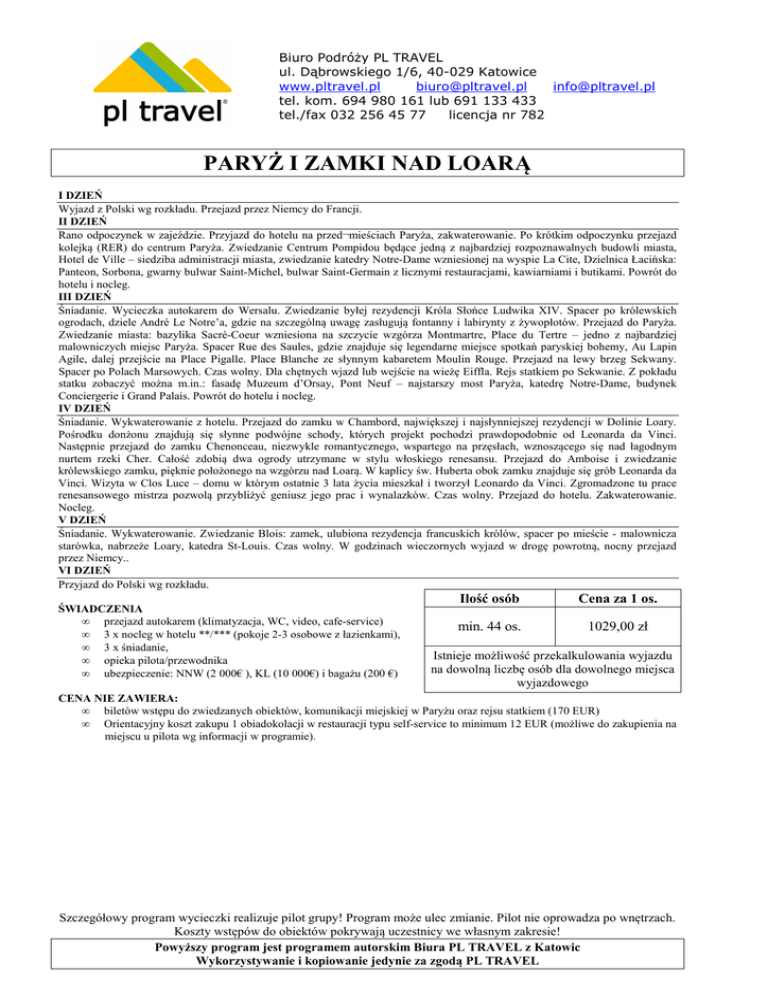 Biuro Podróży PL TRAVEL ul. Dąbrowskiego 1/6, 40-029 Katowice www.pltravel.pl [email protected] [email protected] tel. kom. 694 980 161 lub 691 133 433 tel./fax 032 256 45 77 licencja nr 782 PARYŻ I ZAMKI NAD LOARĄ I DZIEŃ Wyjazd z Polski wg rozkładu. Przejazd przez Niemcy do Francji. II DZIEŃ Rano odpoczynek w zajeździe. Przyjazd do hotelu na przed¬mieściach Paryża, zakwaterowanie. Po krótkim odpoczynku przejazd kolejką (RER) do centrum Paryża. Zwiedzanie Centrum Pompidou będące jedną z najbardziej rozpoznawalnych budowli miasta, Hotel de Ville – siedziba administracji miasta, zwiedzanie katedry Notre-Dame wzniesionej na wyspie La Cite, Dzielnica Łacińska: Panteon, Sorbona, gwarny bulwar Saint-Michel, bulwar Saint-Germain z licznymi restauracjami, kawiarniami i butikami. Powrót do hotelu i nocleg. III DZIEŃ Śniadanie. Wycieczka autokarem do Wersalu. Zwiedzanie byłej rezydencji Króla Słońce Ludwika XIV. Spacer po królewskich ogrodach, dziele André Le Notre’a, gdzie na szczególną uwagę zasługują fontanny i labirynty z żywopłotów. Przejazd do Paryża. Zwiedzanie miasta: bazylika Sacré-Coeur wzniesiona na szczycie wzgórza Montmartre, Place du Tertre – jedno z najbardziej malowniczych miejsc Paryża. Spacer Rue des Saules, gdzie znajduje się legendarne miejsce spotkań paryskiej bohemy, Au Lapin Agile, dalej przejście na Place Pigalle. Place Blanche ze słynnym kabaretem Moulin Rouge. Przejazd na lewy brzeg Sekwany. Spacer po Polach Marsowych. Czas wolny. Dla chętnych wjazd lub wejście na wieżę Eiffla. Rejs statkiem po Sekwanie. Z pokładu statku zobaczyć można m.in.: fasadę Muzeum d’Orsay, Pont Neuf – najstarszy most Paryża, katedrę Notre-Dame, budynek Conciergerie i Grand Palais. Powrót do hotelu i nocleg. IV DZIEŃ Śniadanie. Wykwaterowanie z hotelu. Przejazd do zamku w Chambord, największej i najsłynniejszej rezydencji w Dolinie Loary. Pośrodku donżonu znajdują się słynne podwójne schody, których projekt pochodzi prawdopodobnie od Leonarda da Vinci. Następnie przejazd do zamku Chenonceau, niezwykle romantycznego, wspartego na przęsłach, wznoszącego się nad łagodnym nurtem rzeki Cher. Całość zdobią dwa ogrody utrzymane w stylu włoskiego renesansu. Przejazd do Amboise i zwiedzanie królewskiego zamku, pięknie położonego na wzgórzu nad Loarą. W kaplicy św. Huberta obok zamku znajduje się grób Leonarda da Vinci. Wizyta w Clos Luce – domu w którym ostatnie 3 lata życia mieszkał i tworzył Leonardo da Vinci. Zgromadzone tu prace renesansowego mistrza pozwolą przybliżyć geniusz jego prac i wynalazków. Czas wolny. Przejazd do hotelu. Zakwaterowanie. Nocleg. V DZIEŃ Śniadanie. Wykwaterowanie. Zwiedzanie Blois: zamek, ulubiona rezydencja francuskich królów, spacer po mieście - malownicza starówka, nabrzeże Loary, katedra St-Louis. Czas wolny. W godzinach wieczornych wyjazd w drogę powrotną, nocny przejazd przez Niemcy.. VI DZIEŃ Przyjazd do Polski wg rozkładu. ŚWIADCZENIA • przejazd autokarem (klimatyzacja, WC, video, cafe-service) • 3 x nocleg w hotelu **/*** (pokoje 2-3 osobowe z łazienkami), • 3 x śniadanie, • opieka pilota/przewodnika • ubezpieczenie: NNW (2 000€ ), KL (10 000€) i bagażu (200 €) Ilość osób Cena za 1 os. min. 44 os. 1029,00 zł Istnieje możliwość przekalkulowania wyjazdu na dowolną liczbę osób dla dowolnego miejsca wyjazdowego CENA NIE ZAWIERA: • biletów wstępu do zwiedzanych obiektów, komunikacji miejskiej w Paryżu oraz rejsu statkiem (170 EUR) • Orientacyjny koszt zakupu 1 obiadokolacji w restauracji typu self-service to minimum 12 EUR (możliwe do zakupienia na miejscu u pilota wg informacji w programie). Szczegółowy program wycieczki realizuje pilot grupy! Program może ulec zmianie. Pilot nie oprowadza po wnętrzach. Koszty wstępów do obiektów pokrywają uczestnicy we własnym zakresie! Powyższy program jest programem autorskim Biura PL TRAVEL z Katowic Wykorzystywanie i kopiowanie jedynie za zgodą PL TRAVEL