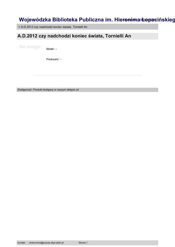 Utworzono : 02Łopacińskieg March 2017 Wojewódzka Biblioteka Publiczna im. Hieronima > A.D.2012 czy nadchodzi koniec świata, Tornielli An A.D.2012 czy nadchodzi koniec świata, Tornielli An No image Model : - Producent : - Dostępność: Produkt dostępny w naszym sklepie od kontakt : - [email protected] Strona 1