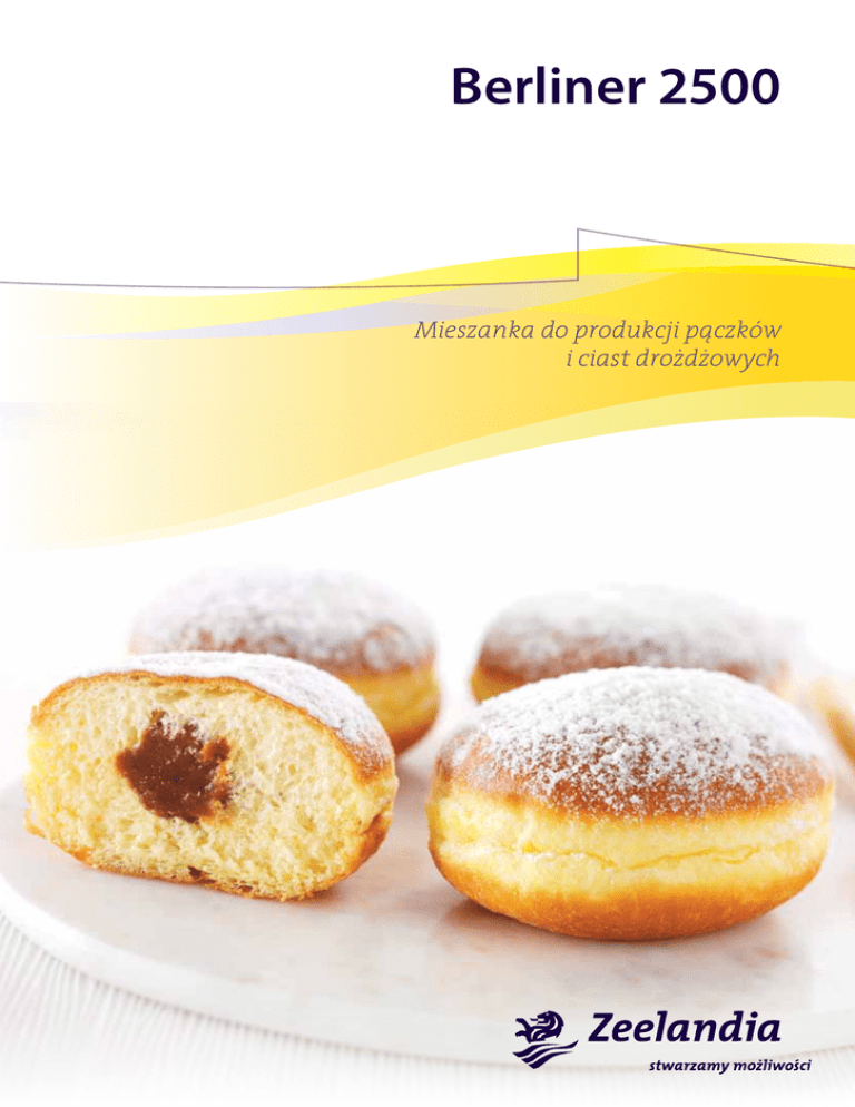 Berliner 2500 Mieszanka do produkcji pączków i ciast drożdżowych Berliner 2500 to mieszanka do produkcji pączków i ciast drożdżowych pozwalająca przygotować produkt wysokiej jakości w ekonomiczny i bezproblemowy sposób. Zalety produktu: •w szechstronne zastosowanie – sprawdza się doskonale do produkcji pączków, jak i drożdżówek, pieczywa półcukierniczego i ciast drożdżowych •b ogata receptura zawierająca jaja w proszku, cukier i dodatki smakowe, decydujące o wygodzie produkcji •b ezpieczeństwo mikrobiologiczne •p ozwala skrócić czas przygotowania ciasta i zwiększyć wydajność produkcji poprzez wyeliminowanie odważania składników • z apewnia bezpieczną produkcję, dając dobrą stabilność ciasta, szczególnie istotną podczas przekładania kęsów ciasta do smażenia •p ączek na bazie Berlinera 2500 jest kruchy, o drobnej strukturze i delikatnym miękiszu • s kórka ładnie wybarwiona, gładka, nie jest pomarszczona •n ie nasiąka tłuszczem podczas smażenia, jego skórka pozostaje sucha •p ączek ma bardzo dobrą objętość, utrzymuje wysoką obrączkę tuż po wysmażeniu i podczas przechowywania Pączki Przygotowanie Składniki 11-2015 2,5 kg 10 kg 0,7 kg 0,7 l 5,2 kg Berliner 2500 mąka pszenna drożdże olej woda Mieszać wszystkie składniki 4 minuty na wolnych, 6 minut na szybkich obrotach. Temperatura ciasta 26-28°C. Fermentacja wstępna 15 minut. Podzielić ciasto na presy o masie 1,5 kg. Fermentacja w presach 10 minut. Podzielić presy na kęsy (30 sztuk) z zaokrągleniem, ułożyć na deskach. Fermentacja końcowa około 35 minut w garowni i około 20 minut poza garownią. Smażyć w oleju (temperatura 180°C) przez 7 minut z dwukrotnym odwróceniem pączka. Zeelandia sp. z o.o. ul. Sowia 6, 62-080 Tarnowo Podgórne tel. 61 664 76 00, fax 61 664 77 00 infolinia 0 800 800 106, e-mail: [email protected] www.zeelandia.pl