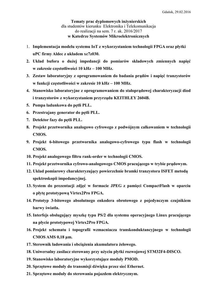 Gdańsk, 29.02.2016 Tematy prac dyplomowych inżynierskich dla studentów kierunku Elektronika i Telekomunikacja do realizacji na sem. 7 r. ak. 2016/2017 w Katedrze Systemów Mikroelektronicznych 1. Implementacja modelu systemu IoT z wykorzystaniem technologii FPGA oraz płytki uPC firmy Aldec z układem xc7z030. 2. Układ bufora o dużej impedancji do pomiarów składowych zmiennych napięć w zakresie częstotliwości 10 kHz – 100 MHz. 3. Zestaw laboratoryjny z oprogramowaniem do badania prądów i napięć tranzystorów w funkcji częstotliwości w zakresie 10 kHz – 100 MHz. 4. Stanowisko laboratoryjne z oprogramowaniem do stałoprądowej charakteryzacji diod i tranzystorów z wykorzystaniem przyrządu KEITHLEY 2604B. 5. Pompa ładunkowa do pętli PLL. 6. Przestrajany generator do pętli PLL. 7. Detektor fazy do pętli PLL. 8. Projekt przetwornika analogowo cyfrowego z podwójnym całkowaniem w technologii CMOS. 9. Projekt 6-bitowego przetwornika analogowo-cyfrowego typu flash w technologii CMOS. 10. Projekt analogowego filtru rank-order w technologii CMOS. 11. Projekt przetwornika cyfrowo-analogowego CMOS pracującego w trybie prądowym. 12. Układ pomiarowy charakteryzujący powierzchnie bramki tranzystora ISFET metodą spektroskopii impedancyjnej. 13. System do prezentacji zdjęć w formacie JPEG z pamięci CompactFlash w oparciu o płytę prototypową Virtex2Pro FPGA. 14. Prototyp 3-bitowego absolutnego enkodera obrotowego z pojedynczym czujnikiem barwy światła. 15. Interfejs obsługujący myszkę typu PS/2 dla systemu operacyjnego Linux pracującego na płycie prototypowej Virtex2Pro FPGA. 16. Projekt schematu i topografii wzmacniacza transkonduktancyjnego w technologii CMOS AMS 0,18 μm. 17. Sterownik ładowania i obciążenia akumulatora żelowego. 18. Uniwersalny zasilacz sterowany przy użyciu płytki rozwojowej STM32F4-DISCO. 19. Stanowisko laboratoryjne wykorzystujące moduły PMOD. 20. Sprzętowe moduły do transmisji dźwięku przez sieć Ethernet. 21. Sprzętowe moduły do sterowania pojazdem elektrycznym. Temat w języku polskim Implementacja modelu systemu IoT z wykorzystaniem technologii FPGA oraz płytki uPC firmy Aldec z układem xc7z030. Temat w języku angielskim Implementation model of the IoT system using FPGA logic, based on uPC Aldec board and chip Zynq xc7z030. Opiekun pracy prof. dr hab. inż. Stanisław Szczepański Konsultant pracy mgr inż. Wojciech Żebrowski (Alatek) Cel pracy Zadania Literatura Uwagi Temat w języku polskim Temat w języku angielskim Opiekun pracy Konsultant pracy Cel pracy Zadania Literatura Uwagi Celem pracy jest opracowanie systemu inteligentnego domu realizującego koncepcję "Internet of Things". Model urządzenia powinien współpracować z procesorem Cortex A9 i umożliwiać wykorzystanie koncepcji w systemie operacyjnym Linux (Petalinux lub Android). 1. Zaprojektowanie systemu w opraciu o wybrane czujniki. 2. Wykonanie koncepcji inteligentnego domu w postaci Ipcora,(warstwa fizyczna w FPGA, warstwa programowa Cortex A9). 3. Opracowanie sterowników dla systemu operacyjnego Linux. 4. Wykonanie aplikacji w środowisku Xilinx SDK. 5. Napisanie aplikacji dla smartfona z systemem Android. [1.] Louise H.Crockett Ross A. Elliot Martin A. Enderwitz Robert W. Stewart Department of Electronic and Electrical Engineering University of Strathclyde Glasgow, Scotland, UK „Embedded Processing with the ARM®Cortex® -A9 on the Xilinx ® Zynq®-7000 All Programmable SoC”.edition 1 year 2014. [2.] Kevin Ashton, "That 'Internet of Things' Thing", RFID Journal, 22 June 2009. [3.] Kevin Ashton “Internet of Things” year 1999. [4.] Bruce Eckel - „Thinking In C” Edycja Polska 2002. [5.] Peter Flake „System Verilog for Design” rok 2010. [6.] Roman Wantoch-Rekowski „Android w praktyce : projektowanie aplikacji” rok 2014 . Projekt dotyczy systemu do sterowania "inteligentnym domem" z użyciem możliwości technologii "Internet of Things". Układ bufora o dużej impedancji do pomiarów składowych zmiennych napięć w zakresie częstotliwości 10 kHz – 100 MHz. High impedance buffer circuit for measurement of AC components of voltages for the frequency range of 10 kHz – 100 MHz. dr hab. inż. Piotr Płotka dr hab. inż. Piotr Płotka Układ bufora włączanego między badany tranzystor i oscyloskop, służący do pomiaru amplitud i faz składowych zmiennych napięć i prądów tranzystorów małej mocy w zakresie 10 kHz – 100 MHz. Zaprojektowany bufor powinien mieć moduł impedancji znacznie większy od modułów imedancji wejściowych i wyjściowych badanych tranzystorów. 1. Zapoznanie się z małosygnałowymi właściwościami tranzystorów bipolarnych i MOS w zależności od częstotliwości sygnału. 2. Wybór elementów, projekt i uruchomienie układu bufora. 3. Projekt i uruchomienie prostego wzmacniacza WE (WS) z czterema buforami, umożliwiającego określanie zależności modułów i faz prądów i napięć wejściowych i wyjściowych od częstotliwości sygnału. [1.] Karty katalogowe wybranych układów scalonych i elementów – j. angielski. [2.] R. Paul, Technika Pomiarów Tranzystorów, WKiŁ, Warszawa 1973. [3.] E. Stolarski, Miernictwo Tranzystorowe, WNT, Warszawa 1984. [4.] D. K. Schroder, "Semiconductor Material and Device Characterization", 3. wyd., Wiley, 2006 [5.] M.Polowczyk, E.Klugmann, Przyrządy Półprzewodnikowe", Wyd.PG, 2001. [6.] W. Marciniak, „Przyrządy półprzewodnikowe i układy scalone”, WNT, 1979. Temat w języku polskim Temat w języku angielskim Opiekun pracy Konsultant pracy Cel pracy Zadania Literatura Uwagi Zestaw laboratoryjny z oprogramowaniem do badania prądów i napięć tranzystorów w funkcji częstotliwości w zakresie 10 kHz – 100 MHz. Laboratory setup and software for testing of current and voltage frequency dependencies of transistors in the range of 10 kHz – 100 MHz. dr hab. inż. Piotr Płotka dr hab. inż. Piotr Płotka Układ i program na komputer osobisty d