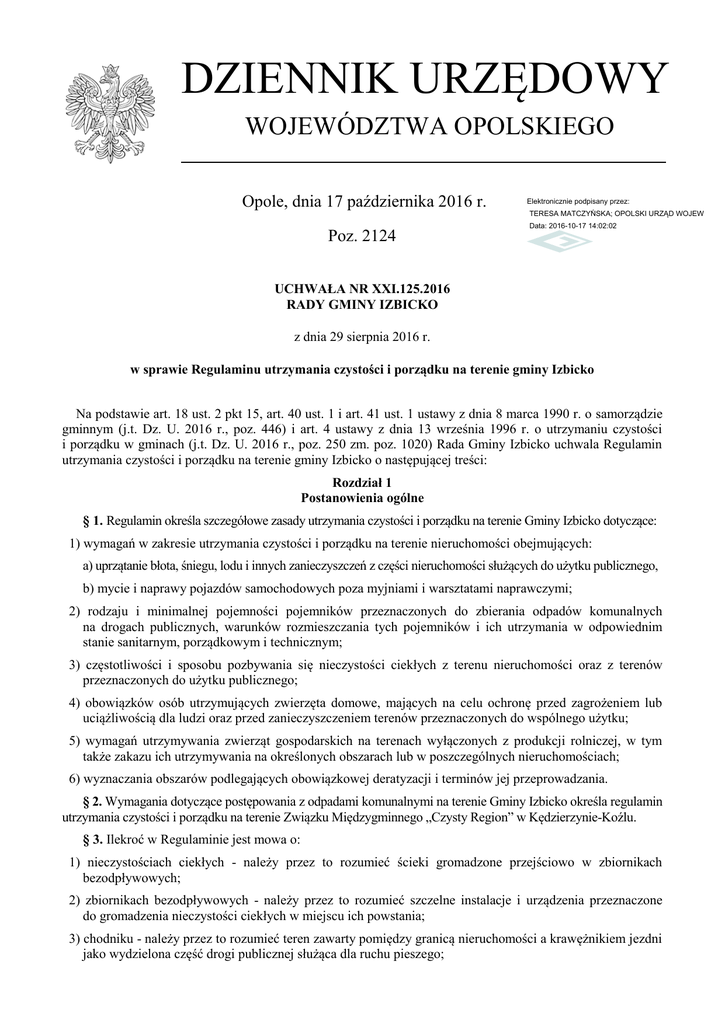 DZIENNIK URZĘDOWY WOJEWÓDZTWA OPOLSKIEGO Opole, dnia 17 października 2016 r. Elektronicznie podpisany przez: TERESA MATCZYŃSKA; OPOLSKI URZĄD WOJEWÓDZKI Poz. 2124 Data: 2016-10-17 14:02:02 UCHWAŁA NR XXI.125.2016 RADY GMINY IZBICKO z dnia 29 sierpnia 2016 r. w sprawie Regulaminu utrzymania czystości i porządku na terenie gminy Izbicko Na podstawie art. 18 ust. 2 pkt 15, art. 40 ust. 1 i art. 41 ust. 1 ustawy z dnia 8 marca 1990 r. o samorządzie gminnym (j.t. Dz. U. 2016 r., poz. 446) i art. 4 ustawy z dnia 13 września 1996 r. o utrzymaniu czystości i porządku w gminach (j.t. Dz. U. 2016 r., poz. 250 zm. poz. 1020) Rada Gminy Izbicko uchwala Regulamin utrzymania czystości i porządku na terenie gminy Izbicko o następującej treści: Rozdział 1 Postanowienia ogólne § 1. Regulamin określa szczegółowe zasady utrzymania czystości i porządku na terenie Gminy Izbicko dotyczące: 1) wymagań w zakresie utrzymania czystości i porządku na terenie nieruchomości obejmujących: a) uprzątanie błota, śniegu, lodu i innych zanieczyszczeń z części nieruchomości służących do użytku publicznego, b) mycie i naprawy pojazdów samochodowych poza myjniami i warsztatami naprawczymi; 2) rodzaju i minimalnej pojemności pojemników przeznaczonych do zbierania odpadów komunalnych na drogach publicznych, warunków rozmieszczania tych pojemników i ich utrzymania w odpowiednim stanie sanitarnym, porządkowym i technicznym; 3) częstotliwości i sposobu pozbywania się nieczystości ciekłych z terenu nieruchomości oraz z terenów przeznaczonych do użytku publicznego; 4) obowiązków osób utrzymujących zwierzęta domowe, mających na celu ochronę przed zagrożeniem lub uciążliwością dla ludzi oraz przed zanieczyszczeniem terenów przeznaczonych do wspólnego użytku; 5) wymagań utrzymywania zwierząt gospodarskich na terenach wyłączonych z produkcji rolniczej, w tym także zakazu ich utrzymywania na określonych obszarach lub w poszczególnych nieruchomościach; 6) wyznaczania obszarów podlegających obowiązkowej deratyzacji i terminów jej przeprowadzania. § 2. Wymagania dotyczące postępowania z odpadami komunalnymi na terenie Gminy Izbicko określa regulamin utrzymania czystości i porządku na terenie Związku Międzygminnego „Czysty Region” w Kędzierzynie-Koźlu. § 3. Ilekroć w Regulaminie jest mowa o: 1) nieczystościach ciekłych - należy przez to rozumieć ścieki gromadzone przejściowo w zbiornikach bezodpływowych; 2) zbiornikach bezodpływowych - należy przez to rozumieć szczelne instalacje i urządzenia przeznaczone do gromadzenia nieczystości ciekłych w miejscu ich powstania; 3) chodniku - należy przez to rozumieć teren zawarty pomiędzy granicą nieruchomości a krawężnikiem jezdni jako wydzielona część drogi publicznej służąca dla ruchu pieszego; Dziennik Urzędowy Województwa Opolskiego –2– Poz. 2124 4) zwierzętach domowych - należy przez to rozumieć zwierzęta przebywające wraz z człowiekiem w jego domu lub innym odpowiednim pomieszczeniu, utrzymywane przez człowieka w charakterze jego towarzysza, a w szczególności: psy, koty, ptaki egzotyczne, chomiki, świnki morskie, ryby i żółwie hodowane w akwarium oraz inne zwierzęta uznane za nadające się do trzymania w mieszkaniach w celach niehodowlanych; 5) zwierzętach gospodarskich - należy przez to rozumieć zwierzęta utrzymywane w celach hodowlanych i produkcyjnych, takie jak: koniowate, bydło, jeleniowate, drób, świnie, owce, kozy, pszczoły i zwierzęta futerkowe; 6) budynkach mieszkalnych jednorodzinnych - należy przez to rozumieć budynek wolnostojący albo budynek w zabudowie bliźniaczej, szeregowej lub grupowej, służący zaspokajaniu potrzeb mieszkaniowych, stanowiący konstrukcyjnie samodzielną całość, w którym dopuszcza się wydzielenie nie więcej niż dwóch lokali mieszkalnych albo jednego lokalu mieszkalnego i lokalu użytkowego o powierzchni całkowitej nieprzekraczającej 30% powierzchni całkowitej budynku; 7) budynkach użyteczności publicznej - należy przez to rozumieć budynki przeznaczone do wykonywania funkcji administracji państwowej i samorządowej, wymiaru sprawiedliwości, kultury, kultu religijnego, oświaty, nauki, służby zdrowia, opieki społecznej i socjalnej, obsługi bankowej, handlu, gastronomii, usług, turystyki, sportu, obsługi pasażerów w transporcie kolejowym, drogowym, lotniczym i wodnym, poczty i telekomunikacji oraz inne ogólnodostępne budynki przeznaczone do wykonywania podobnych funkcji. Rozdział 2 Wymagania w zakresie utrzymania czystości i porządku na terenie nieruchomości § 4. Właściciele nieruchomości zapewniają utrzymanie czystości i porządku na terenie nieruchomości poprzez: 1) utrzymanie czystości, porządku oraz należytego stanu sanitarno-higienicznego nieruchomości, w tym również nieruchomości niezabudowanych, pielęgnowanie zieleni i usuwanie chwastów porastających na tych nieruchomościach, utrzymanie w estetycznym wyglądzie budynków i ich otoczenia; 2) uprzątnięcie błota, śniegu, lodu, liści i innych zanieczyszczeń z chodników przylegających bezpośrednio do nieruchomości; gromadzenie na skraju chodnika od strony jezdni błota, śniegu i lodu uprzątniętego z chodników położonych wzdłuż nieruchomości, w sposób niezagrażający bezpieczeństwu przechodniów i pojazdów oraz nieutrudniający ruchu, z zachowaniem możliwości odpływu wody do kanalizacji; właściciel nieruchomości nie jest obowiązany do uprzątania chodnika, na którym dopuszczone jest parkowanie pojazdów samochodowych. § 5.1. Mycie pojazdów samochodowych poza myjniami jest dopuszczalne na terenie własnej posesji, gdy nie spowoduje zanieczyszczenia środowiska, przy użyciu środków ulegających biodegradacji, i gdy odbywa się przy jednoczesnym zabezpieczeniu zużytej wody przed spływem na tereny sąsiednich posesji lub tereny publiczne. 2. Drobne naprawy pojazdów samoch