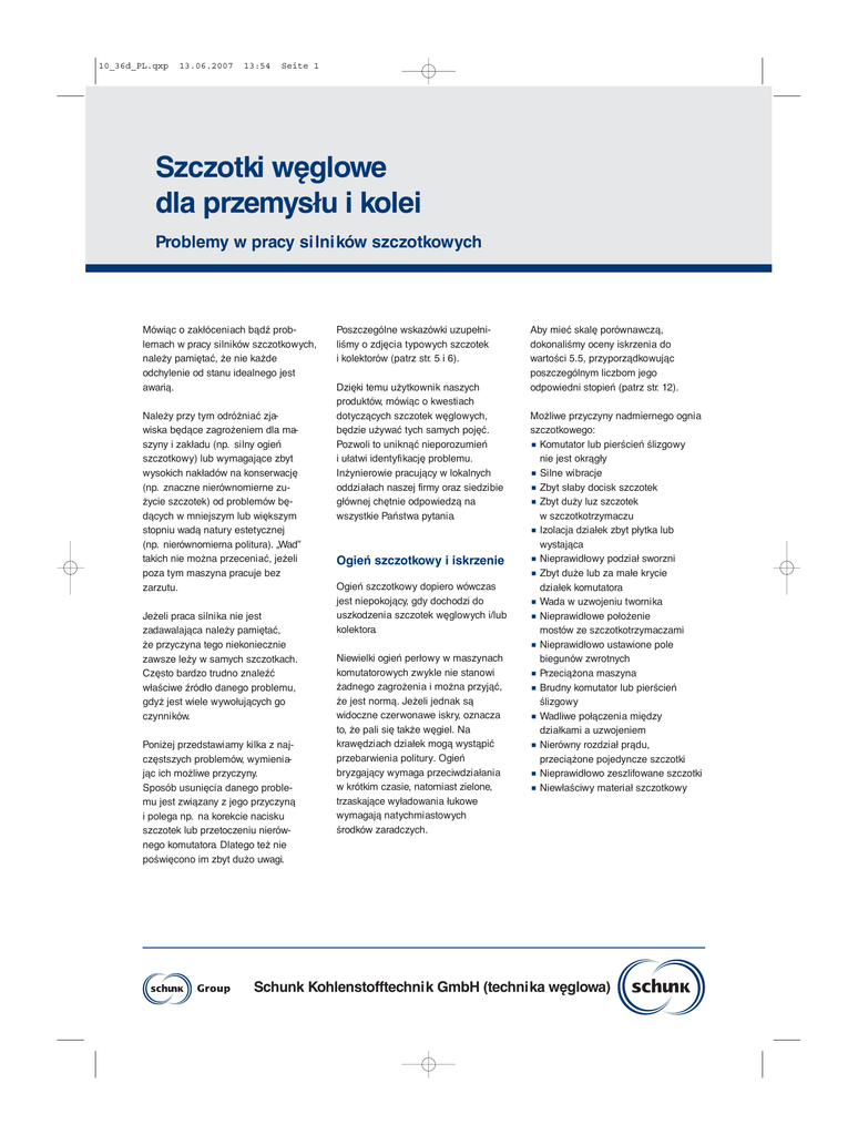 10_36d_PL.qxp 13.06.2007 13:54 Seite 1 Szczotki węglowe dla przemysłu i kolei Problemy w pracy silników szczotkowych Mówiąc o zakłóceniach bądź problemach w pracy silników szczotkowych, należy pamiętać, że nie każde odchylenie od stanu idealnego jest awarią. Należy przy tym odróżniać zjawiska będące zagrożeniem dla maszyny i zakładu (np. silny ogień szczotkowy) lub wymagające zbyt wysokich nakładów na konserwację (np. znaczne nierównomierne zużycie szczotek) od problemów będących w mniejszym lub większym stopniu wadą natury estetycznej (np. nierównomierna politura). „Wad” takich nie można przeceniać, jeżeli poza tym maszyna pracuje bez zarzutu. Jeżeli praca silnika nie jest zadawalająca należy pamiętać, że przyczyna tego niekoniecznie zawsze leży w samych szczotkach. Często bardzo trudno znaleźć właściwe źródło danego problemu, gdyż jest wiele wywołujących go czynników. Poniżej przedstawiamy kilka z najczęstszych problemów, wymieniając ich możliwe przyczyny. Sposób usunięcia danego problemu jest związany z jego przyczyną i polega np. na korekcie nacisku szczotek lub przetoczeniu nierównego komutatora. Dlatego też nie poświęcono im zbyt dużo uwagi. Poszczególne wskazówki uzupełniliśmy o zdjęcia typowych szczotek i kolektorów (patrz str. 5 i 6). Dzięki temu użytkownik naszych produktów, mówiąc o kwestiach dotyczących szczotek węglowych, będzie używać tych samych pojęć. Pozwoli to uniknąć nieporozumień i ułatwi identyfikację problemu. Inżynierowie pracujący w lokalnych oddziałach naszej firmy oraz siedzibie głównej chętnie odpowiedzą na wszystkie Państwa pytania. Ogień szczotkowy i iskrzenie Ogień szczotkowy dopiero wówczas jest niepokojący, gdy dochodzi do uszkodzenia szczotek węglowych i/lub kolektora. Niewielki ogień perłowy w maszynach komutatorowych zwykle nie stanowi żadnego zagrożenia i można przyjąć, że jest normą. Jeżeli jednak są widoczne czerwonawe iskry, oznacza to, że pali się także węgiel. Na krawędziach działek mogą wystąpić przebarwienia politury. Ogień bryzgający wymaga przeciwdziałania w krótkim czasie, natomiast zielone, trzaskające wyładowania łukowe wymagają natychmiastowych środków zaradczych. Aby mieć skalę porównawczą, dokonaliśmy oceny iskrzenia do wartości 5.5, przyporządkowując poszczególnym liczbom jego odpowiedni stopień (patrz str. 12). Możliwe przyczyny nadmiernego ognia szczotkowego: • Komutator lub pierścień ślizgowy nie jest okrągły • Silne wibracje • Zbyt słaby docisk szczotek • Zbyt duży luz szczotek w szczotkotrzymaczu • Izolacja działek zbyt płytka lub wystająca • Nieprawidłowy podział sworzni • Zbyt duże lub za małe krycie działek komutatora • Wada w uzwojeniu twornika • Nieprawidłowe położenie mostów ze szczotkotrzymaczami • Nieprawidłowo ustawione pole biegunów zwrotnych • Przeciążona maszyna • Brudny komutator lub pierścień ślizgowy • Wadliwe połączenia między działkami a uzwojeniem • Nierówny rozdział prądu, przeciążone pojedyncze szczotki • Nieprawidłowo zeszlifowane szczotki • Niewłaściwy materiał szczotkowy Schunk Kohlenstofftechnik GmbH (technika węglowa) 10_36d_PL.qxp 13.06.2007 13:54 Seite 2 Problemy w pracy silników szczotkowych Zbyt duże i nierównomierne zużycie szczotek węglowych Jak już wspomniano, bez dokładnej znajomości warunków eksploatacji trudno jednoznacznie stwierdzić, które zużycie (utrata długości w czasie) należy uznać za normalne, a które za nadmierne. Dla użytkownika szczotek węglowych pożądane byłoby zużycie minimalne, gdyż dzięki temu wydłużyłyby się okresy konserwacji, zmniejszyłoby się zanieczyszczenie maszyny, a koszty jej utrzymania byłyby niższe. Zbyt małe zużycie mogłoby jednak w dłuższym okresie czasu spowodować inny problem, gdyż w wyniku zmniejszonego tarcia na szczotkach powstałyby gładkie i szczelne powierzchnie ślizgowe, które przy większych prędkościach obwodowych powodowałyby efekty aerodynamiczne i zakłócenia styku. Niższe prędkości obwodowe i gładkie powierzchnie ślizgowe mogłyby natomiast w niekorzystnych warunkach powodować tarcie statyczne, a tym samym wibracje szczotek węglowych. Aby przepływ prądu był zapewniony, wymagana jest minimalna liczba pól kontaktowych, które w wyniku ślizgu ulegają naturalnemu zużyciu. Stopień tego zużycia zależy od panujących warunków eksploatacji, otoczenia oraz materiału użytego do produkcji szczotek węglowych. Ze względu na wpływ wielu czynników jednoznaczna ocena zużycia jest bardzo trudna lub wręcz niemożliwa. przypadku maszyn stacjonarnych mieści się zwykle w zakresie 2 – 7 mm/1000 h. Jeżeli długość szczotki podlegająca zużyciu wynosi np. 20 mm, daje to trwałość w zakresie od 2900 do 10 000 godzin. W przypadku urządzeń trakcyjnych zużycie liczy się zwykle w mm na 1000 przejechanych kilometrów. Jako normalne, w zależności od obciążenia, należy traktować zużycie rzędu 0,2 – 0,35 mm/1000 km. Nierównomierne zużycie szczotek ma miejsce, gdy po dłuższym okresie eksploatacji wystąpią duże różnice długości pomiędzy szczotkami. Nieznaczne różnice, np. < 10 % długości podlegającej zużyciu, należy uznać za normalne. Nadmierne bądź nierównomierne zużycie może być skutkiem następujących czynników: • Komutator lub pierścień ślizgowy nie jest okrągły • Niejednolity komutator lub pierścień ślizgowy • Obecność oleju lub innych zanieczyszczeń • Zapylone powietrze • Wystająca mika • Wibracje • Obecność w powietrzu żrących gazów lub oparów • Zbyt niska wilgotność powietrza • Niewłaściwa komutacja • Przeciążona maszyna • Nierównomierny lub zbyt słaby docisk szczotek • Nierówny rozdział prądu • Różne typy szczotek • Szczotki niewłaściwego typu. W zależności od obciążenia, 