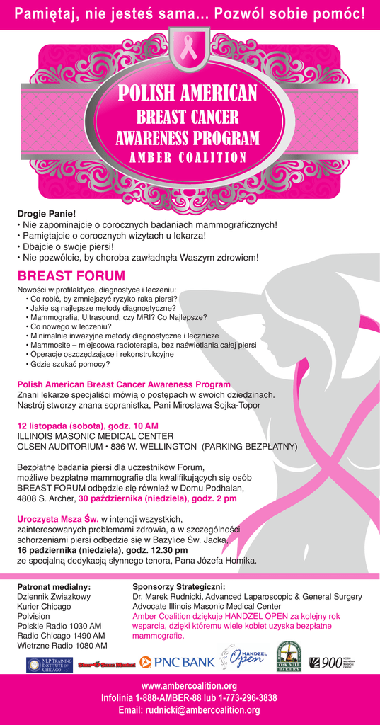Pamiętaj, nie jesteś sama... Pozwól sobie pomóc! Polish AmericAn BreAst cAncer AwAreness ProgrAm AmBer coAlition Drogie Panie! • Nie zapominajcie o corocznych badaniach mammograficznych! • Pamiętajcie o corocznych wizytach u lekarza! • Dbajcie o swoje piersi! • Nie pozwólcie, by choroba zawładnęła Waszym zdrowiem! BREAST FORUM Nowości w profilaktyce, diagnostyce i leczeniu: • Co robić, by zmniejszyć ryzyko raka piersi? • Jakie są najlepsze metody diagnostyczne? • Mammografia, Ultrasound, czy MRI? Co Najlepsze? • Co nowego w leczeniu? • Minimalnie inwazyjne metody diagnostyczne i lecznicze • Mammosite – miejscowa radioterapia, bez naświetlania całej piersi • Operacje oszczędzające i rekonstrukcyjne • Gdzie szukać pomocy? Polish American Breast Cancer Awareness Program Znani lekarze specjaliści mówią o postępach w swoich dziedzinach. Nastrój stworzy znana sopranistka, Pani Miroslawa Sojka-Topor 12 listopada (sobota), godz. 10 AM ILLINOIS MASONIC MEDICAL CENTER OLSEN AUDITORIUM • 836 W. WELLINGTON (PARKING BEZPŁATNY) Bezpłatne badania piersi dla uczestników Forum, możliwe bezpłatne mammografie dla kwalifikujących się osόb BREAST FORUM odbędzie się rόwnież w Domu Podhalan, 4808 S. Archer, 30 października (niedziela), godz. 2 pm Uroczysta Msza Św. w intencji wszystkich, zainteresowanych problemami zdrowia, a w szczególności schorzeniami piersi odbędzie się w Bazylice Św. Jacka, 16 padziernika (niedziela), godz. 12.30 pm ze specjalną dedykacją słynnego tenora, Pana Józefa Homika. Patronat medialny: Dziennik Zwiazkowy Kurier Chicago Polvision Polskie Radio 1030 AM Radio Chicago 1490 AM Wietrzne Radio 1080 AM Sponsorzy Strategiczni: Dr. Marek Rudnicki, Advanced Laparoscopic & General Surgery Advocate Illinois Masonic Medical Center Amber Coalition dziękuje HANDZEL OPEN za kolejny rok wsparcia, dzięki któremu wiele kobiet uzyska bezpłatne mammografie. www.ambercoalition.org Infolinia 1-888-AMBER-88 lub 1-773-296-3838 Email: [email protected]